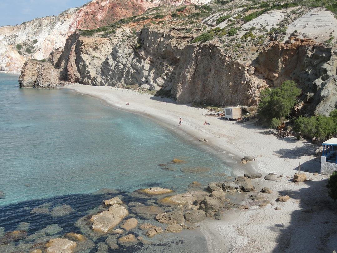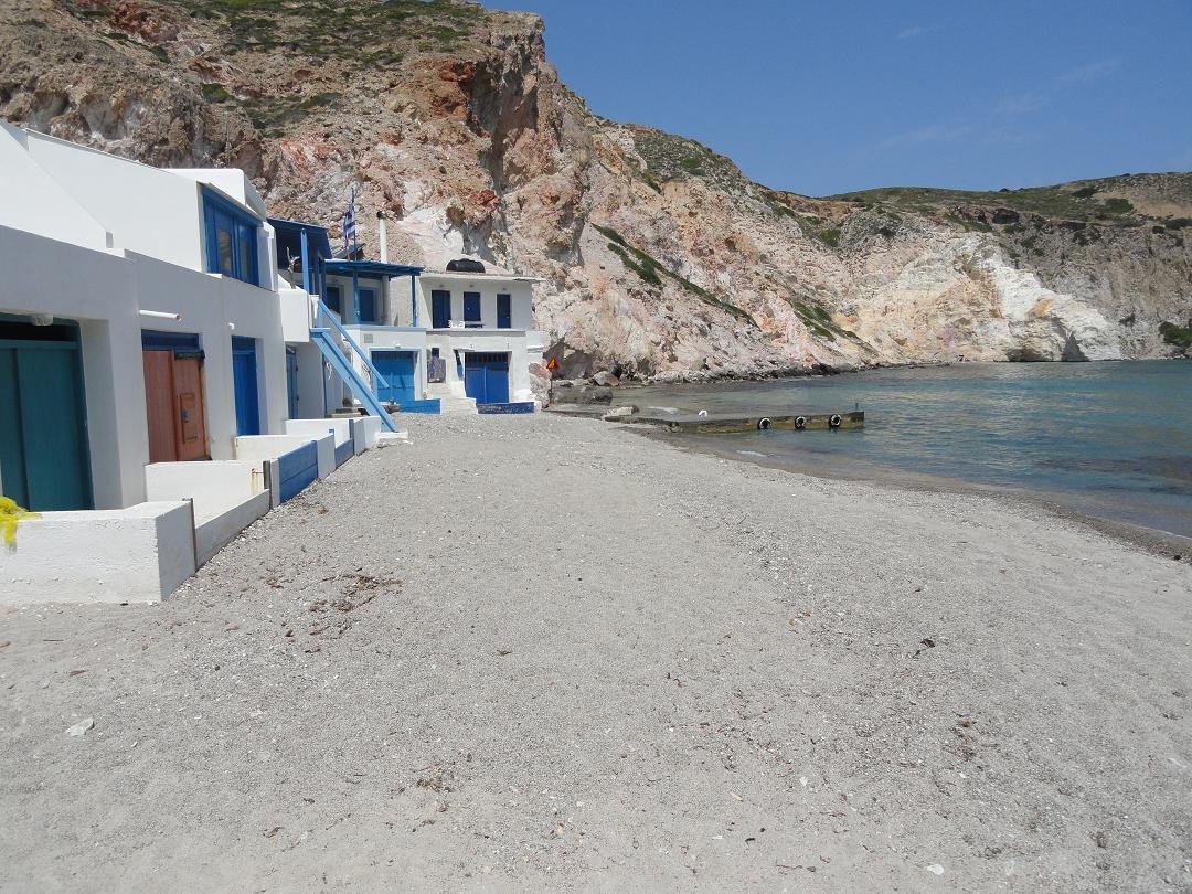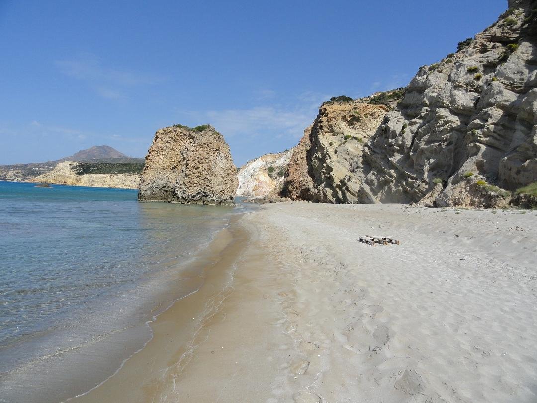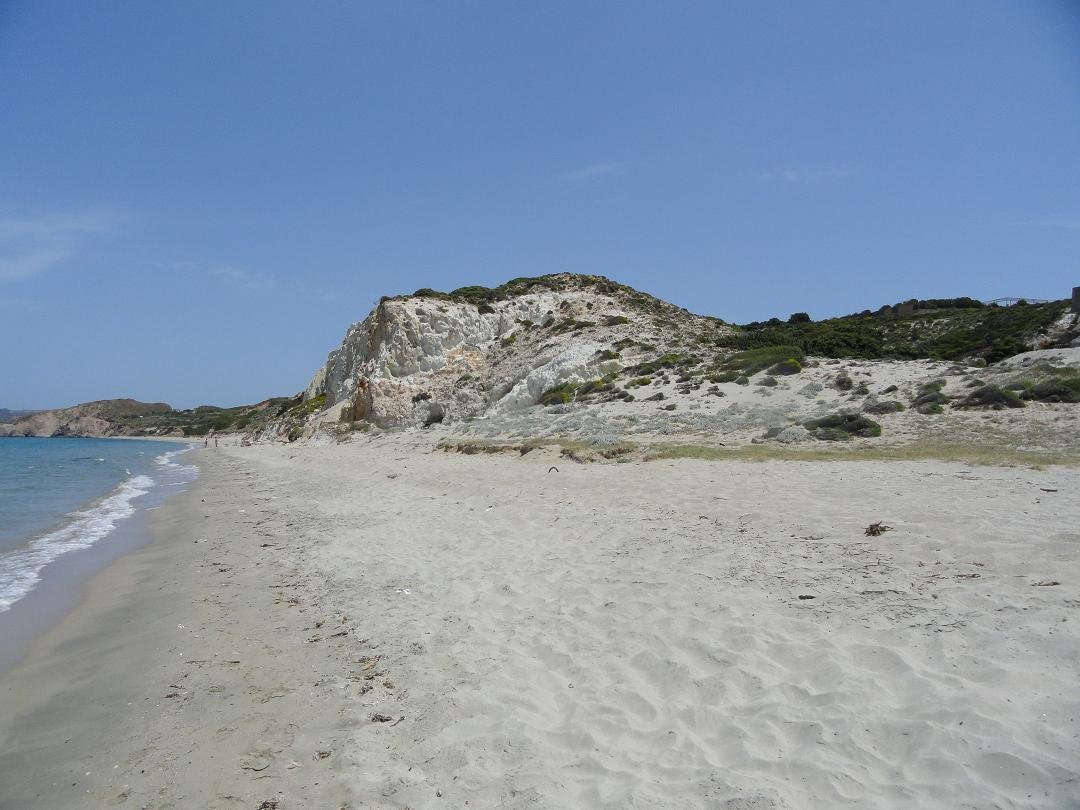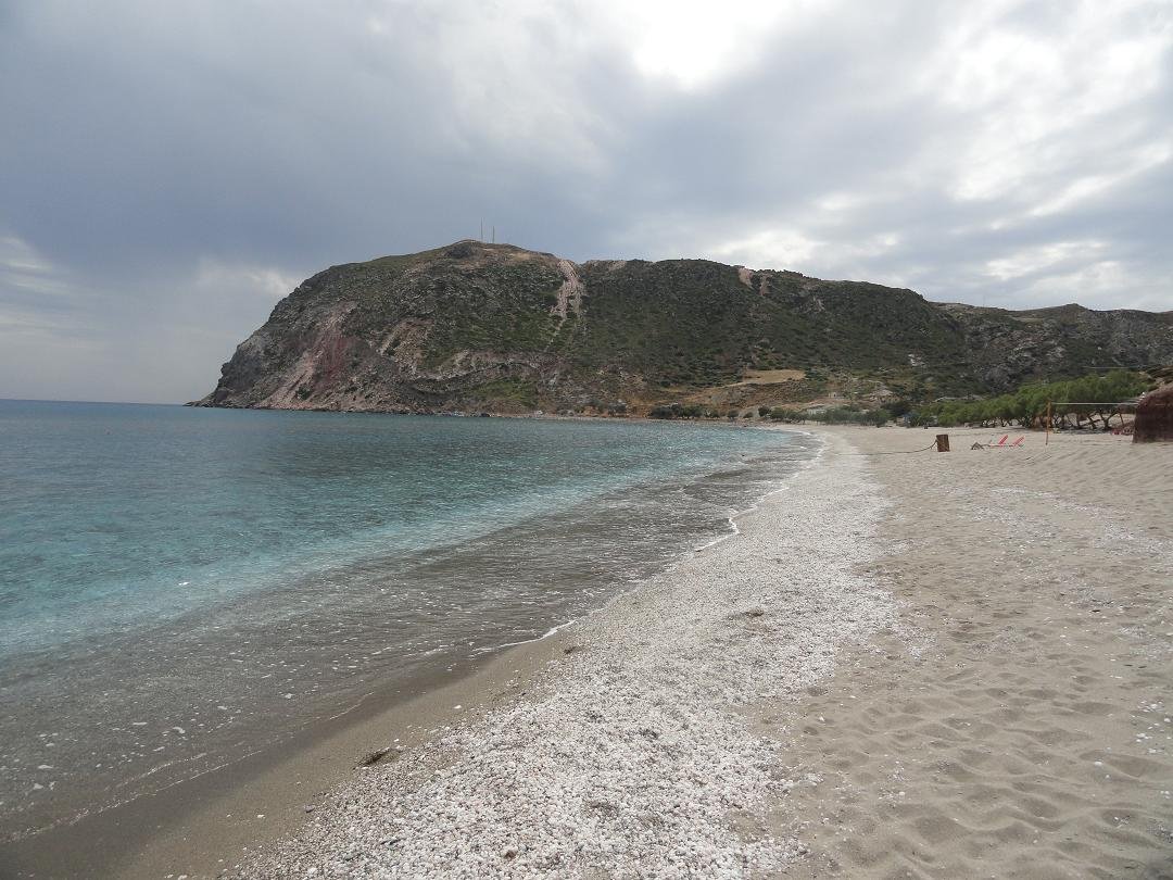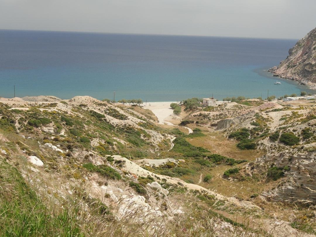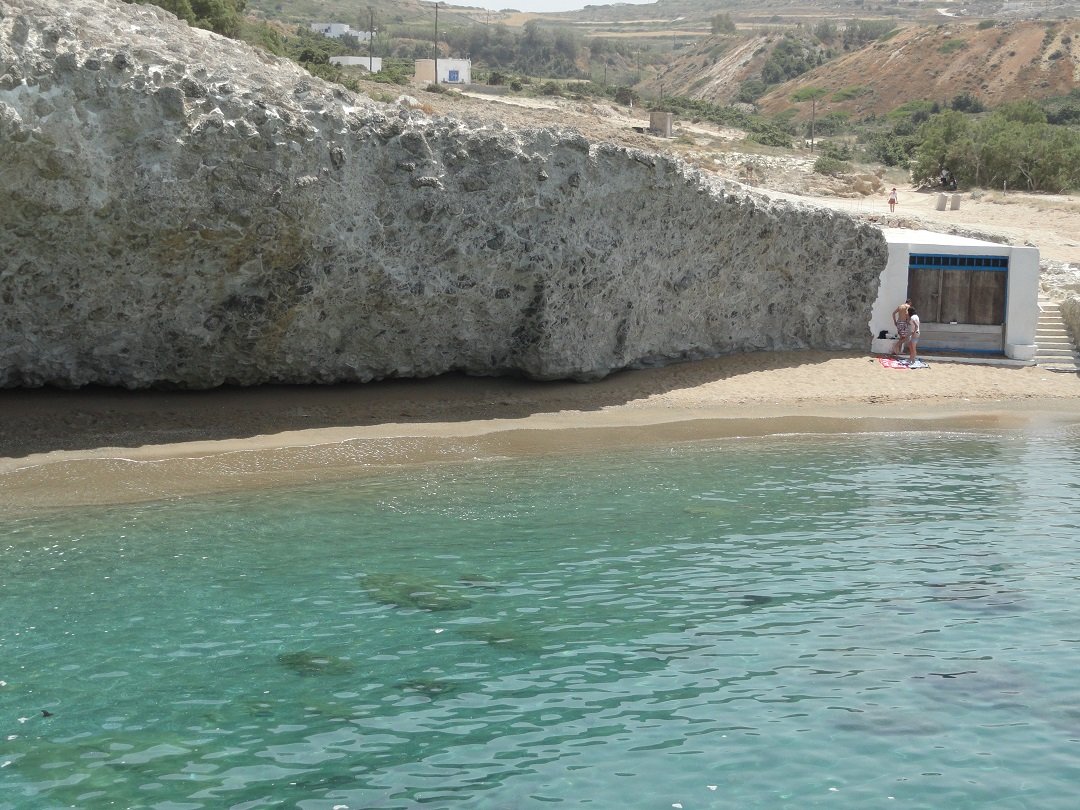 Strand naast de opgraving van Phylakopi , tussen Phylakopi en Pollonia en op ongeveer 3 kilometer afstand van Pollonia. Het is een van de meest bijzondere stranden van het eiland Milos. Je kunt er komen over een smal pad. Vanaf de top van de rots ziet het strand eruit als een turqoise zwembad (kanaal) met hoge witte rotsen eromheen, en er zijn grotten. Op de dag dat wij er kwamen helaas een beetje somber weer, dus het water was wat minder mooi van kleur als normaal. |