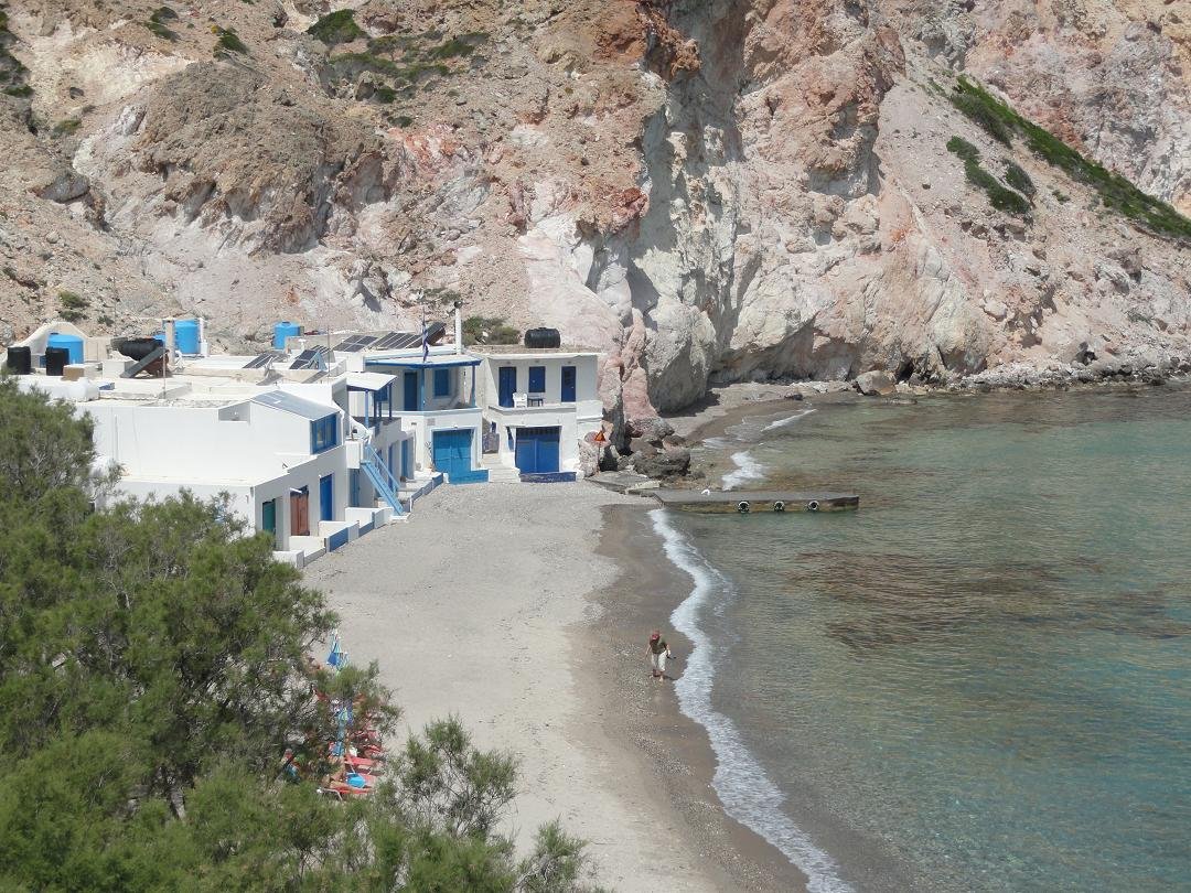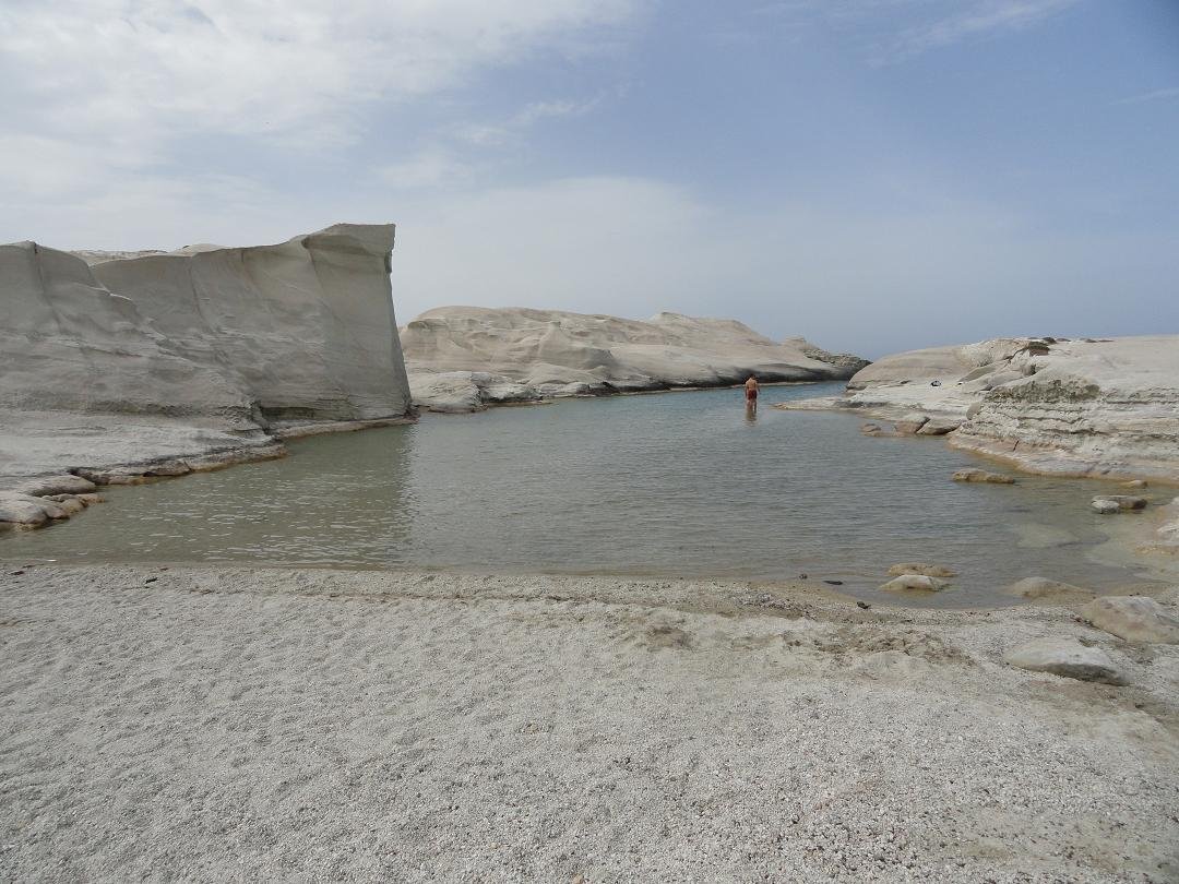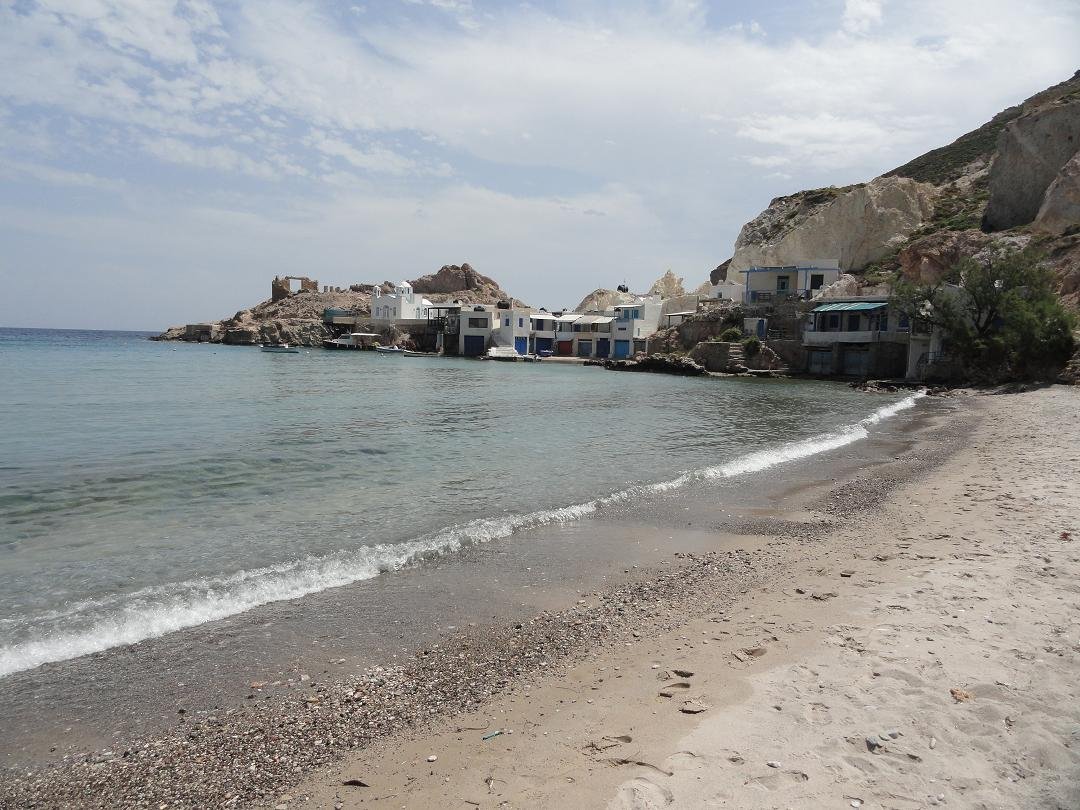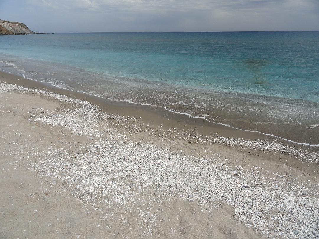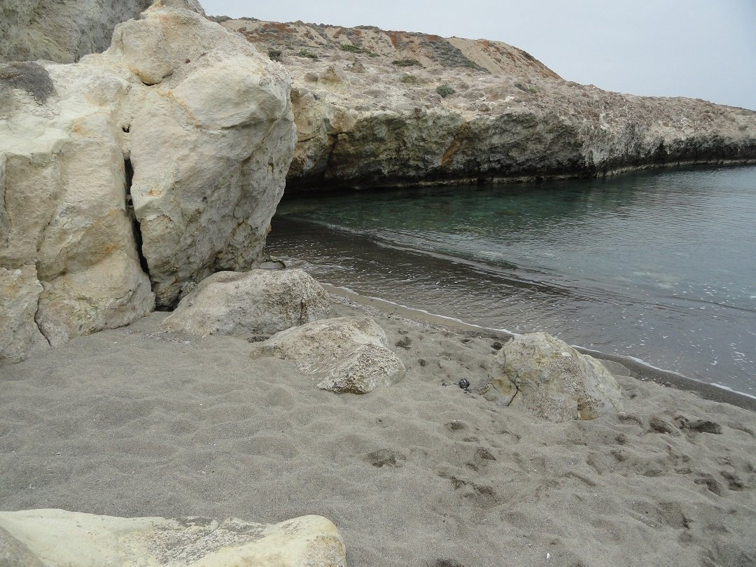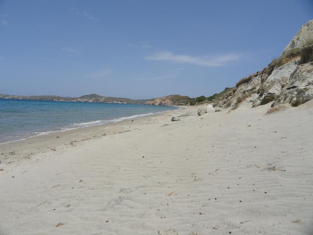 Strand naast de opgraving van Phylakopi , tussen Phylakopi en Pollonia en op ongeveer 3 kilometer afstand van Pollonia. Het is een van de meest bijzondere stranden van het eiland Milos. Je kunt er komen over een smal pad. Vanaf de top van de rots ziet het strand eruit als een turqoise zwembad (kanaal) met hoge witte rotsen eromheen, en er zijn grotten. Op de dag dat wij er kwamen helaas een beetje somber weer, dus het water was wat minder mooi van kleur als normaal. |