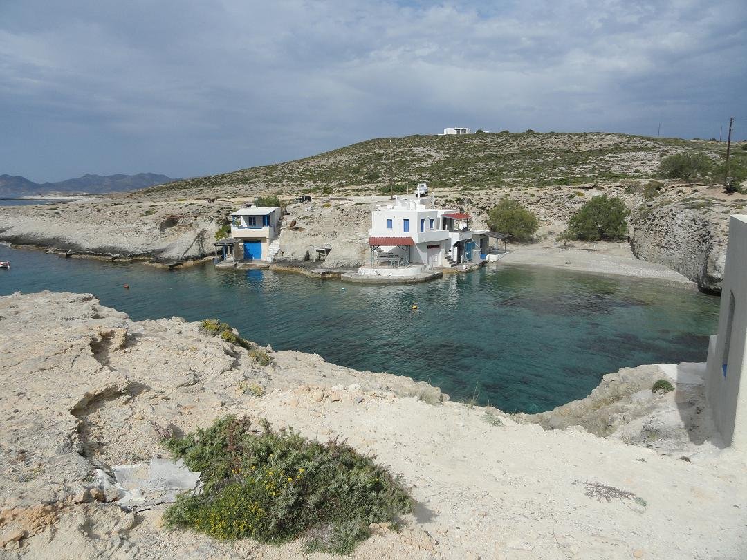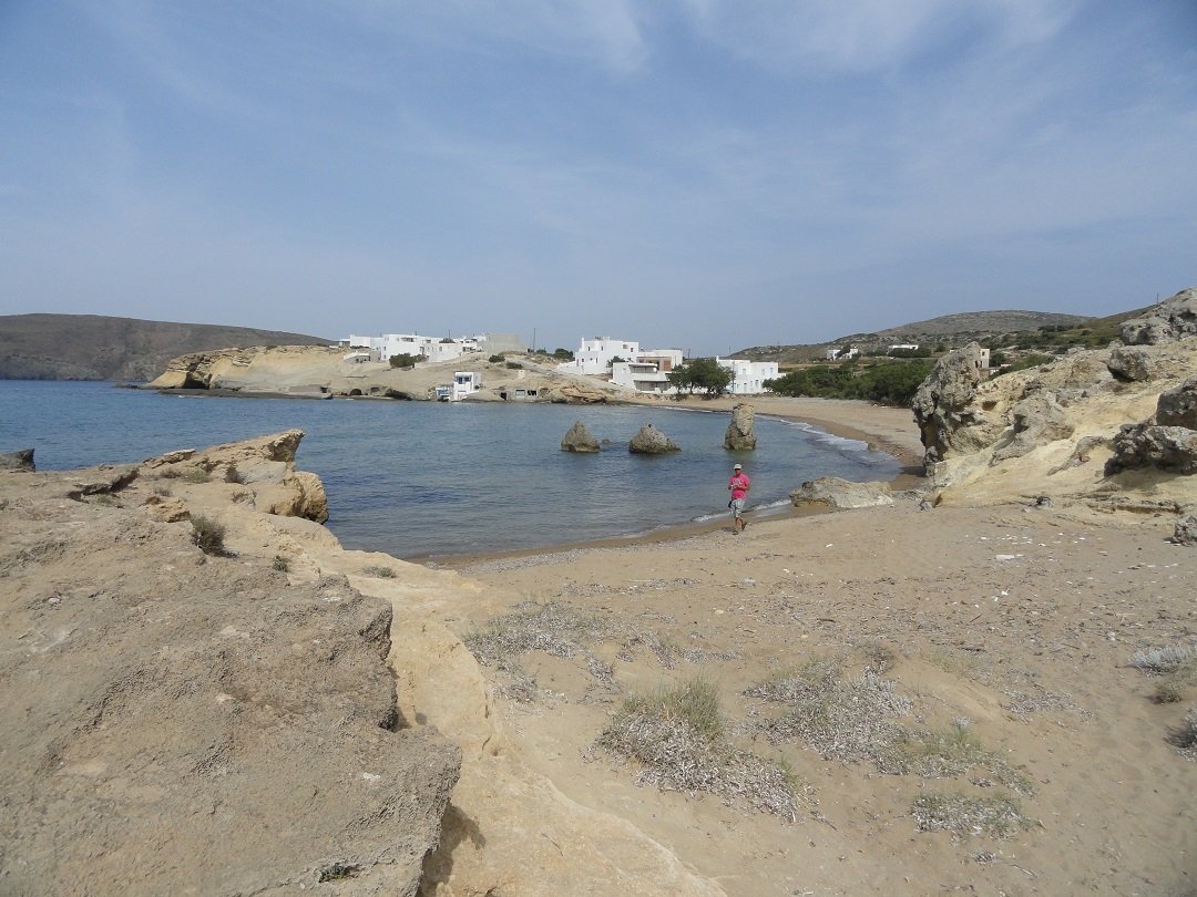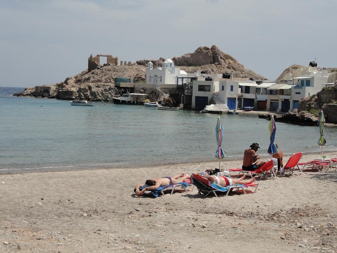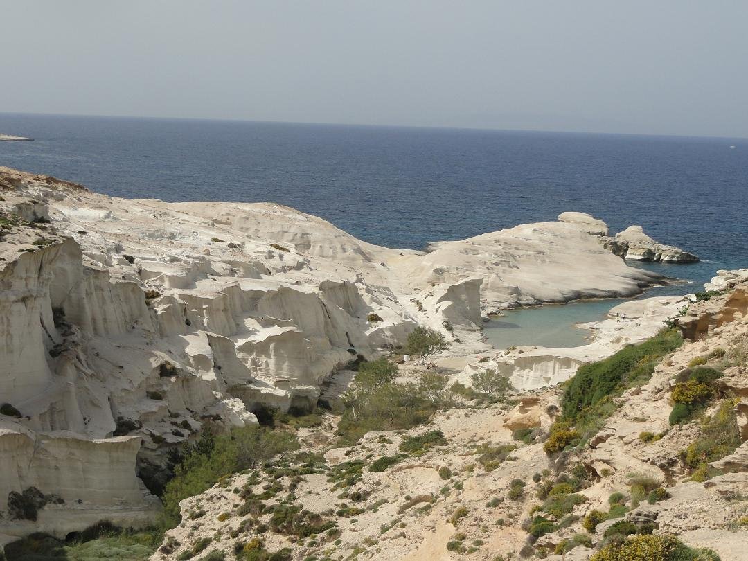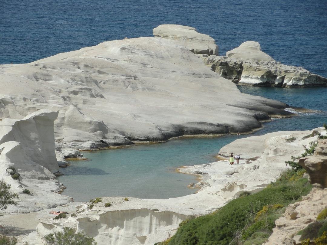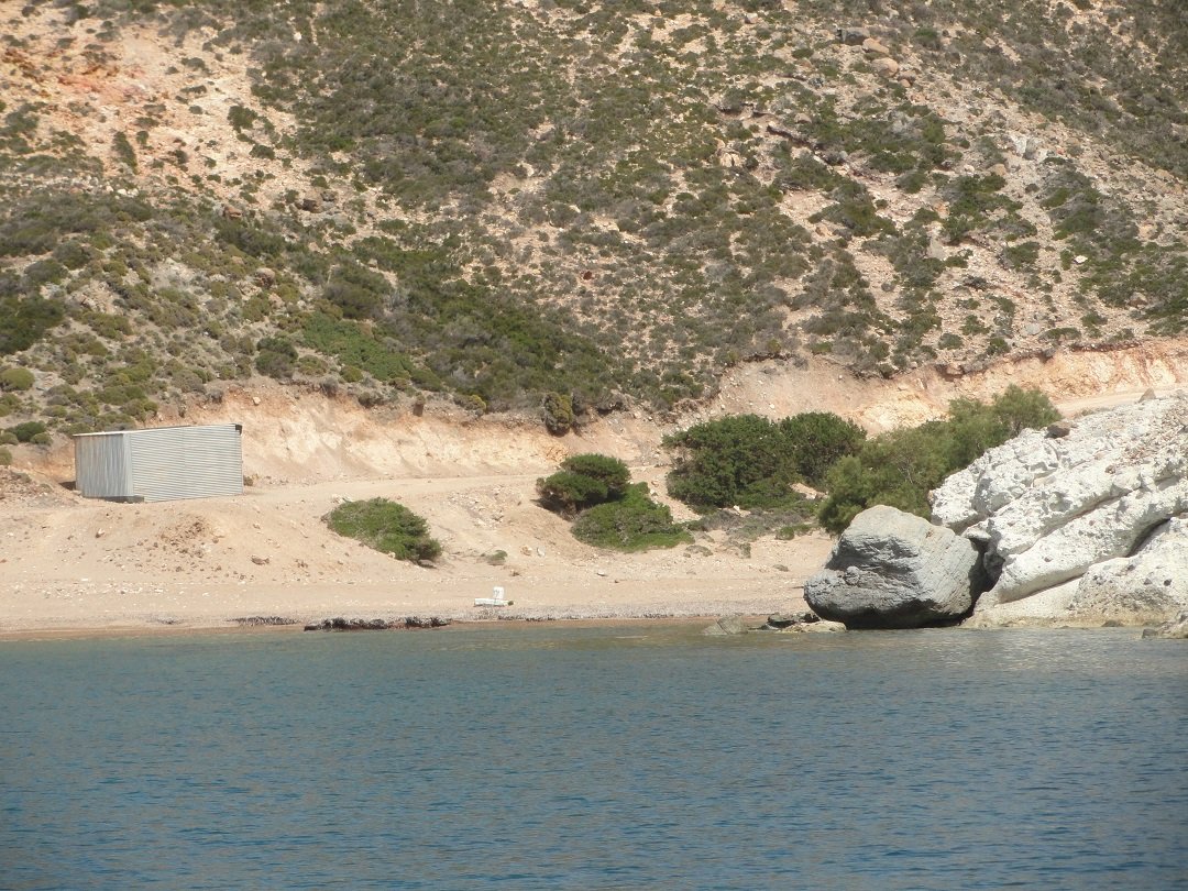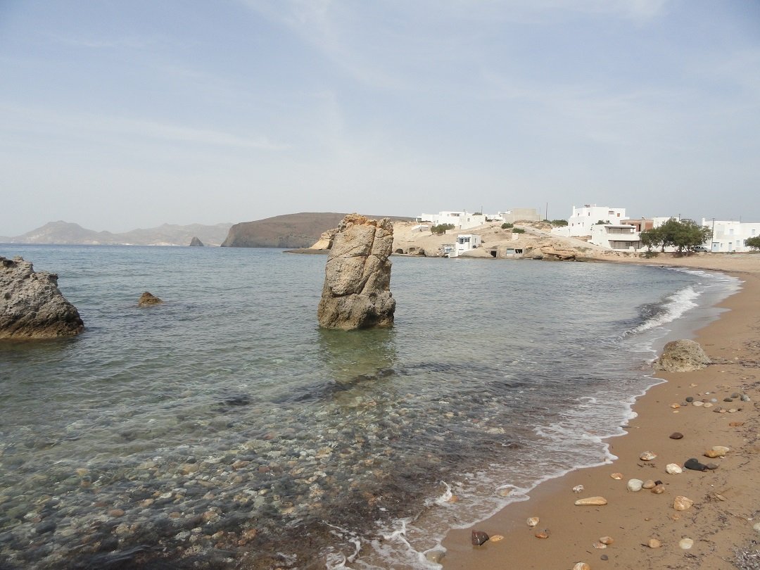 Strand naast de opgraving van Phylakopi , tussen Phylakopi en Pollonia en op ongeveer 3 kilometer afstand van Pollonia. Het is een van de meest bijzondere stranden van het eiland Milos. Je kunt er komen over een smal pad. Vanaf de top van de rots ziet het strand eruit als een turqoise zwembad (kanaal) met hoge witte rotsen eromheen, en er zijn grotten. Op de dag dat wij er kwamen helaas een beetje somber weer, dus het water was wat minder mooi van kleur als normaal. |