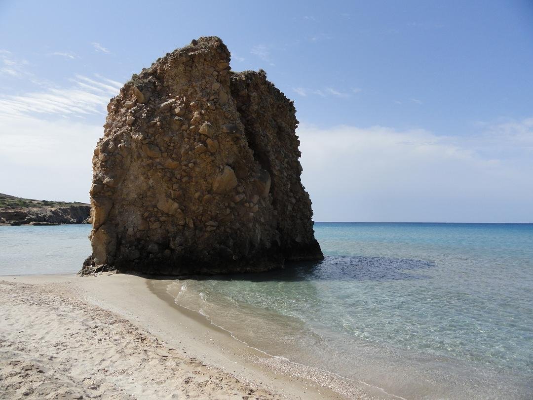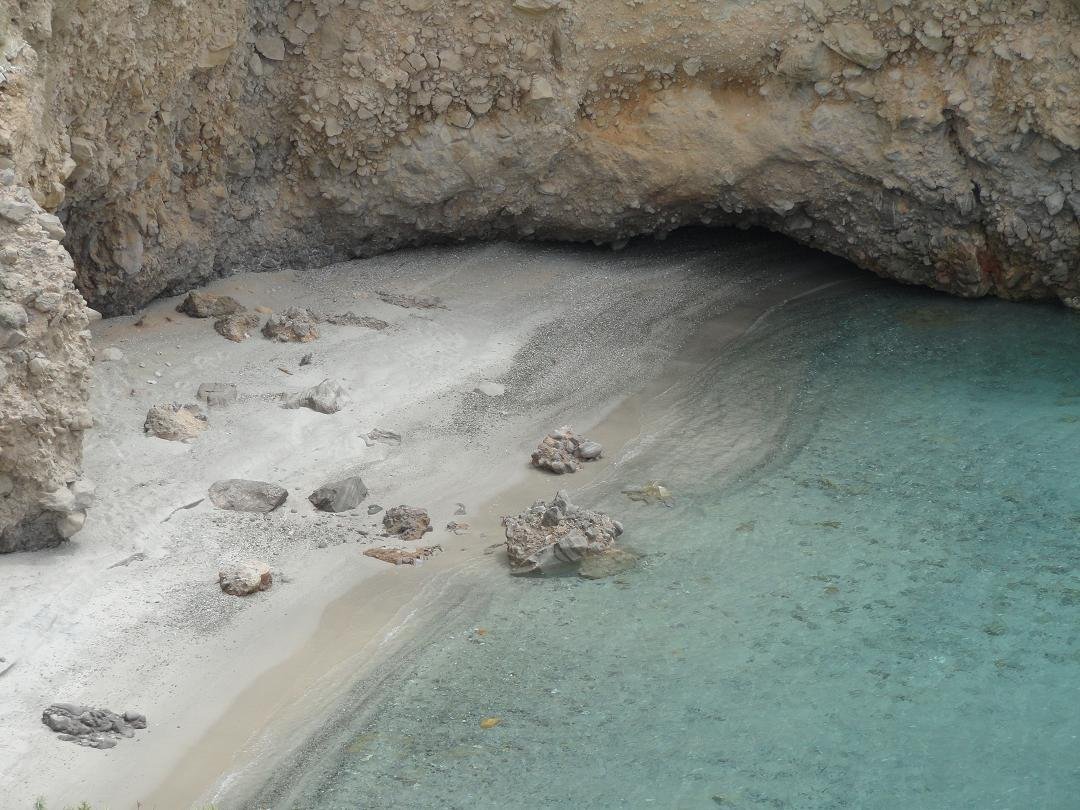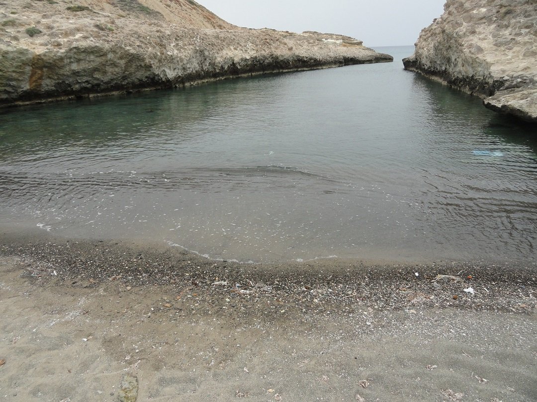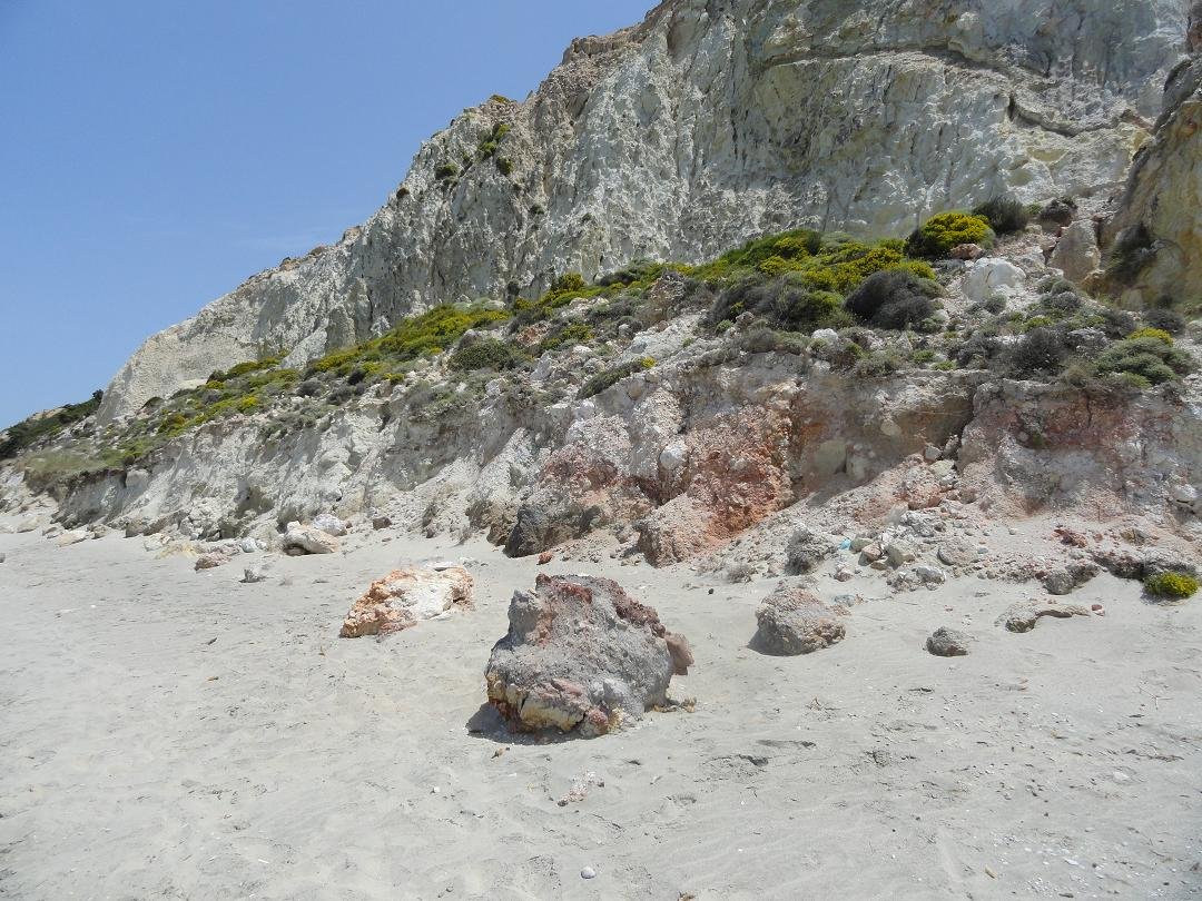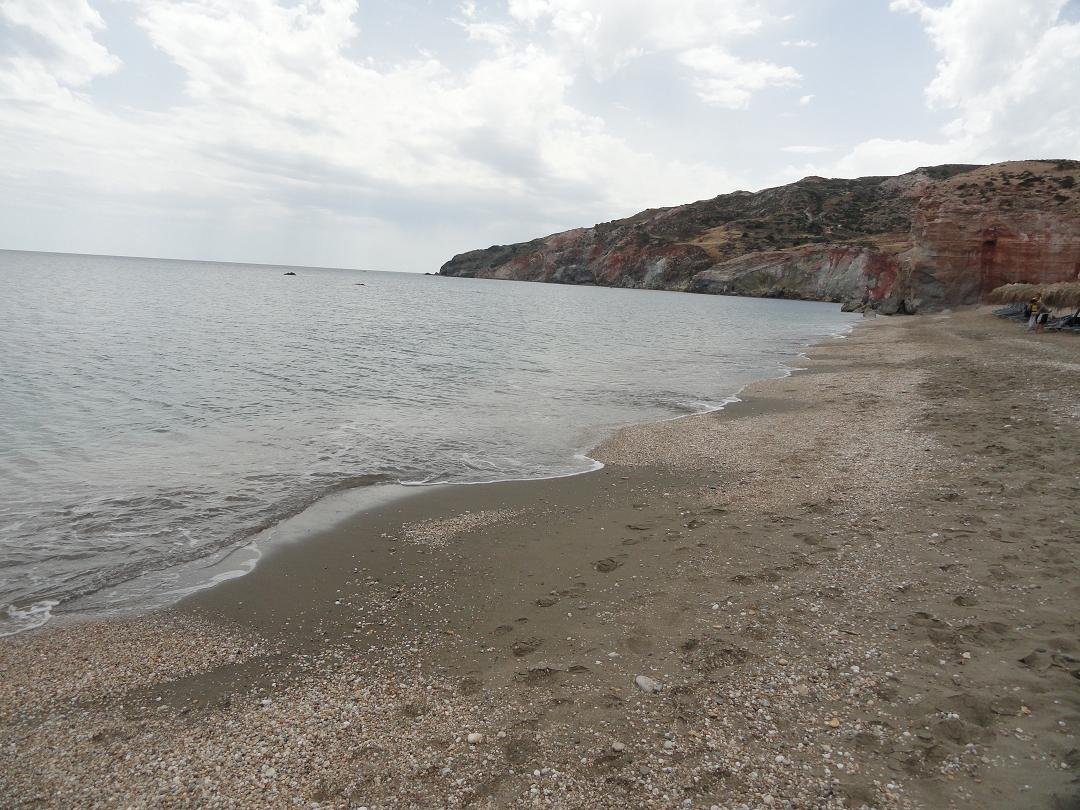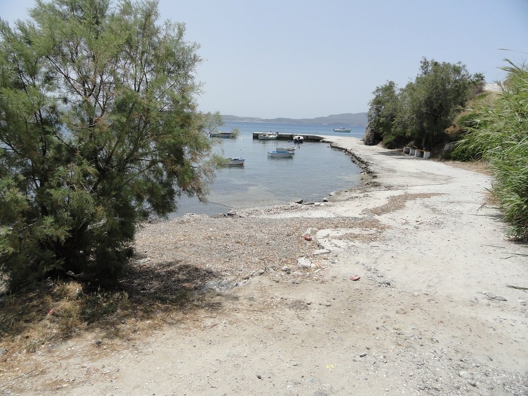 Strand naast de opgraving van Phylakopi , tussen Phylakopi en Pollonia en op ongeveer 3 kilometer afstand van Pollonia. Het is een van de meest bijzondere stranden van het eiland Milos. Je kunt er komen over een smal pad. Vanaf de top van de rots ziet het strand eruit als een turqoise zwembad (kanaal) met hoge witte rotsen eromheen, en er zijn grotten. Op de dag dat wij er kwamen helaas een beetje somber weer, dus het water was wat minder mooi van kleur als normaal. |