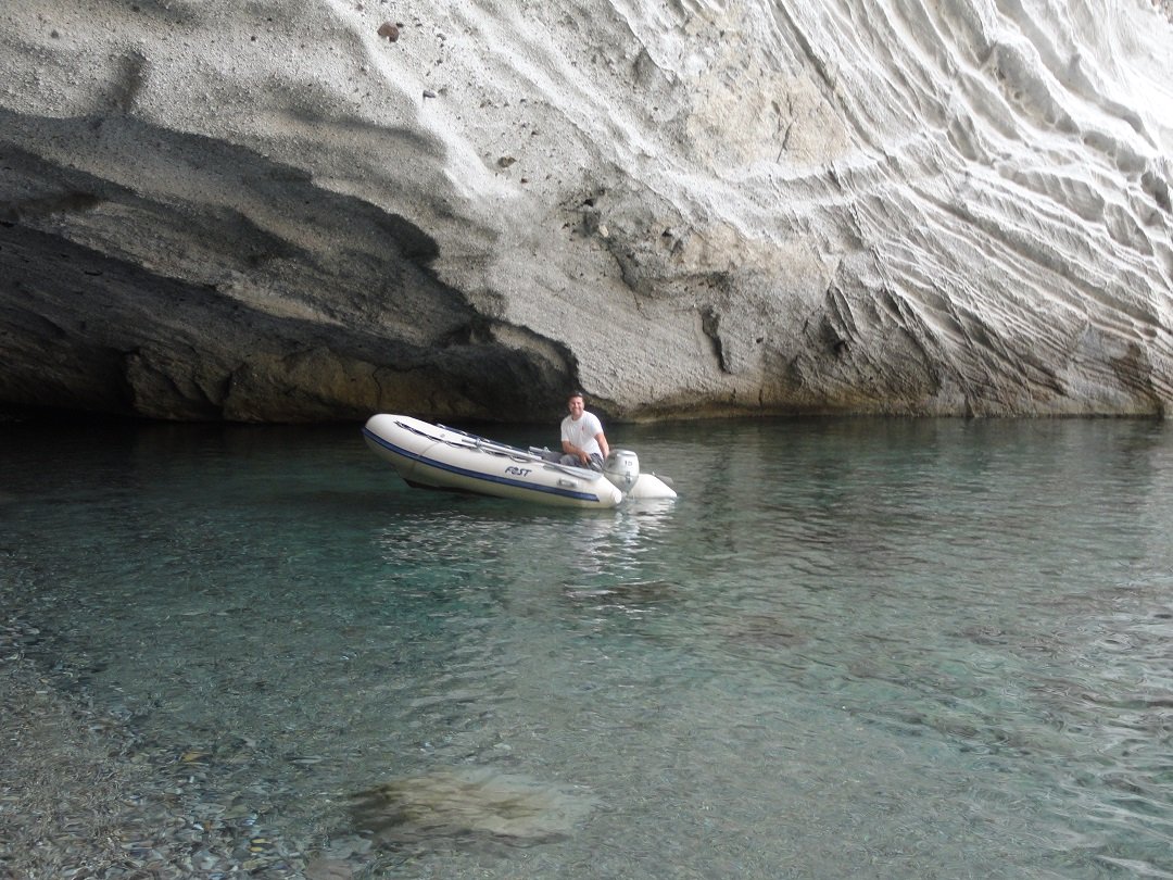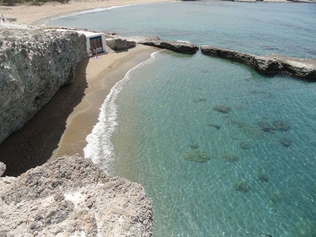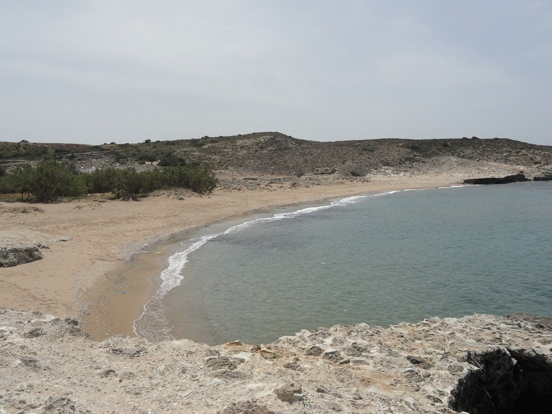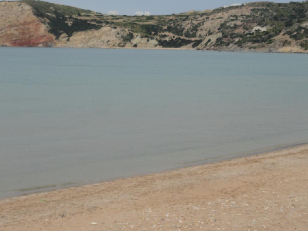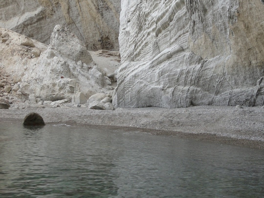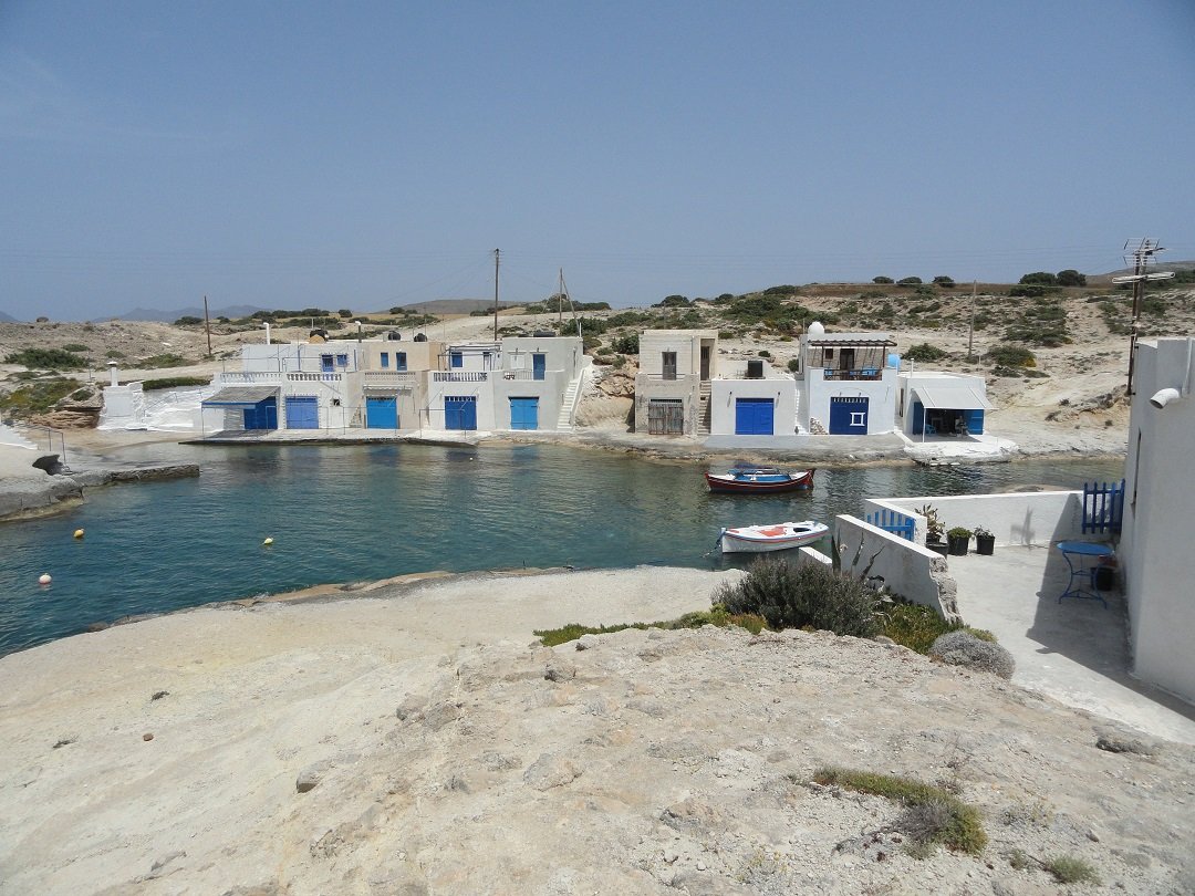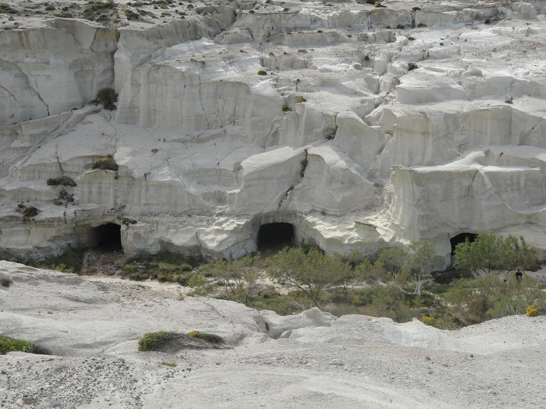 Strand naast de opgraving van Phylakopi , tussen Phylakopi en Pollonia en op ongeveer 3 kilometer afstand van Pollonia. Het is een van de meest bijzondere stranden van het eiland Milos. Je kunt er komen over een smal pad. Vanaf de top van de rots ziet het strand eruit als een turqoise zwembad (kanaal) met hoge witte rotsen eromheen, en er zijn grotten. Op de dag dat wij er kwamen helaas een beetje somber weer, dus het water was wat minder mooi van kleur als normaal. |