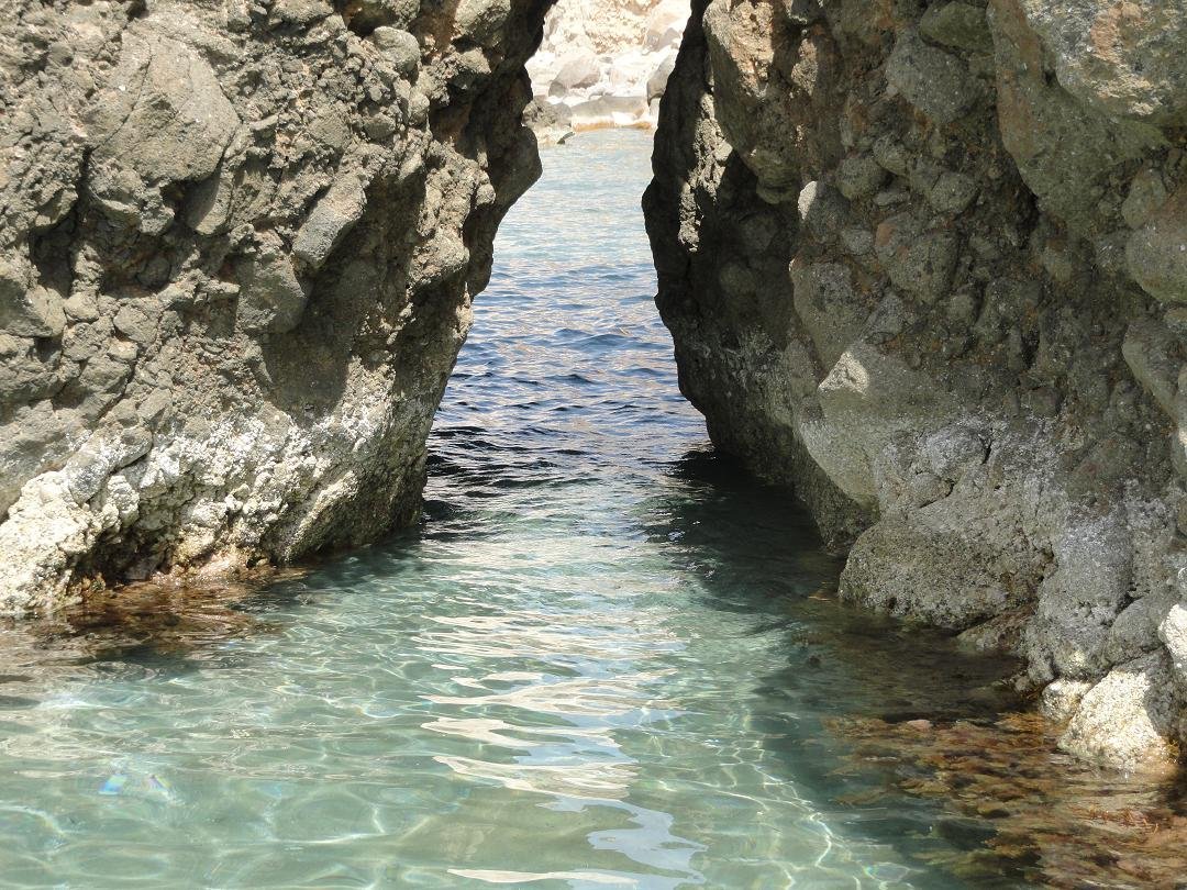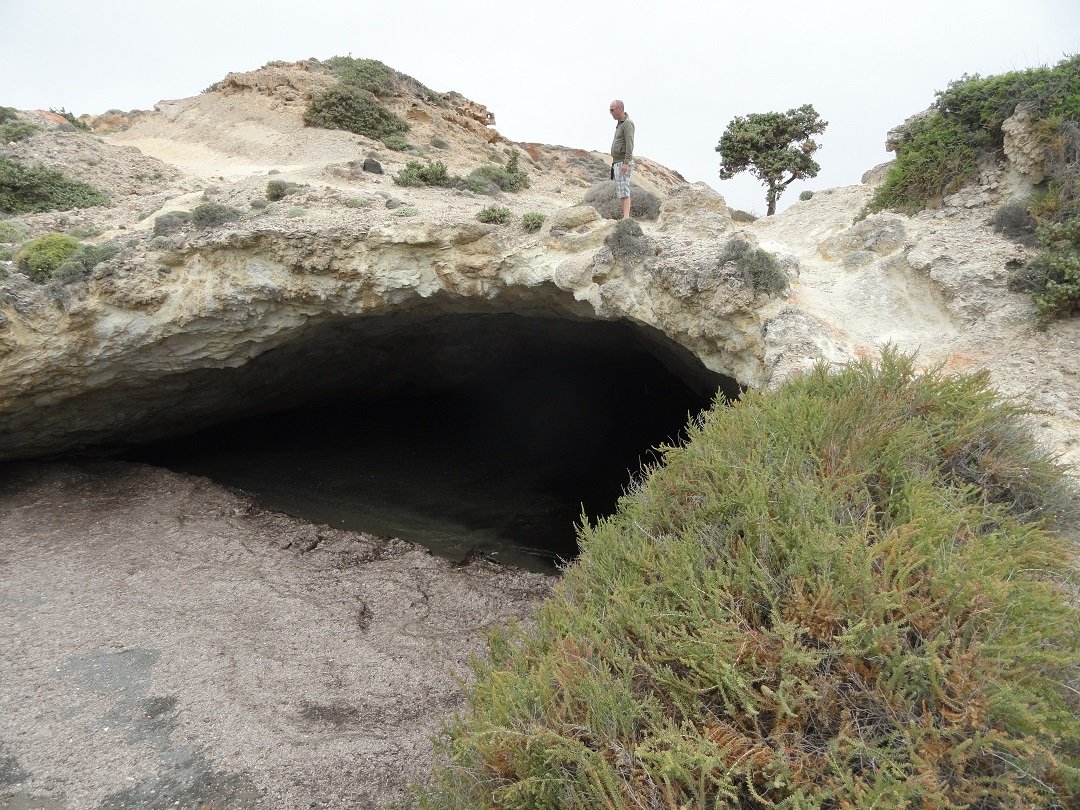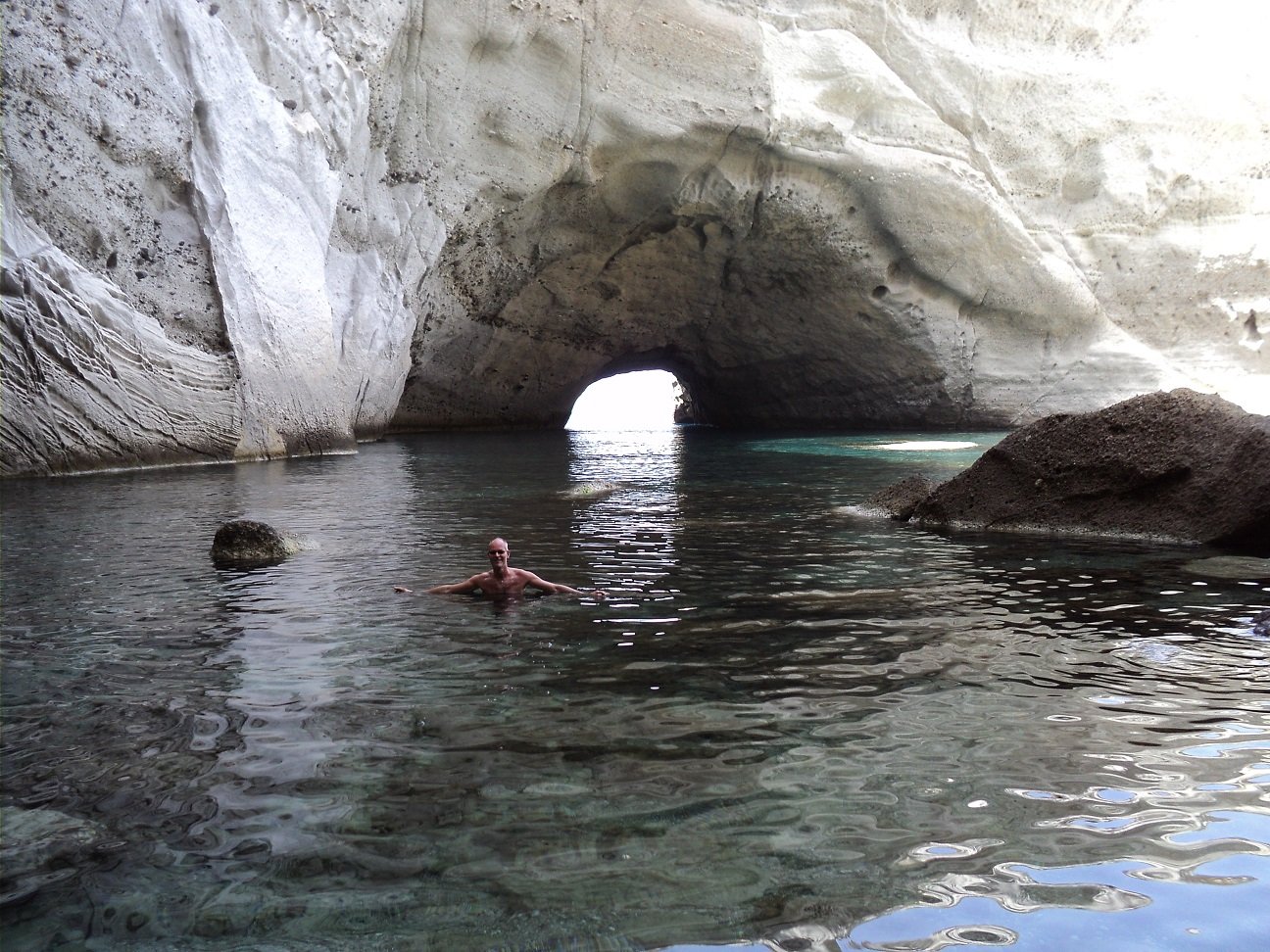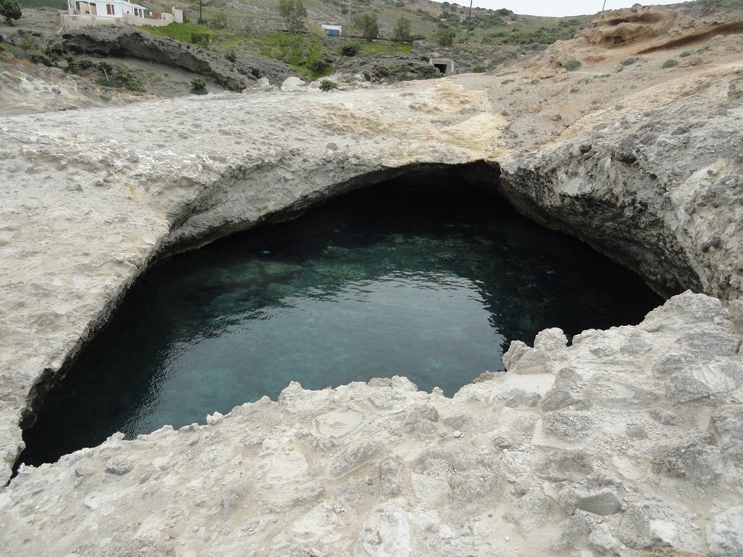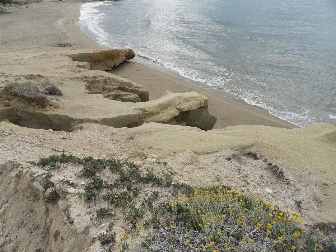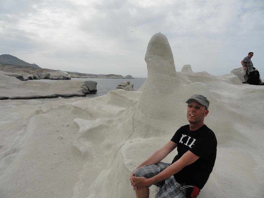 Strand naast de opgraving van Phylakopi , tussen Phylakopi en Pollonia en op ongeveer 3 kilometer afstand van Pollonia. Het is een van de meest bijzondere stranden van het eiland Milos. Je kunt er komen over een smal pad. Vanaf de top van de rots ziet het strand eruit als een turqoise zwembad (kanaal) met hoge witte rotsen eromheen, en er zijn grotten. Op de dag dat wij er kwamen helaas een beetje somber weer, dus het water was wat minder mooi van kleur als normaal. |