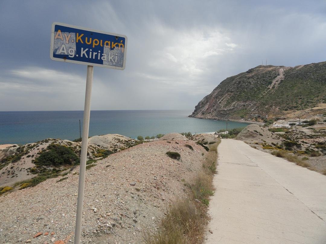 Agia Kyriaki Beach is een lang en breed zandstrand in het zuiden van Milos even ten westen van het bekendere Paliochori Beach. De afslag naar dit strand ligt even voorbij het dorp Zefiria aan de rechterkant (als je vanuit het noorden aankomt). Het lijkt alsof deze weg ophoudt bij een kerk maar hier gaat de weg over in een soort zandpad. Het eerste stuk is het slechtste stuk en het meest zanderig, daarna wordt de weg breder en beter maar hij blijft onverhard totdat je bijna bij het strand bent. Je kunt vanaf de kerk ook lopen. De wandeling duurt ongeveer 30 � 45 minuten (naar boven iets langer dan naar beneden natuurlijk). Toen wij het strand eind mei bezochten waren er nog geen parasols of ligbedden te huur en ook was er geen taverne geopend waar je iets te drinken kon kopen. Wel zijn er een aantal bomen op het strand waaronder je in de schaduw kunt zitten. Agia Kyriaki Beach is een schoon strand en het heldere water heeft er een mooie turqoise kleur. |