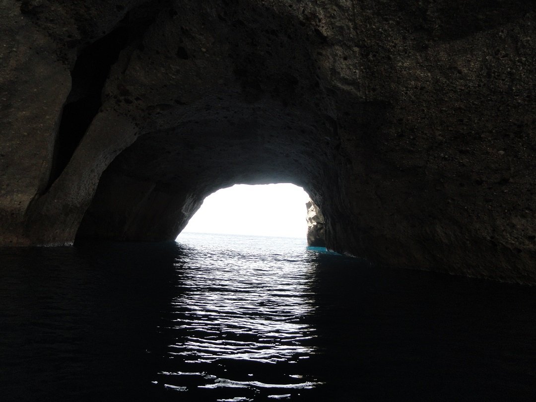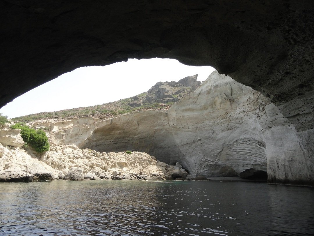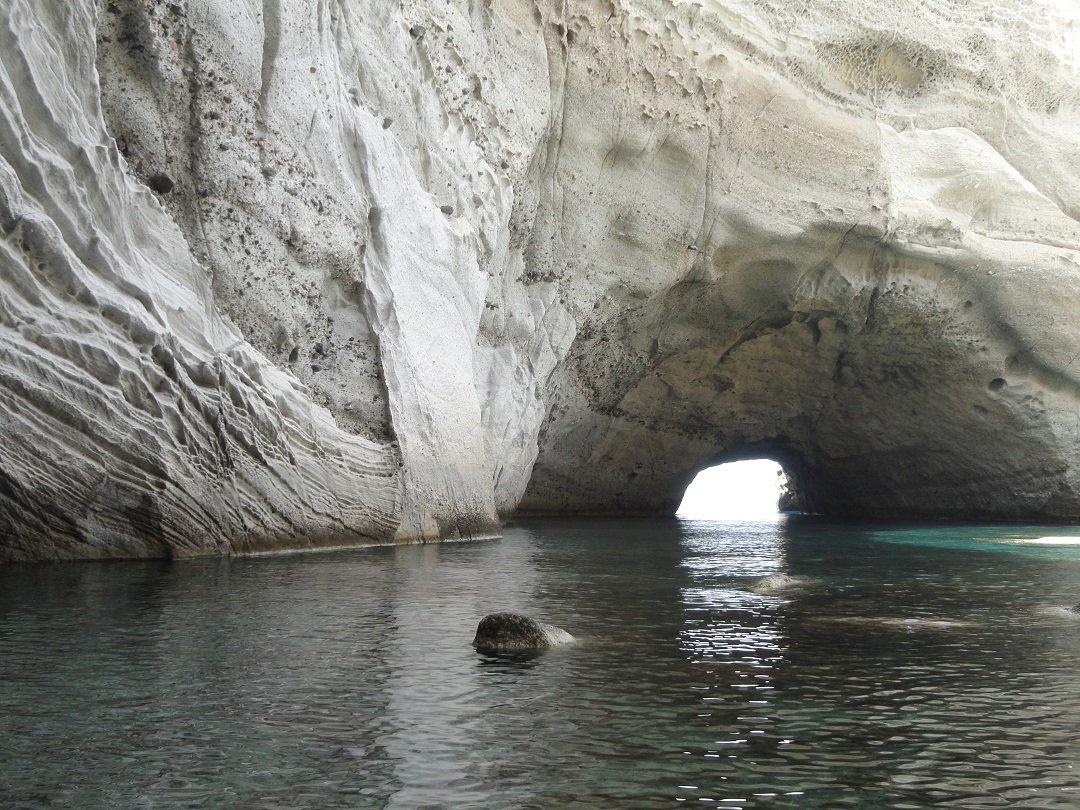 Sykia Cave Beach of Sikia Cave Beach is gelegen in het zuidwesten van Milos. Vanwege de kleur van het water wordt het ook wel de Smaragden Grot genoemd. Het strand is alleen per boot (priv�- of excursieboot) te bereiken. Sykia Cave is een grot waarvan het plafond is ingestort en waar je met een kleine boot onder een boog door in kunt varen. Het is er werkelijk prachtig. Het witte kiezelstrand is omgeven door hoge witte rotsen. De meeste excursieboten maken hier een stop en laten dan de mensen overstappen in een kleiner rubberen bootje om zo de grot in te kunnen varen. Het is hier heerlijk zwemmen en het water is mooi helder. |