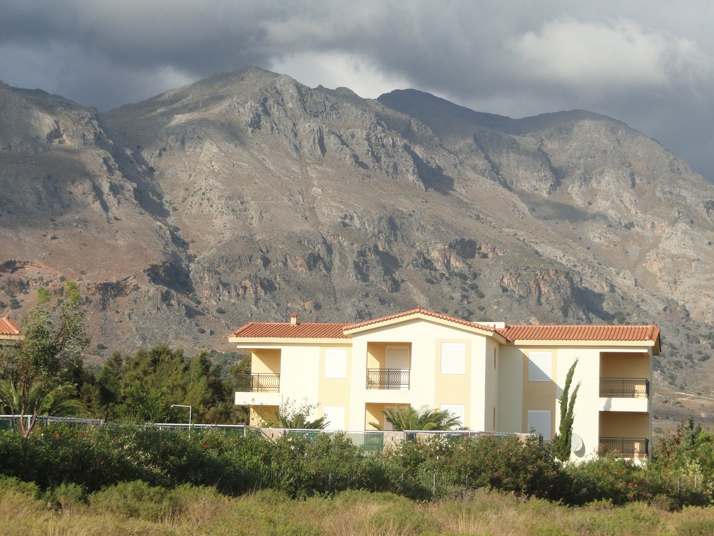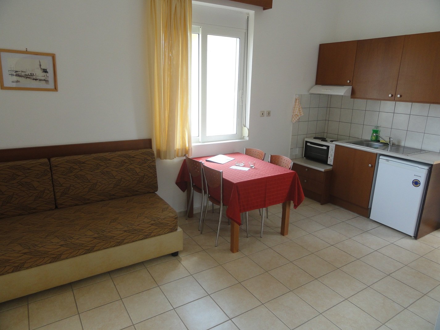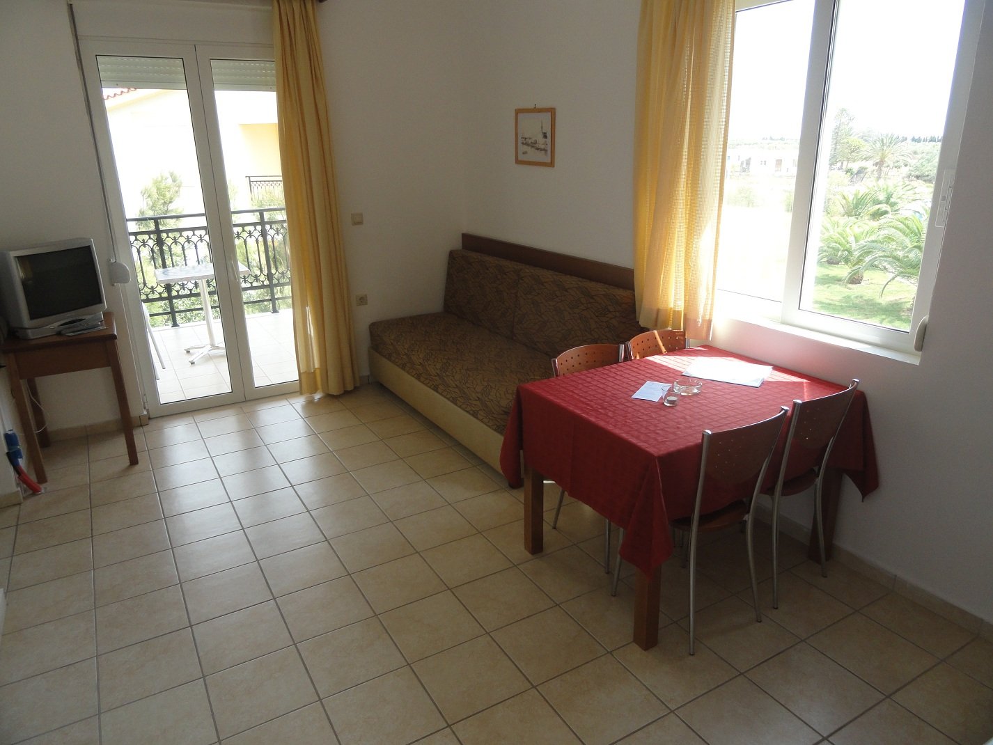 Wij verbleven hier een aantal dagen in september in een appartement met twee slaapkamers. Er was een woonkamer met een bank en een sateliet-tv, een goed uitgeruste kitchenette met allerlei apparatuur (koffiezetapparaat, waterkoker, broodrooster, diverse pannen, keukengerei, serviesgoed, glazen) en een eettafel met stoelen. We hadden twee slaapkamers, een met een tweepersoonsbed en een met twee eenpersoons bedden. Verder was er een badkamer met douche en toilet. Alles was brandschoon en het werd ook regelmatig bijgehouden, inclusief de ramen die werden gelapt, schoon beddengoed en handdoeken en een complete schoonmaak. De woonkamer had openslaande deuren naar een lekker grote veranda waar een tafel met stoelen stond. Vanaf deze varanda had je uitzicht op de zee en op het fort van Frangokastelo. In heb een filmpje gemaakt om een beetje een indruk te geven van het appartement en het uitzicht. |