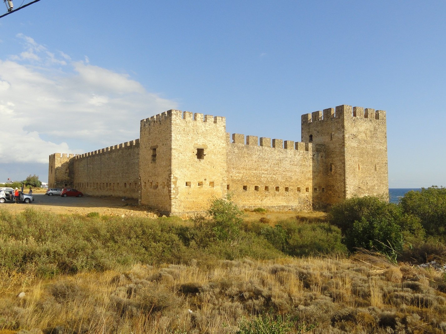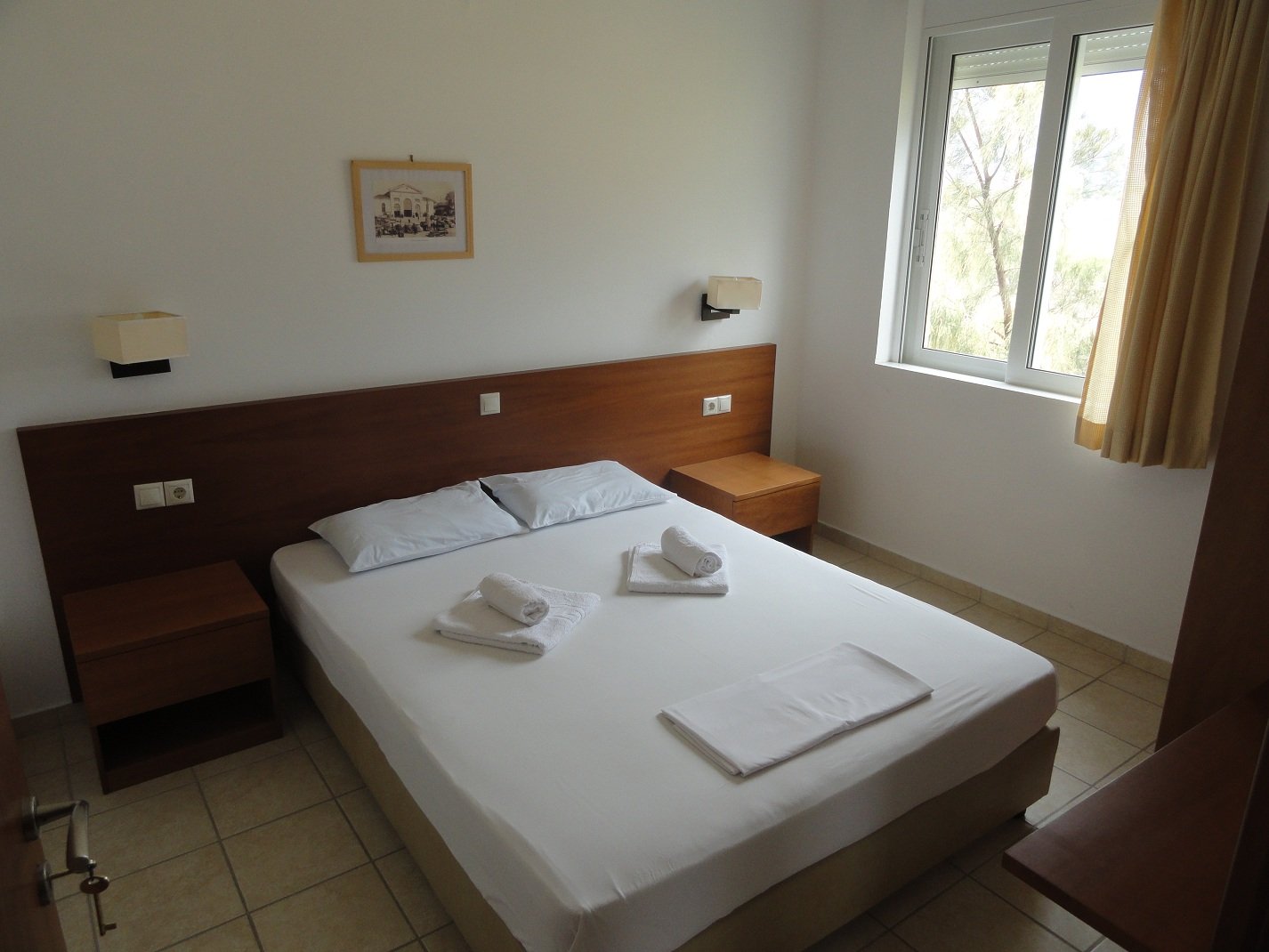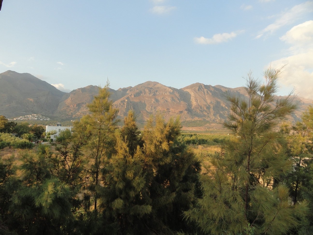 Wij verbleven hier een aantal dagen in september in een appartement met twee slaapkamers. Er was een woonkamer met een bank en een sateliet-tv, een goed uitgeruste kitchenette met allerlei apparatuur (koffiezetapparaat, waterkoker, broodrooster, diverse pannen, keukengerei, serviesgoed, glazen) en een eettafel met stoelen. We hadden twee slaapkamers, een met een tweepersoonsbed en een met twee eenpersoons bedden. Verder was er een badkamer met douche en toilet. Alles was brandschoon en het werd ook regelmatig bijgehouden, inclusief de ramen die werden gelapt, schoon beddengoed en handdoeken en een complete schoonmaak. De woonkamer had openslaande deuren naar een lekker grote veranda waar een tafel met stoelen stond. Vanaf deze varanda had je uitzicht op de zee en op het fort van Frangokastelo. In heb een filmpje gemaakt om een beetje een indruk te geven van het appartement en het uitzicht. |