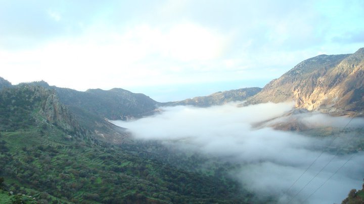 Because the island is volcanic just like Santorini you will therefore mainly find black sand on the beaches of Nisyros. The island is one with two faces: the volcanic soil is very fertile so the hills and the plains are full of vegetation and the island is very green. There are almond trees, grapes, figs, and in the spring many flowers grow on the island. However if you climb the hill you will end up in what looks like a lunar landscape, because the caldera of Nisyros island is dry and not much grows here. The soil in the caldera is predominantly yellow in color and you can smell the sulfur in the air. According to the myth, the island originated in the time that the Olympic gods came to Greece and had to fight against giants for control over the earth. Poseidon threw a large piece of the island of Kos on on top of the giant Porphyris, and so he was buried alive. Every time the volcano was rumbling it was seen as an attempt by the giant to free himself. |