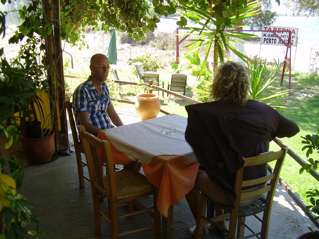Dit is een leuke kleine taverne aan de kust van Nopigia Beach, met uitzicht op de zee. Er zijn bananenbomen en druivenstruiken in de tuin, die de taverna omringt. Niet alles op het menu is altijd beschikbaar, maar er is een goede vari�teit aan keuzes voor een lunch of een diner. We hebben de gevulde courgette bloemen geprobeerd en die waren heerlijk. De gefrituurde fava-ballejes en de redelijk krokant gebakken aardappelen met oregano waren ook zeer smakelijk. Ze hebben een goede en goedkope witte huiswijn. Het brood was vers en uit een stuk (wat betekent dat het niet daarvoor op andere tafels heeft gestaan, voordat het ons bereikte). Na de lunch kregen we een soort van zoete gefrituurde kleine oliebolletjes in een saus en een klein flesje gekoelde raki. Ons oordeel: een 8 uit 10 |