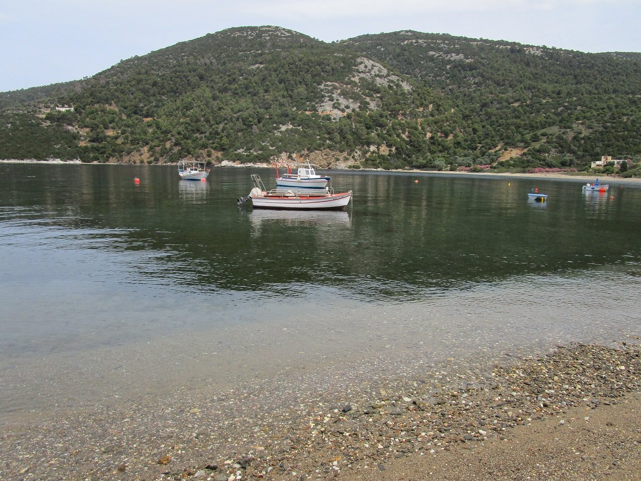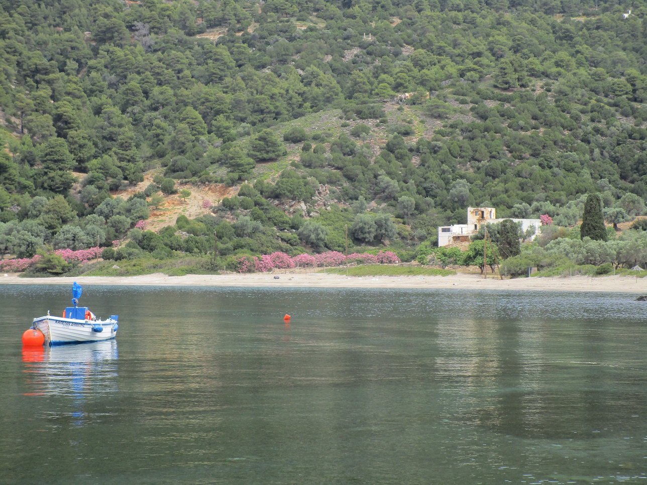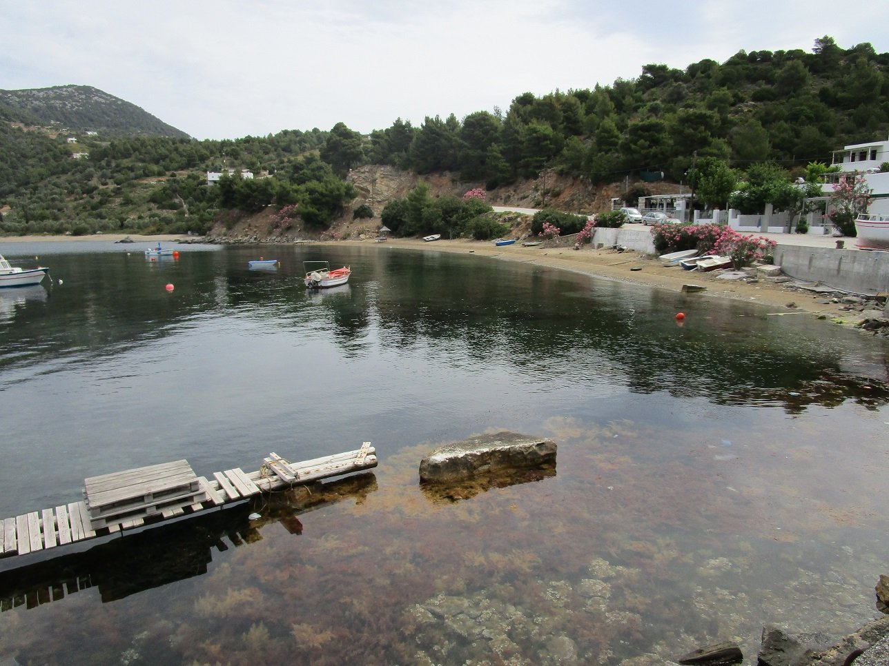 Pefkos Beach is a quiet beach that lies in the west of Skyros just south of Atsitsa and Agios Fokas. It is situated in a bay that is surrounded by pine trees, and facing the beach is a relatively flat island. The beach is rather isolated and there are not many facilities, so you must bring your own water (although in high season there seems to be a tavern). Some parts of the road to the beach are dirt track (update: the road was completed and ran all the way to the village when we visited it in 2018). At Pefkos beach are a few houses and there are a number of small fishing boats floating in the bay. It was once the site of a marble quarry, and marble was exported from the bay.