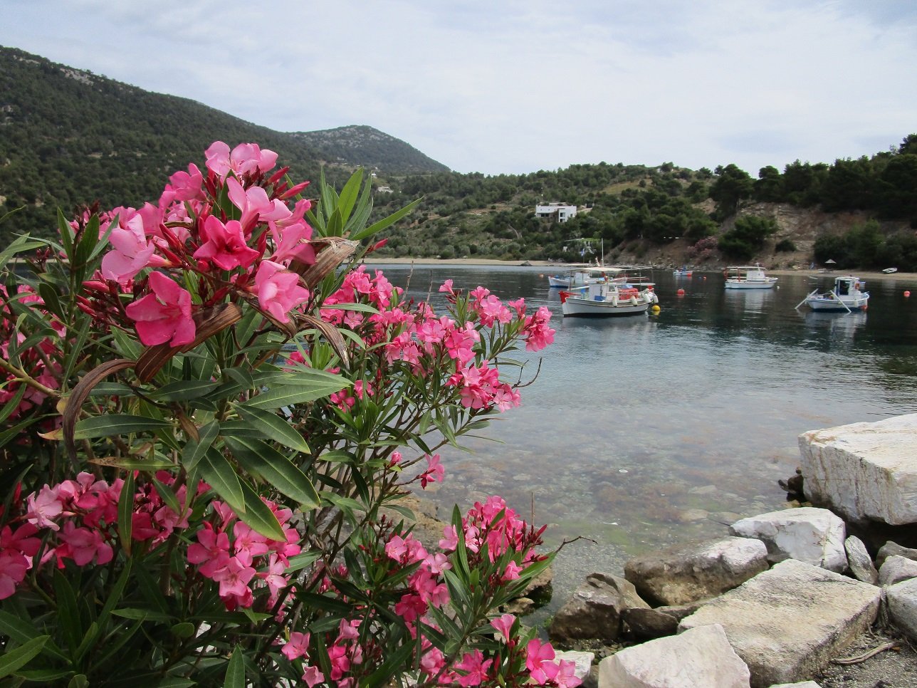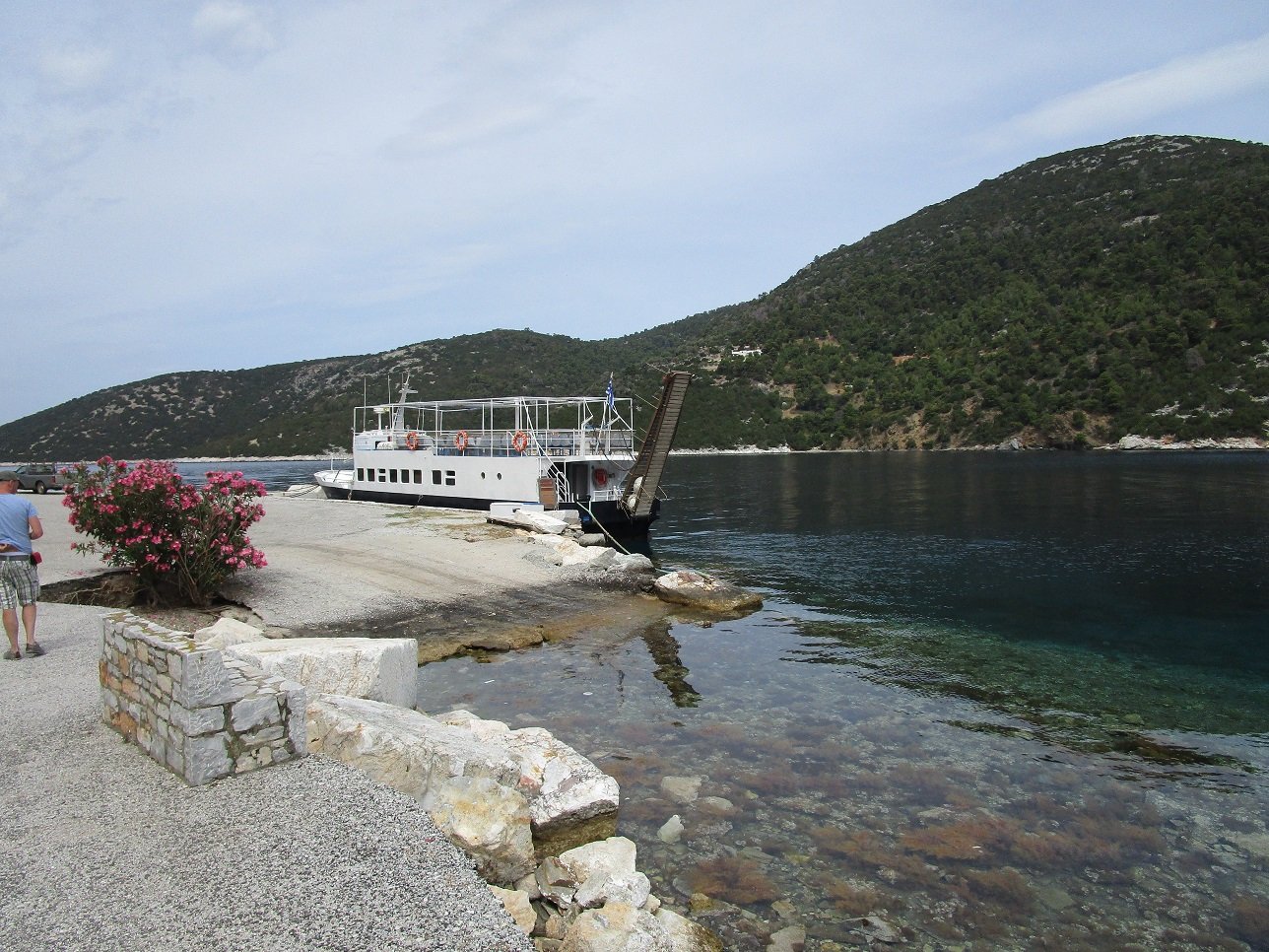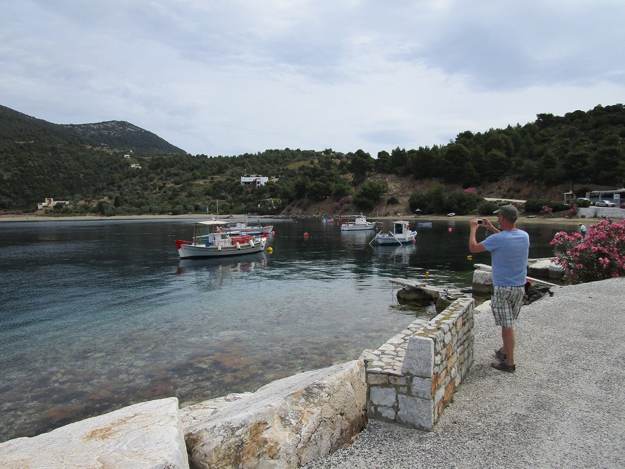 Pefkos Beach is a quiet beach that lies in the west of Skyros just south of Atsitsa and Agios Fokas. It is situated in a bay that is surrounded by pine trees, and facing the beach is a relatively flat island. The beach is rather isolated and there are not many facilities, so you must bring your own water (although in high season there seems to be a tavern). Some parts of the road to the beach are dirt track (update: the road was completed and ran all the way to the village when we visited it in 2018). At Pefkos beach are a few houses and there are a number of small fishing boats floating in the bay. It was once the site of a marble quarry, and marble was exported from the bay.