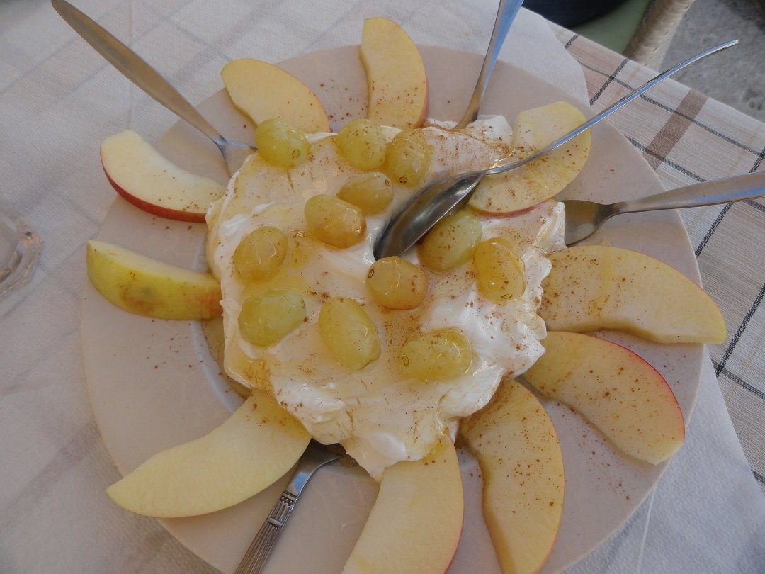 Dit fantastische restaurant ligt bij het grote dorpsplein van Plaka. Het restaurant zelf is vrij groot en er is een tuin bij waar ook een bananenboom staat. De vriendelijke eigenaar is Michalis. Er is een uitgebreide keuze op het menu met veel verschillende salades, vis-, kip- en vleesgerechten. Ik bestel de kipfilet met uitjes, zongedroogde tomaten en walnoten in een creme-saus: in tijden niet zulke heerlijke kip gegeten! Na afloop krijgen we een groot bord met Griekse yoghurt met druiven en appeltjes met kaneel. Een echte aanrader! Ons oordeel: een 9,5 uit 10 |