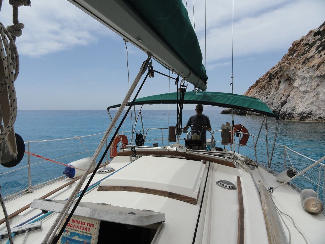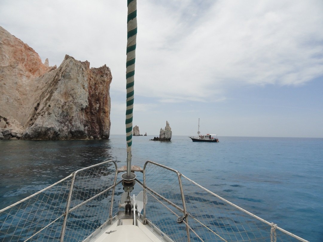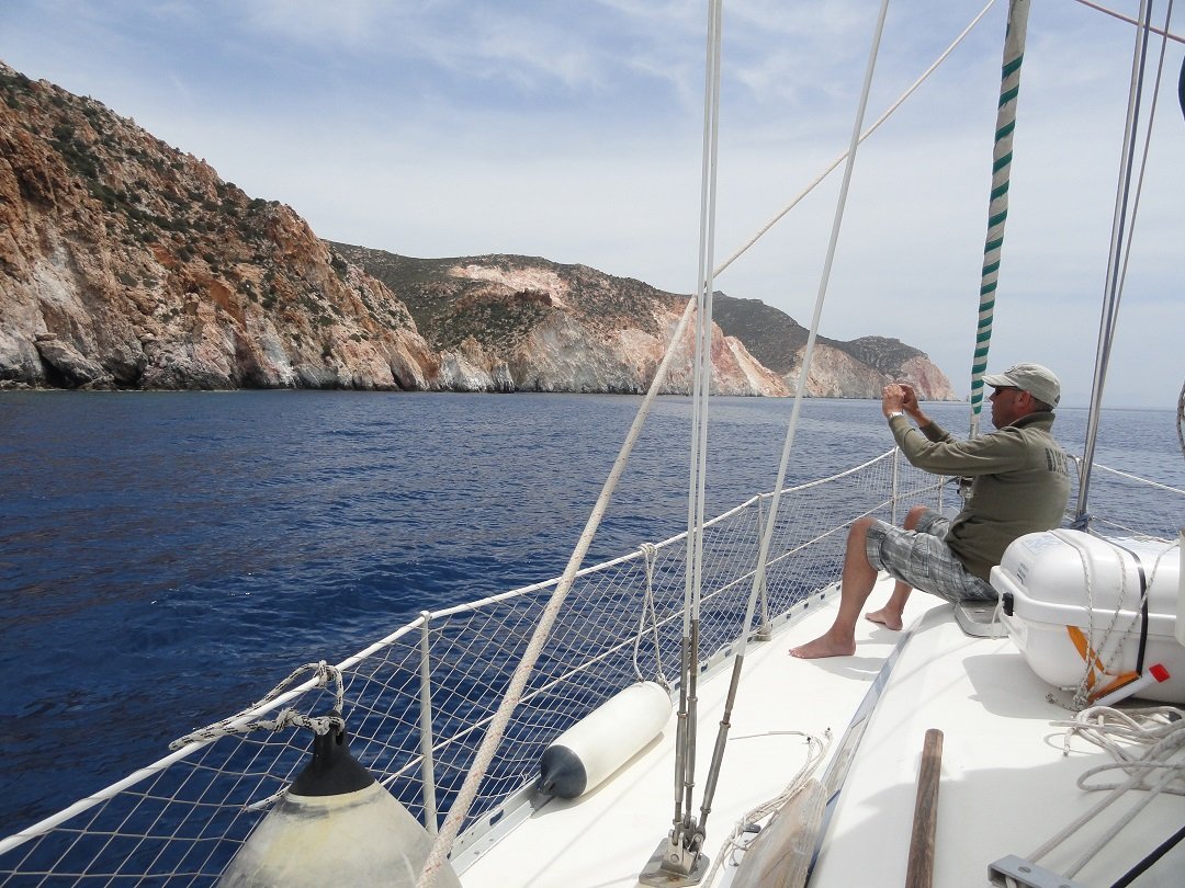 Wij maken een stop bij een van die strandjes aan de oostelijke zijde van Polyaigos en zwemmen er naartoe vanaf de zeilboot, terwijl kapitein Petros de maaltijd gaat maken. Het is een vrij groot kiezelstrand met mooie witte, maar ook veel leuke gekeurde keitjes. Het water is helder en weer turqoise en het strand is schoon. Er is ook een pad dat leidt naar een boven het strand gelegen vuurtoren. Opvallend zijn ook de vreemd gevormde rotsen die vanuit het landschap als punten uit de grond komen zetten. Na een half uurtje "vrij" zwemmen we weer terug naar de boot. Er kan weer een nieuw eiland "bijgeschreven" worden waar we voet aan wal hebben gezet. Petros heeft wat lekkers voor ons klaargemaakt en we genieten van het eten, met een koud wit wijntje erbij. |