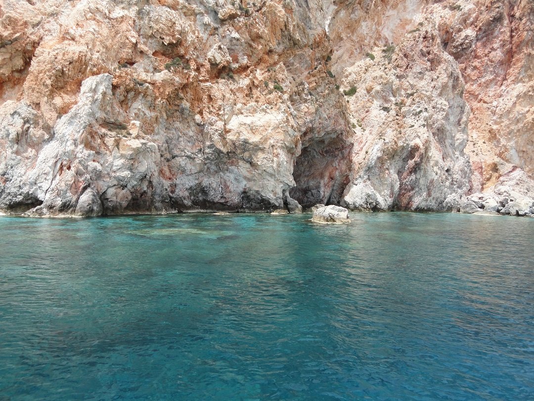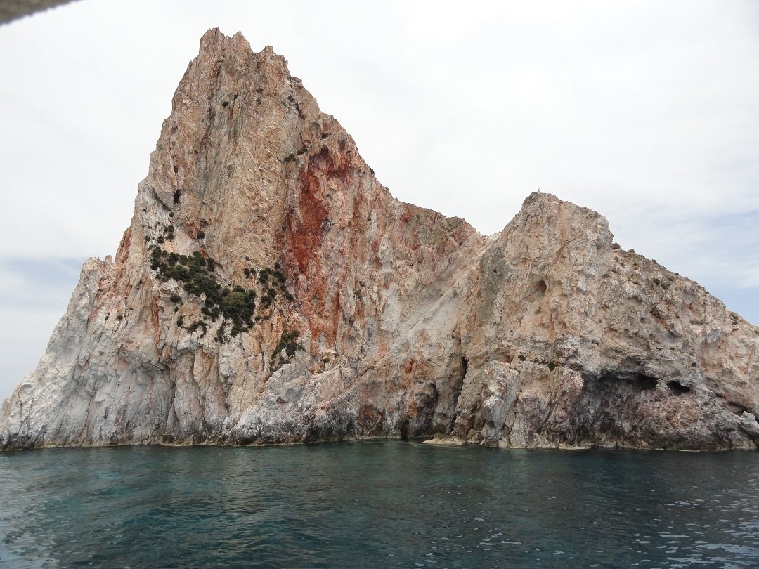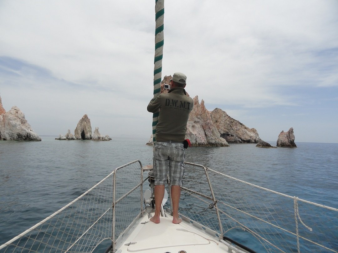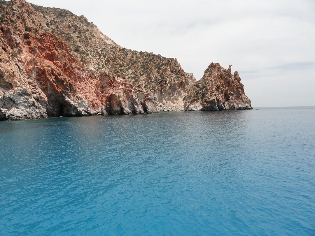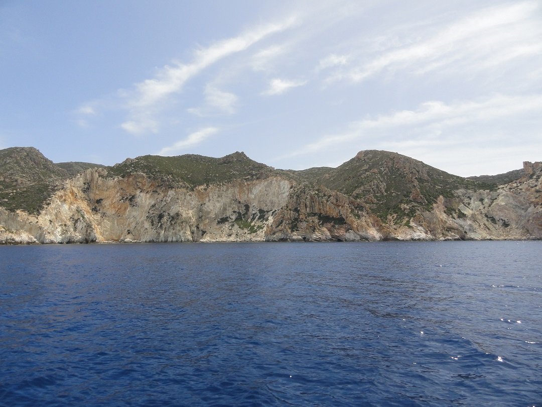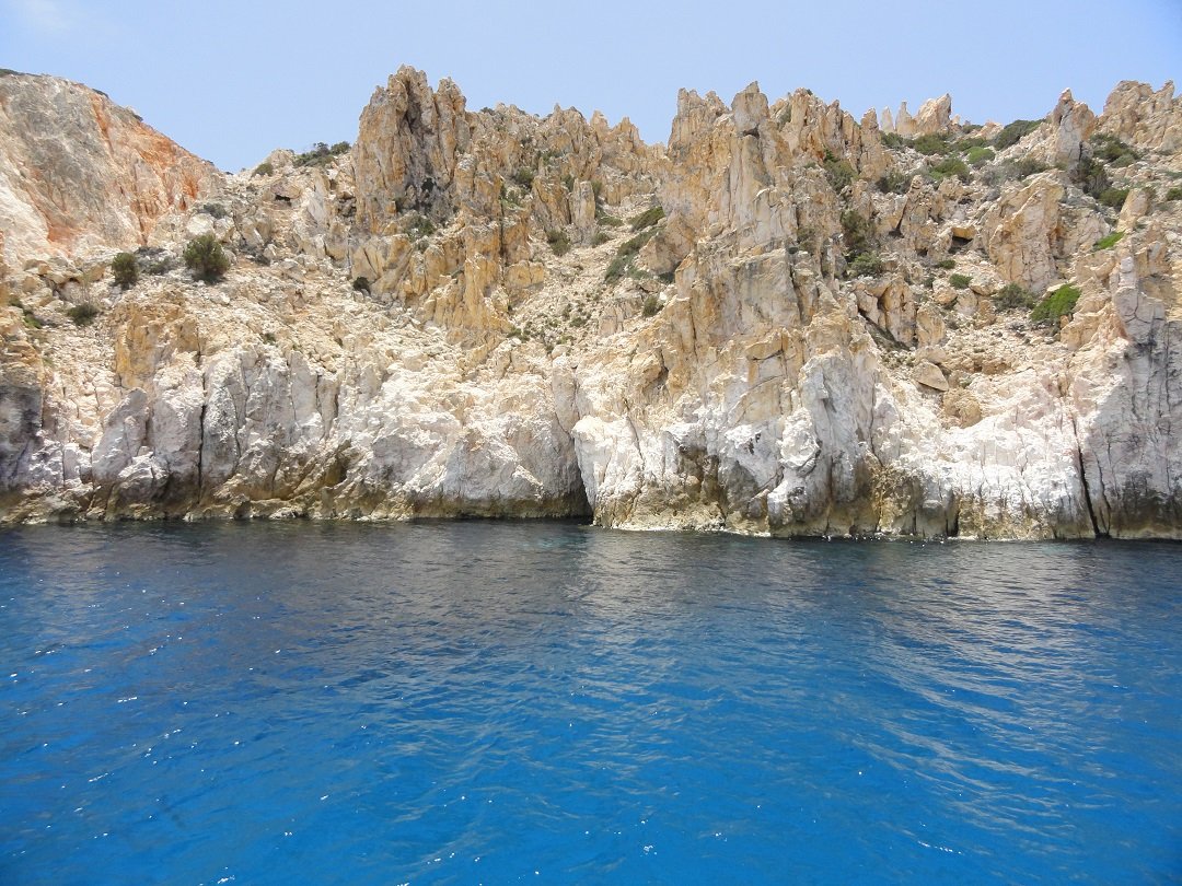 Vanaf de Blue Bay voeren we verder langs de kust waar even verderop een stel prachtige puntige rotsen uit de zee komen zetten. Onderweg komen we ook nog de restanten van een oude gebouwtje tegen dat ooit werd gebruikt in de tijd dat er nog een mijn op het eiland was (nu verboden). De rotsen steken als majestueus als een soort kasteeltorens uit de zee en we varen en vlak langs. Het lijkt bijna of we op een andere planeet zijn beland of in een science fiction film. We zijn nu aan de zuidkant van het eiland en gaan rondom Polyaigos verder naar de oostkant. |