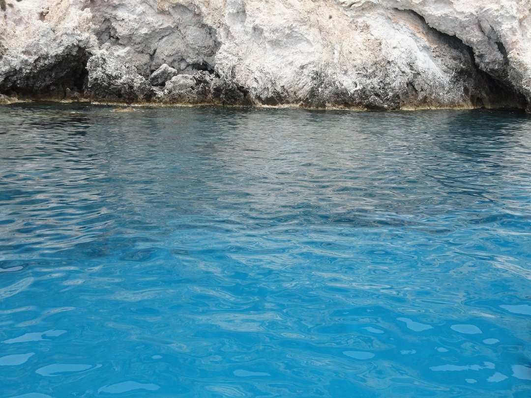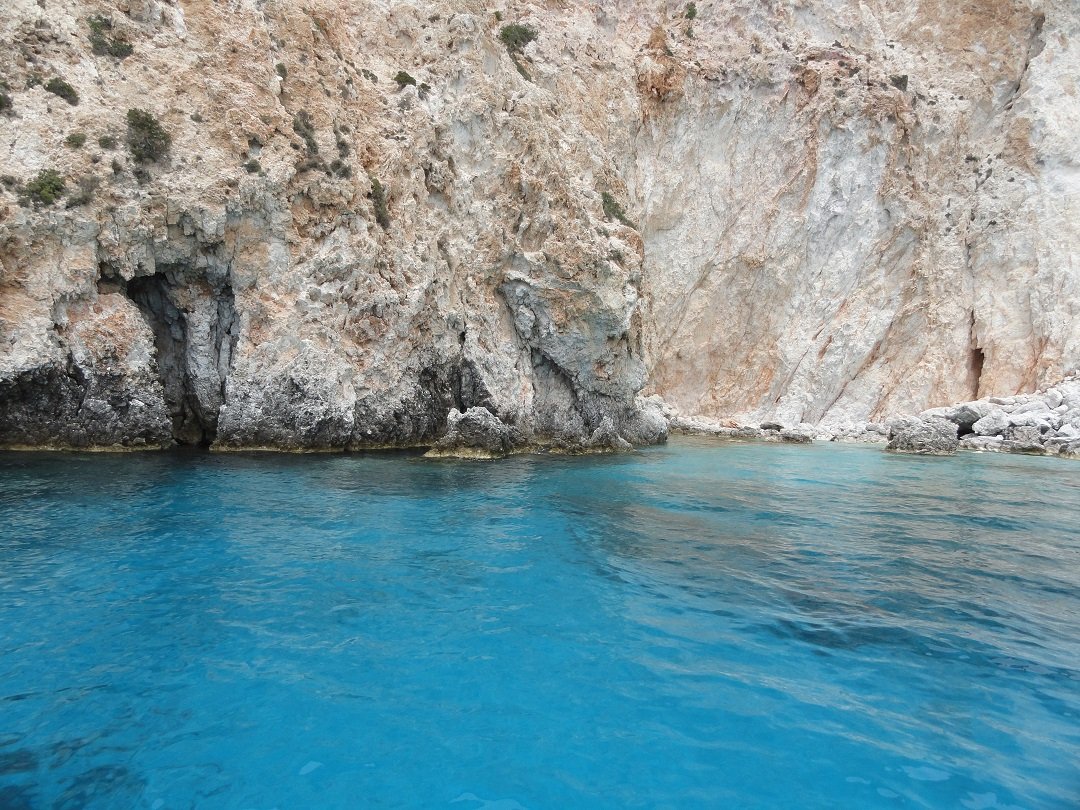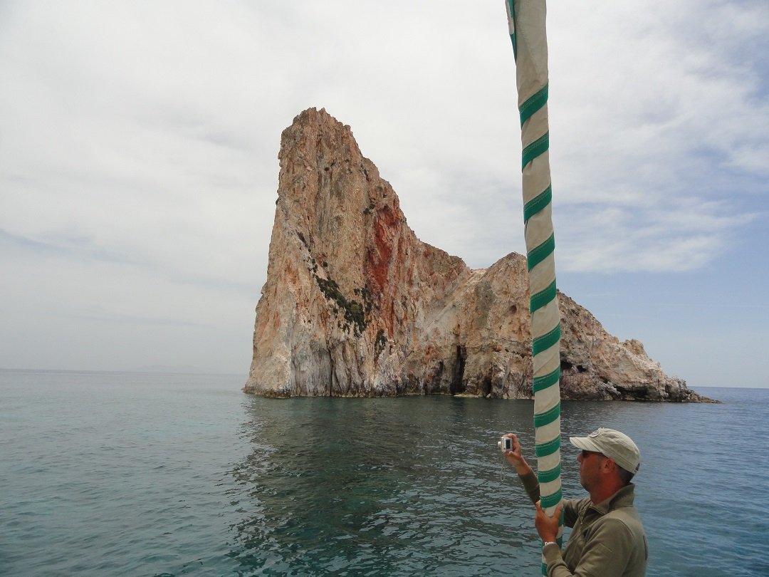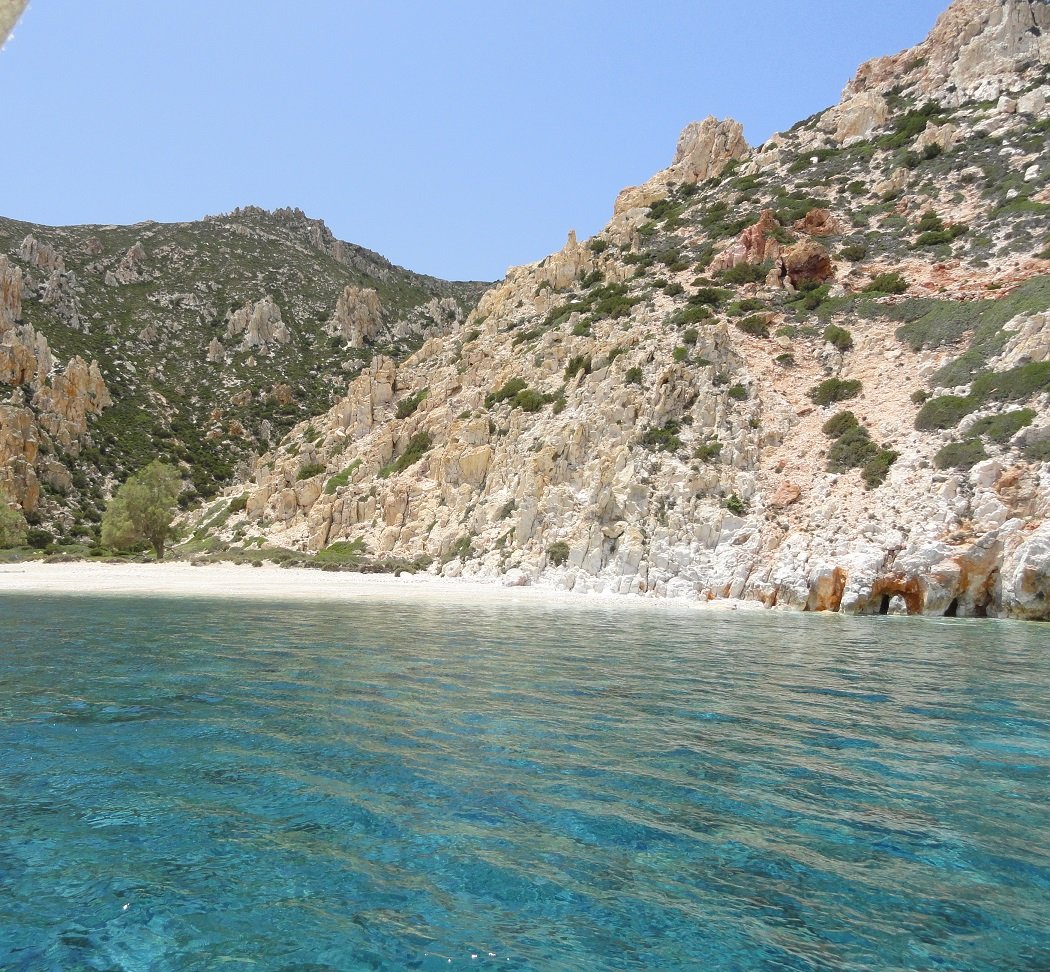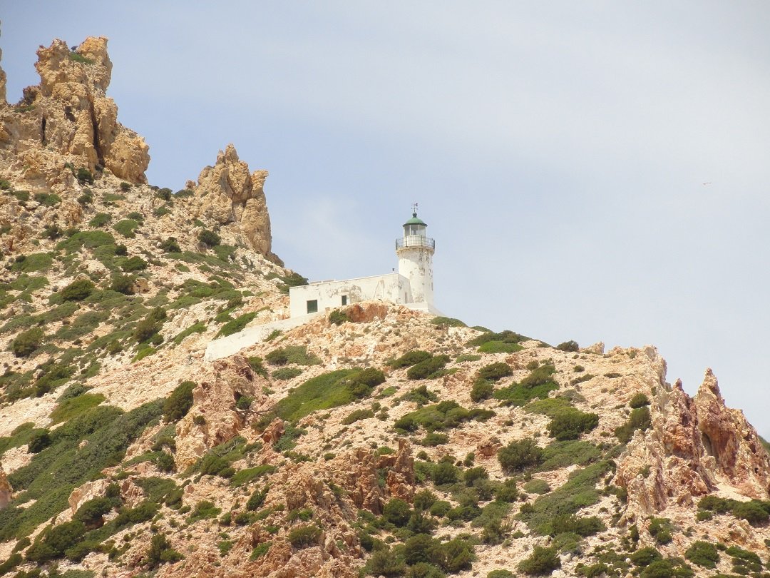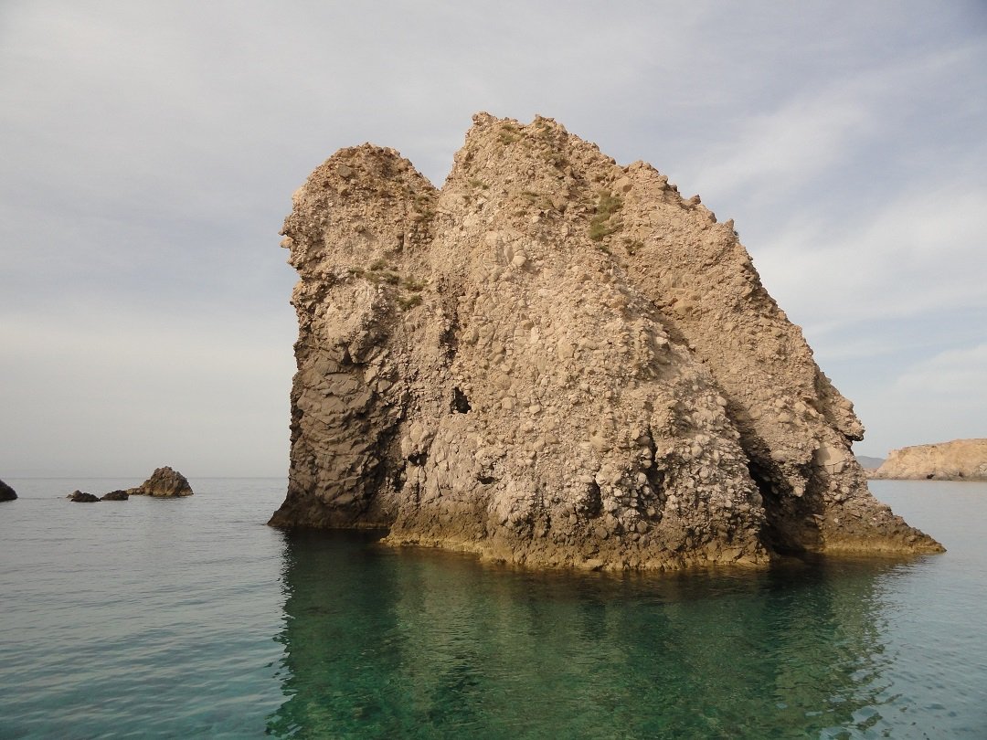Vanaf de Blue Bay voeren we verder langs de kust waar even verderop een stel prachtige puntige rotsen uit de zee komen zetten. Onderweg komen we ook nog de restanten van een oude gebouwtje tegen dat ooit werd gebruikt in de tijd dat er nog een mijn op het eiland was (nu verboden). De rotsen steken als majestueus als een soort kasteeltorens uit de zee en we varen en vlak langs. Het lijkt bijna of we op een andere planeet zijn beland of in een science fiction film. We zijn nu aan de zuidkant van het eiland en gaan rondom Polyaigos verder naar de oostkant. |