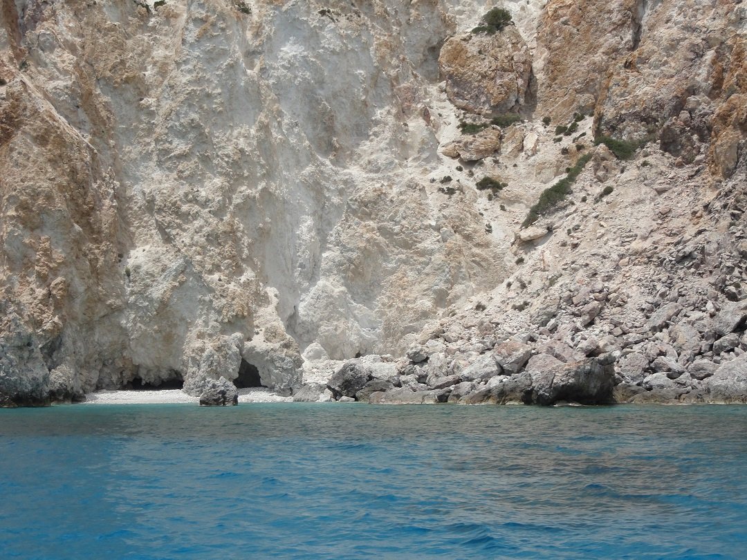 Wij maakten een boottocht naar Polyaigos met een priv� boot. Dit is een leuk idee voor mensen die graag zelf willen bepalen wat ze willen gaan bekijken, zonder andere mensen erbij. De Kirki zeilboot ligt in de haven van Adamas en is te huur voor dagtochtjes maar kan ook voor meerdere dagen afgehuurd worden. Er zijn slaapplaatsen aan boord. Je kunt je plannen bespreken met kapitein Petros. De Kirki boot biedt plaats aan zes gasten en het eigenlijk helemaal niet zo duur. De prijs in 2013 varieert van 300 euro (laagseizoen) tot 500 euro (hoogseizoen) per dag, en dit is inclusief eten en drankjes (voor de dagtochten). Er is niet veel te huur qua priv�-boten op Milos en kapitein Petros is de goedkoopste. De excursies vanaf de haven van Adamas waarbij je de boot moet delen met mensen die je niet kent kosten 50 euro per persoon, dus als je met zes mensen bent, heb je voor hetzelfde geld je eigen boot. De meest populaire routes zijn de tocht langs de prachtige kust van het eiland Milos naar Kleftiko met zwemstops op diverse plekken, of de tocht naar de Glaronissia eilandjes en dan rondom het schitterende onbewoonde eiland Polyaigos. Telephone: +30 6944659914 - Stuur een e-mail aan captain Petros op Milos. Het eiland is ooit door een Byzantijnse keizer aan de kerk geschonken en daarom is het nu (gelukkig) onbewoond. Polyaigos ligt vlak naast het eiland Kimolos (afstand ongeveer 2 kilometer) maar het is daar totaal verschillend van. Daar waar de kustlijn van Kimolos vooral bruin en grijs is, heeft de kustlijn van Polyaigos allerlei prachtige kleuren wit, roze en oranje. In plaats van mensen wonen er op Polyaigos geiten en in de grotten langs de kust woont de beschermde Monachus Monachus zeehond. De Grieks-orthodoxe kerk leent wat stukjes land op het eiland uit aan plaatselijke geitenhoeders die op de eilanden Milos en Kimolos wonen. Polyaigos is ongeveer 18 km2 groot en de kustlijn is ongeveer 25 kilometer lang. Op diverse plaatsen langs deze kust liggen leuke ongerepte kiezelstrandjes. Onze eerste stop was in de zogenaamde "Blue Bay". Waarom die zo genoemd wordt behoeft eigenlijk geen nadere uitleg. De baai heeft wat weg van een amfitheater met witte rotsen rondom en de zee heeft er een prachtige blauwe kleur water. |