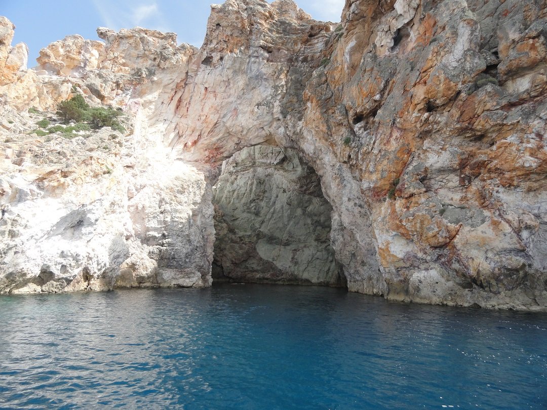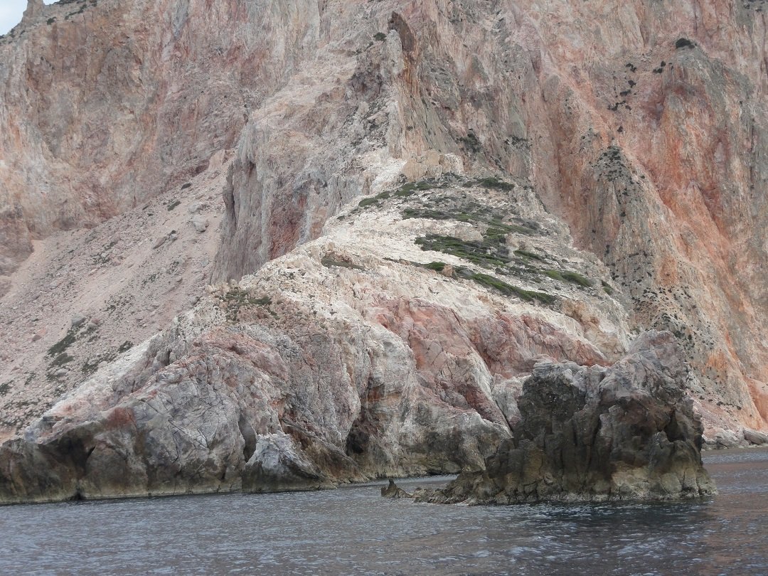 Als we uit zijn gegeten gaat de boottocht verder langs de kust van Polyaigos en we varen onder een boog door in een wat lijkt (of is) een ingestorte grot. De kleur van het water wordt ondertussen voorspelbaar maar het is inderdaad weer turqoise. We gaan verder langs de noordkant van het eiland Kimolos en varen dan rond dat eiland via de westkant weer naar Milos. Het verschil met Polyaigos is toch wel extreem. Niet dat Kimolos niet charmant is, maar de kustlijn mist de prachtige kleuren die we op Polyaigos de hele tijd tegenkwamen. Ook het water is er niet zo prachtig blauw als wat we de hele tijd hebben gezien. De westkant van Kimolos maakt ook een verlaten indruk. Er zijn wat mooie rotsen in de zee en we zien wat strandjes, maar huizen zijn er eigenlijk nauwelijks aan deze kant van het eiland. Tot zover de reis langs Polyaigos met de Kirki boot. We hebben nog andere plekjes aangedaan tijdens deze vaartocht, die je kunt zien op de Milos bootverhuur pagina |