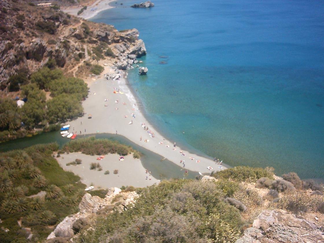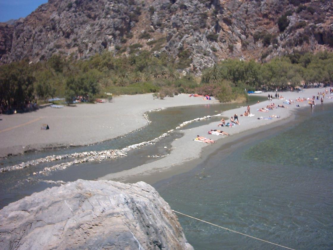 Een klein beetje konditie is dus wel nodig als je de klim van en naar Preveli Beach wilt ondernemen. De uitzichten maken het echter wel de moeite waard. Desondanks ben je niet alleen op Preveli beach, want het is een druk strand. Het palmenstrand is een mooi zandstrand waar een rivier doorheen vloeit. Het ligt aan het einde van de Kourtaliotiko kloof. Het gebied lijkt op een tropisch lagune met zijn palmen, oleanders, watervallen en de rivier die de zee in loopt (koud water!). Preveli Beach is een groot strand, en ook gechikt voor naturisme. Op het gedeelte achter de heuvel (waar dus de palmen niet staan, een eindje van de rivier af) is er een mogelijkheid voor naturisten om zonder badkleding te zwemmen en te zonnen. Dit stuk is dus eigenlijk een onofficieel naturistenstrand. |