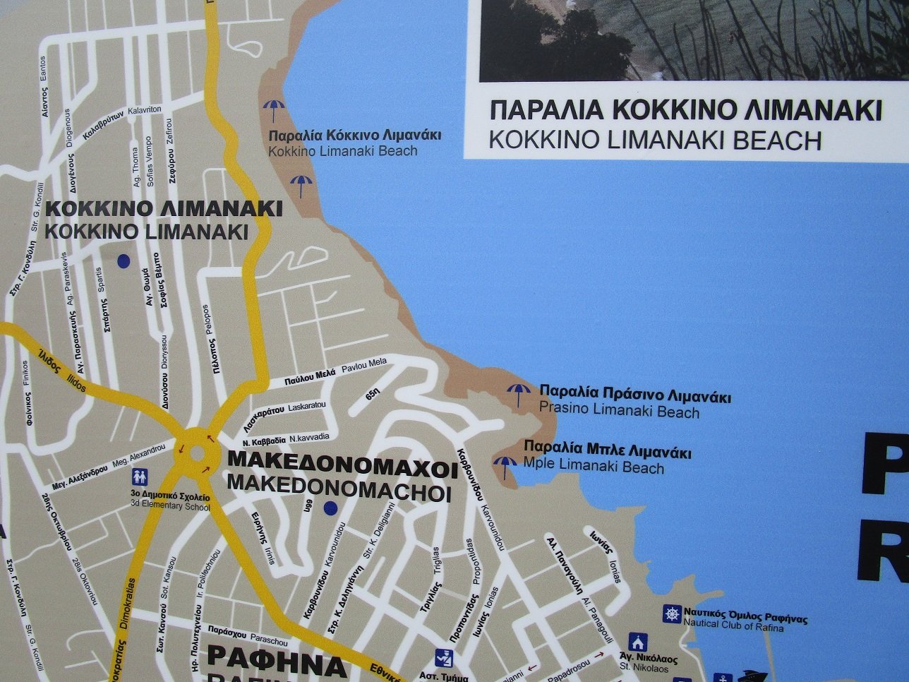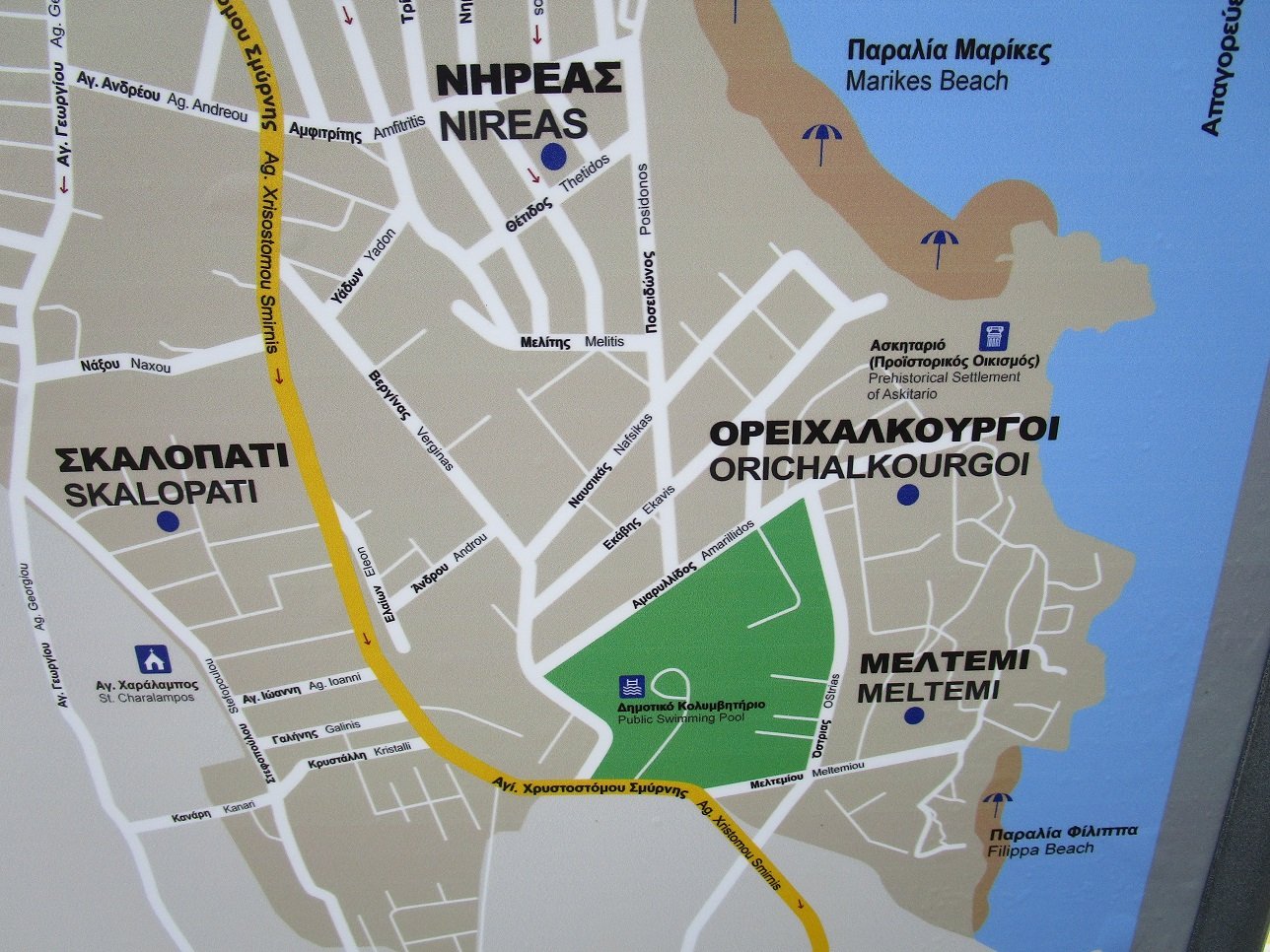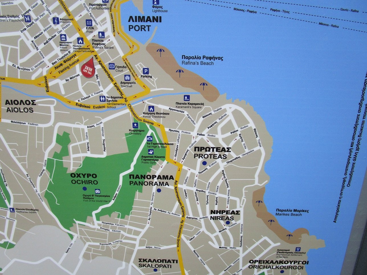 Onder Marikes beach ligt het kleinere Filippa beach. Ten noorden van Rafina beach liggen Prasino en Kokkino Limanaki beach.