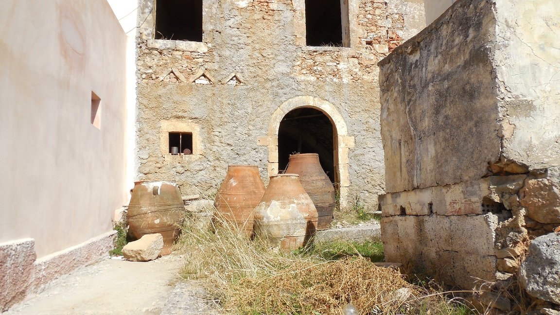 It is already worth to go and see the village of Rokka itself. It has about 100 inhabitants, is located at an altitude of 210 meters, has stunning views, a nice church, beautifully restored houses and some beautiful old dilapidated buildings. It is a very peaceful and traditional Cretan village without facilities. There is also no tavern or kafenion in the village. At the church, which dates from 1888, a few relics have been put down that were found at the site of Ancient Rokka which is situated next to the modern village, such as (I think) a nicely carved part of a column and a type of grinding stone. There is also a part of an old wall with very large stones, probably the remains of the city wall. In all likeliness a part of the modern Rokka was built on the ancient Rokka.