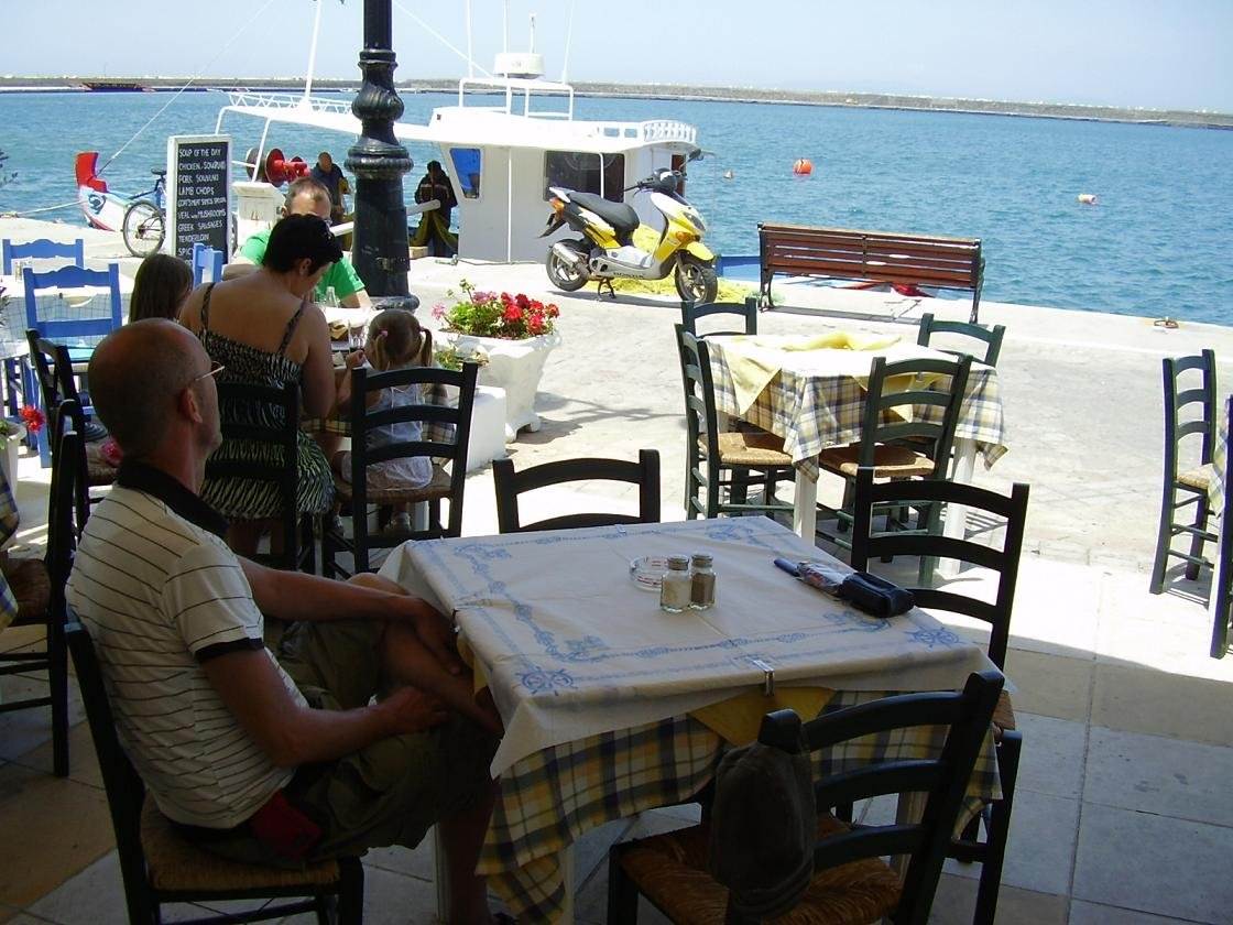 Here at the beach they serve different kinds of international breakfasts and sandwiches, salads, fish and grilled dishes. The chef salad comes with ham, egg, lettuce, cucumber, tomatoes and cocktailsauce. The lamb is soft and good, and the mousaka tastes wonderfull with a bit of parmezan cheese on top and some rice on the side. The french fries that tasted crispy at lunchtime are a bit soggy in the evening when we order them for the second time (and people wonder why we gain so much weight during our holidays, haha). The music is nice and the waiter Babis a very friendly guy. In 2008 Babis had left though and was replaced by another friendly waiter. Our verdict: 7,5 of 10 |