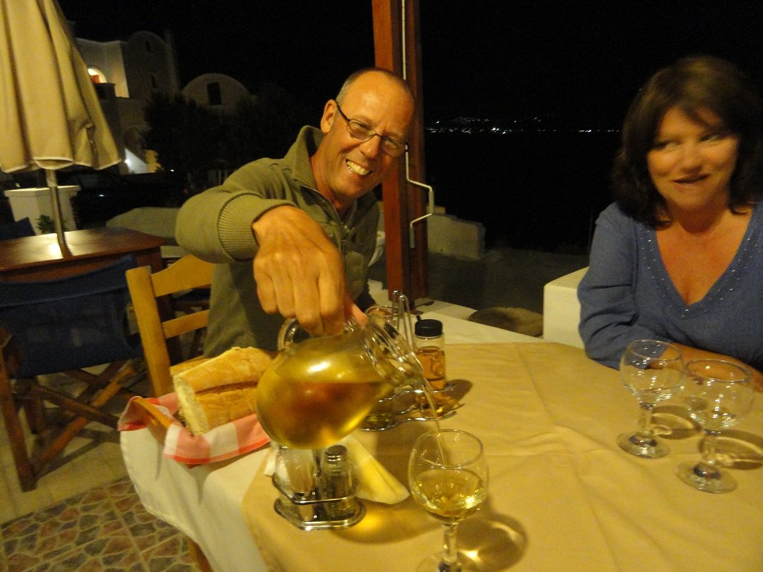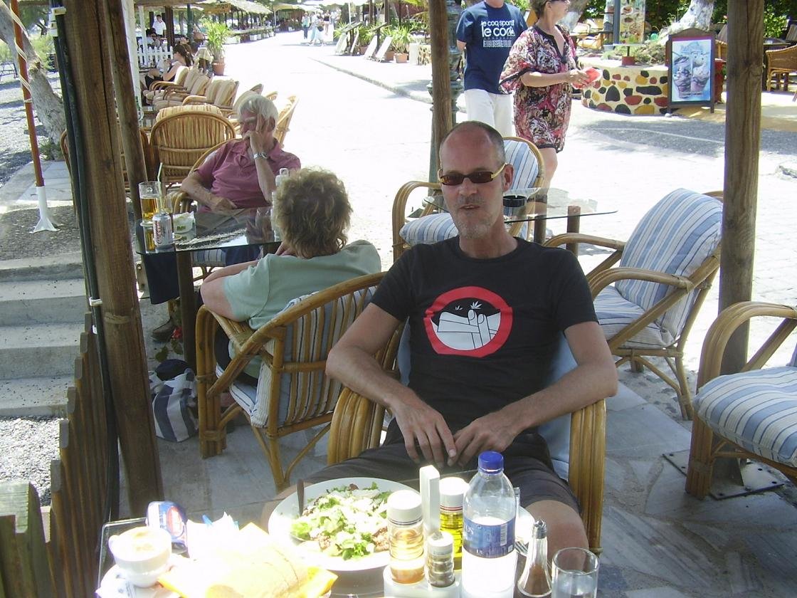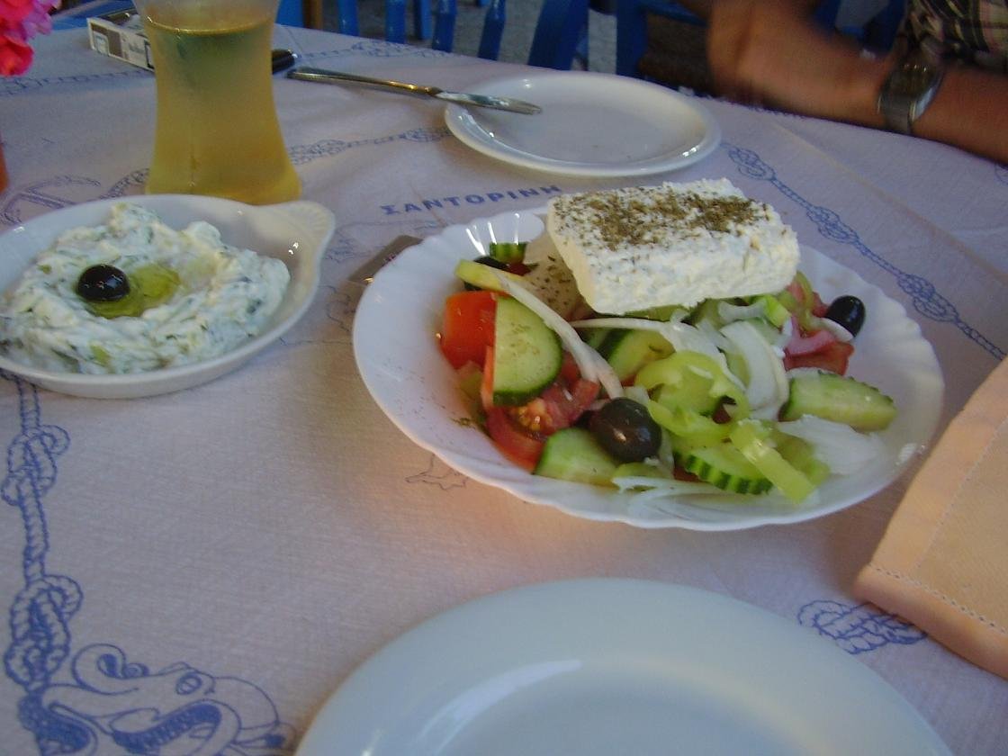 Dit is een van de twee restaurantjes direkt bij William's House (waar we gelogeerd hebben) in Akrotiri. Geen klachten over het eten, en we hebben er van alles geprobeerd. Natuurlijk de Griekse salade, maar ook de gehaktballetjes in tomatensaus, de tomatenballetjes, de saganaki (geflambeerde kaas), tzatziki, geroosterde paprika's, de kipfilet en nog veel meer dingen die allemaal niet op de foto staan. Erg vriendelijke bediening, lekkere wijn en een leuk sfeertje. Ons oordeel: best goed, een 8,5 uit 10 |
