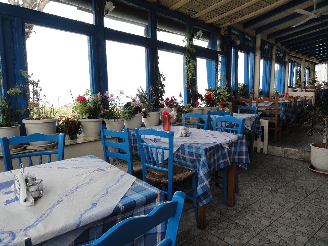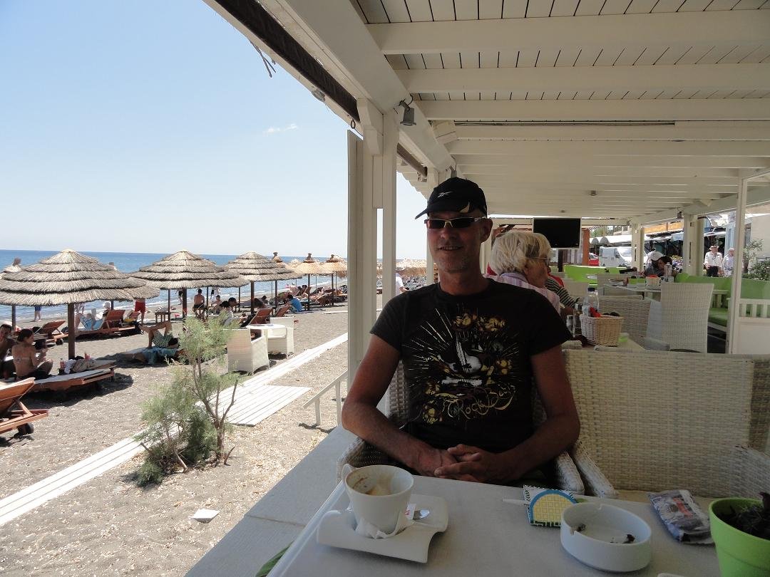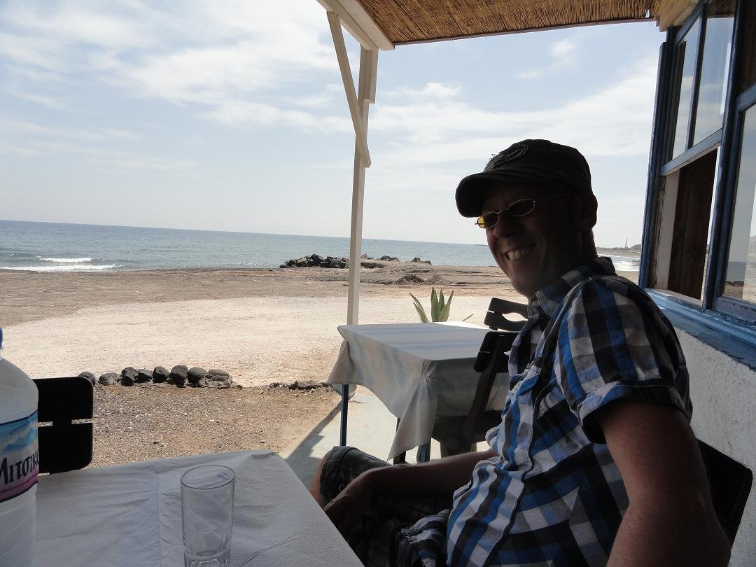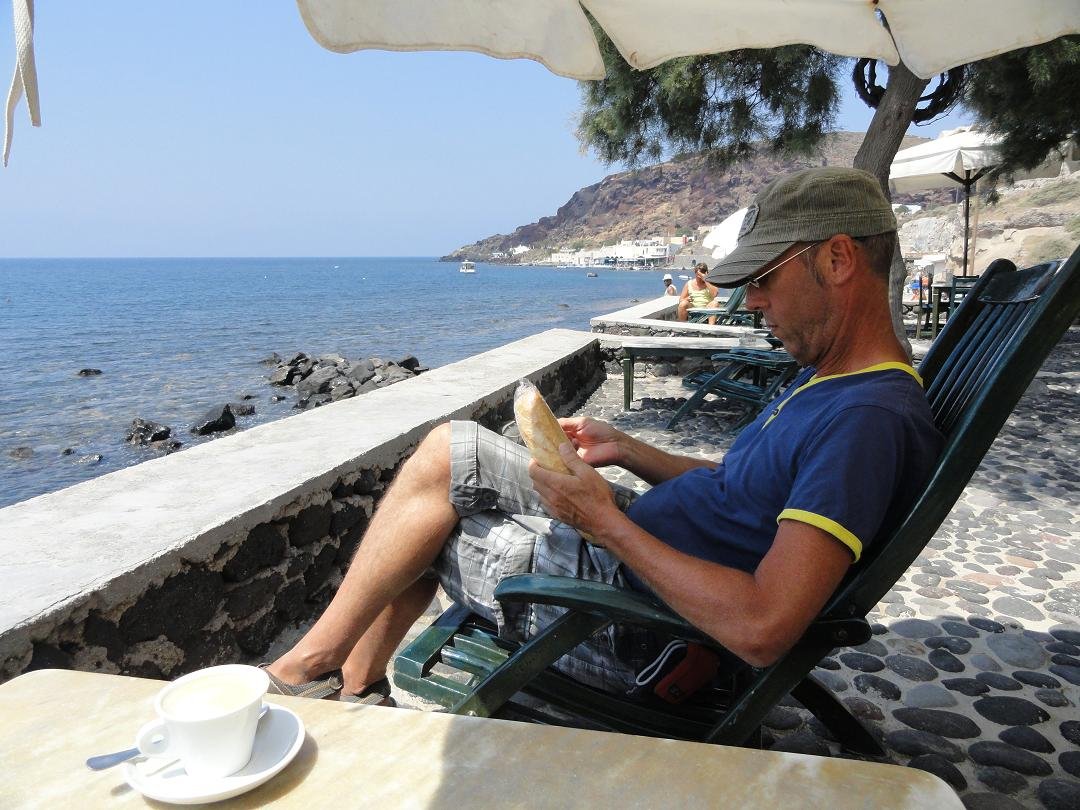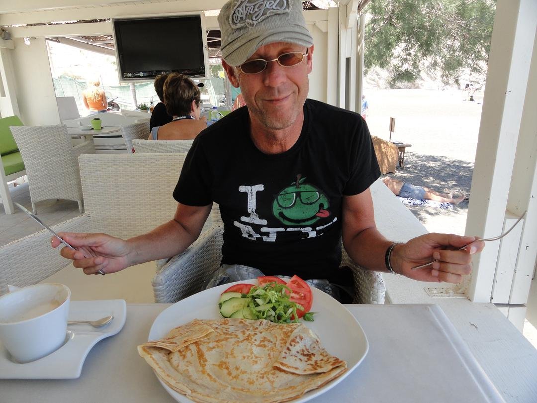 Taverna aan het einde van het strand van Perissa, aan het water, vlakbij de kerk. Ze serveren er koffie, ontbijt, zoete en hartige cr�pes, broodjes, omelettes, hamburgers, club sandwich en andere snacks. De cappuccino is dik in orde. We bestellen nog een club sandwich en een cr�pe met kalkoen, kaas en champignons. Alles smaakt prima en de frietjes zijn zowaar knapperig. Snelle en vriendelijke service. Ons oordeel: goed tot zeer goed, een 8,5 uit 10 |