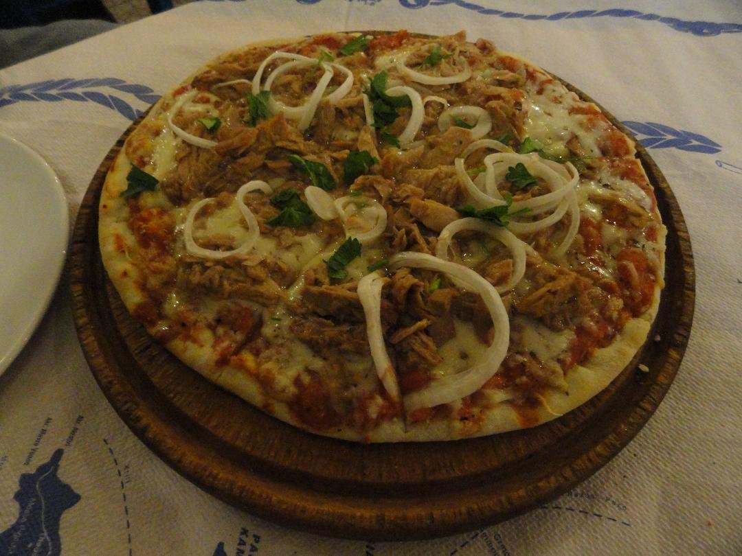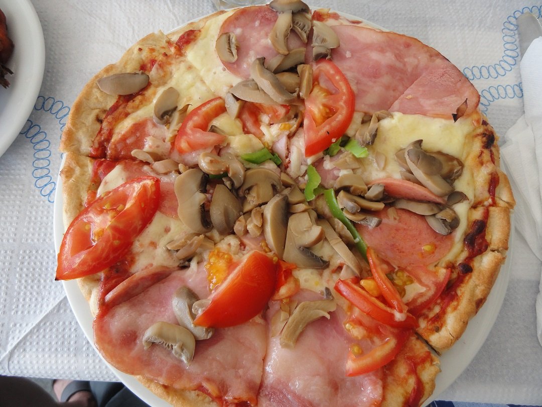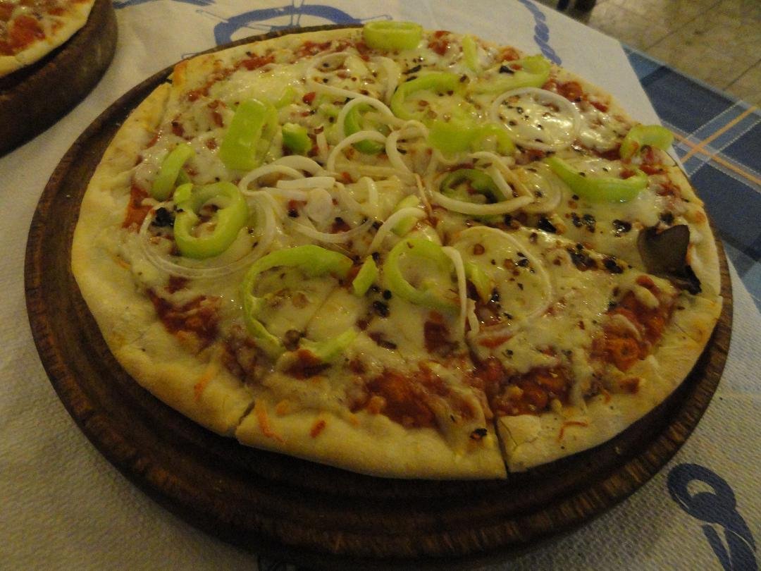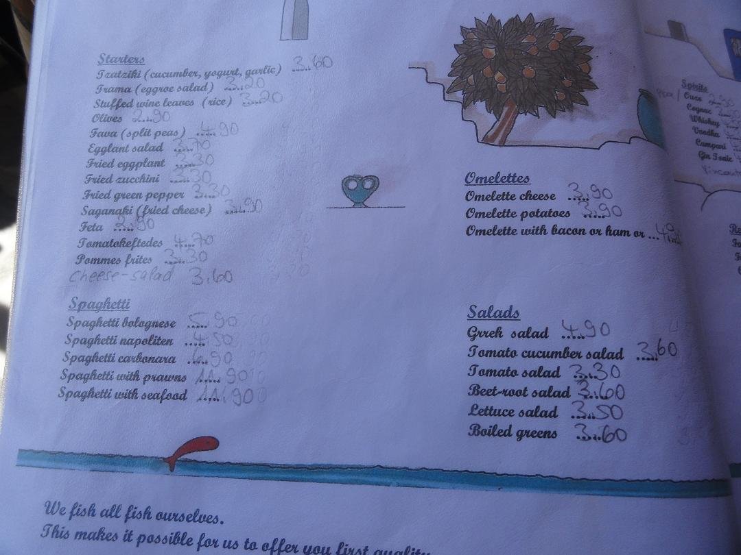 Nog een van de restaurantjes bij het centrale plein van Akrotiri. Hier proberen we de gevulde paprika en tomaat, de tomatenballetjes en ik neem een pizza speciaal. Het eten heeft niet veel smaak en mijn pizza is een echte Griekse pizza met een dikke bodem, nauwelijks tomatensaus, te veel kaas, vettige vleeswaren en daar bovenop champignons uit een blikje en tomaten die niet warm zijn. Het is dat ik honger heb maar ik word er niet echt vrolijk van. Ons oordeel: voldoende, een 6,5 uit 10 |