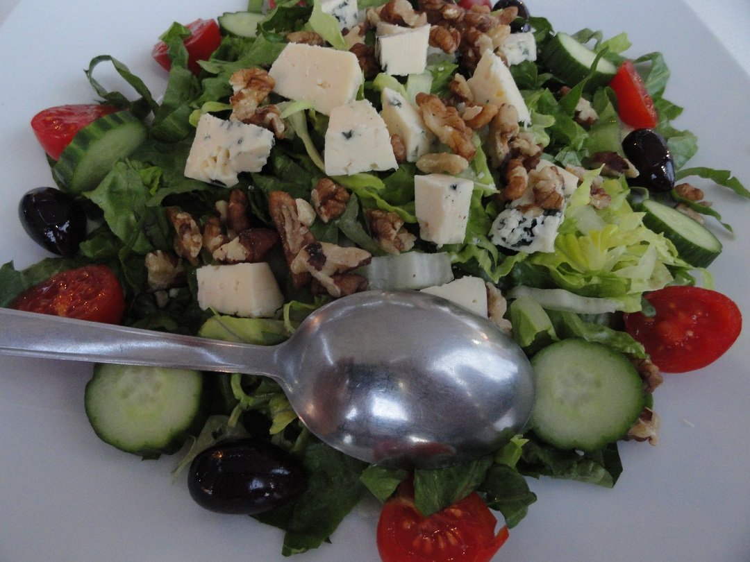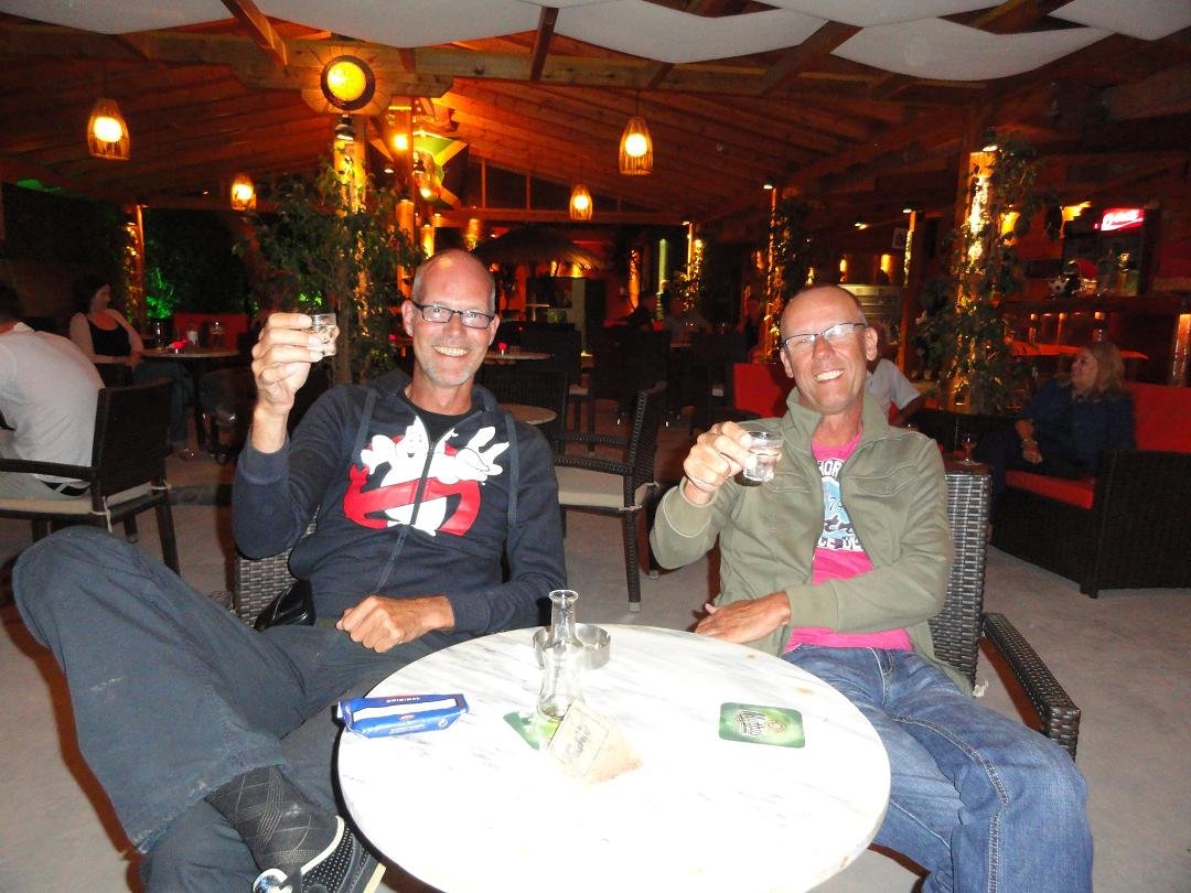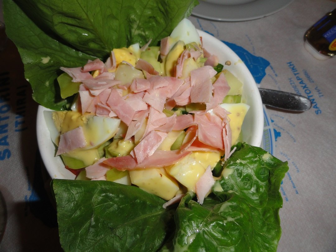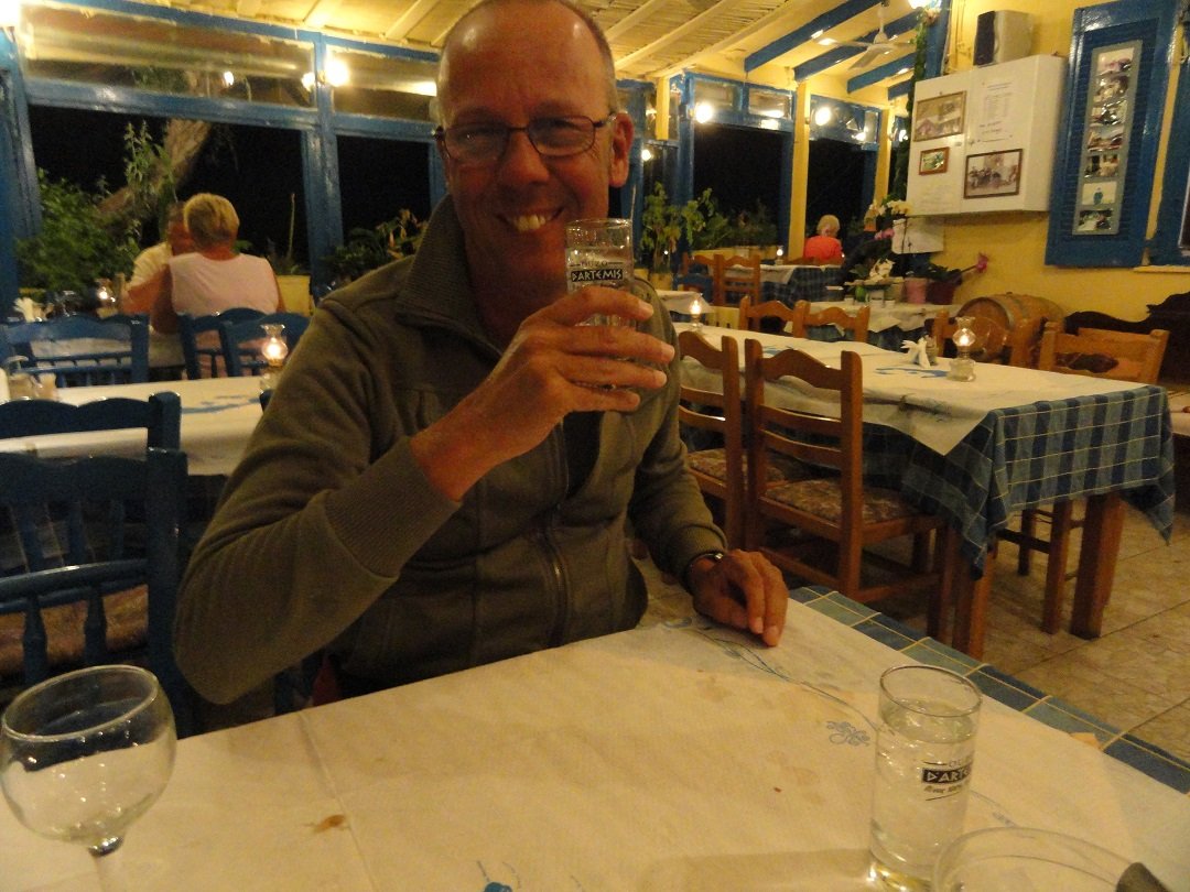 Nog een van de restaurantjes bij het centrale plein van Akrotiri. Hier proberen we de gevulde paprika en tomaat, de tomatenballetjes en ik neem een pizza speciaal. Het eten heeft niet veel smaak en mijn pizza is een echte Griekse pizza met een dikke bodem, nauwelijks tomatensaus, te veel kaas, vettige vleeswaren en daar bovenop champignons uit een blikje en tomaten die niet warm zijn. Het is dat ik honger heb maar ik word er niet echt vrolijk van. Ons oordeel: voldoende, een 6,5 uit 10 |