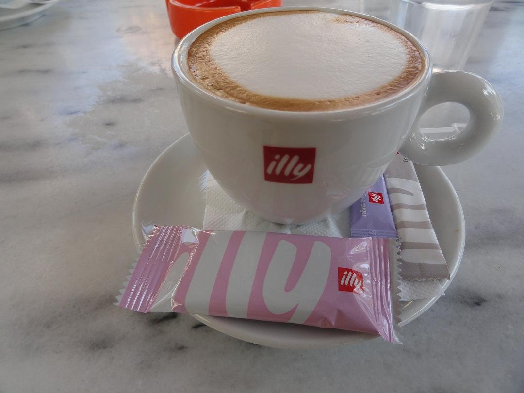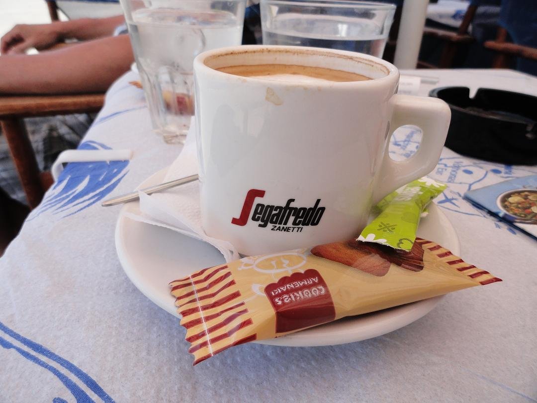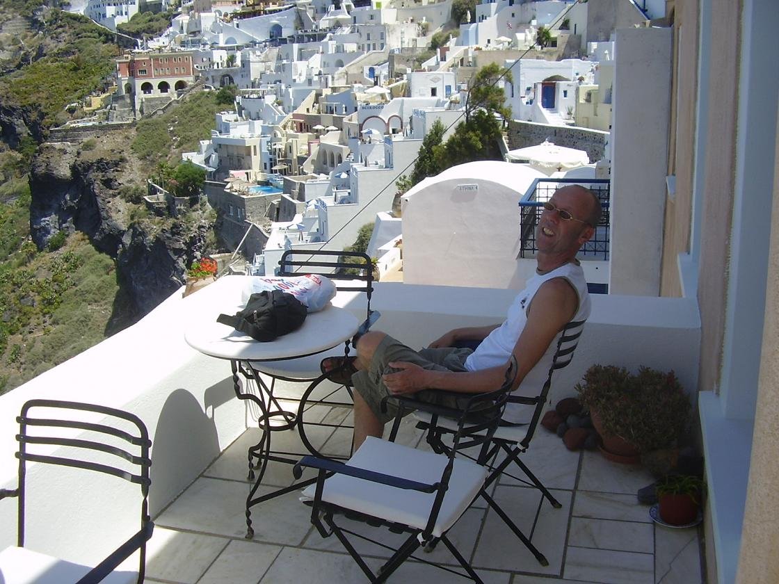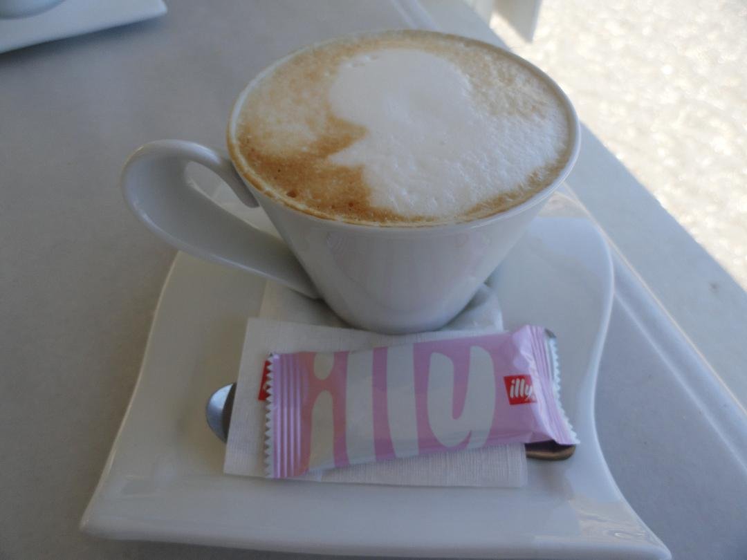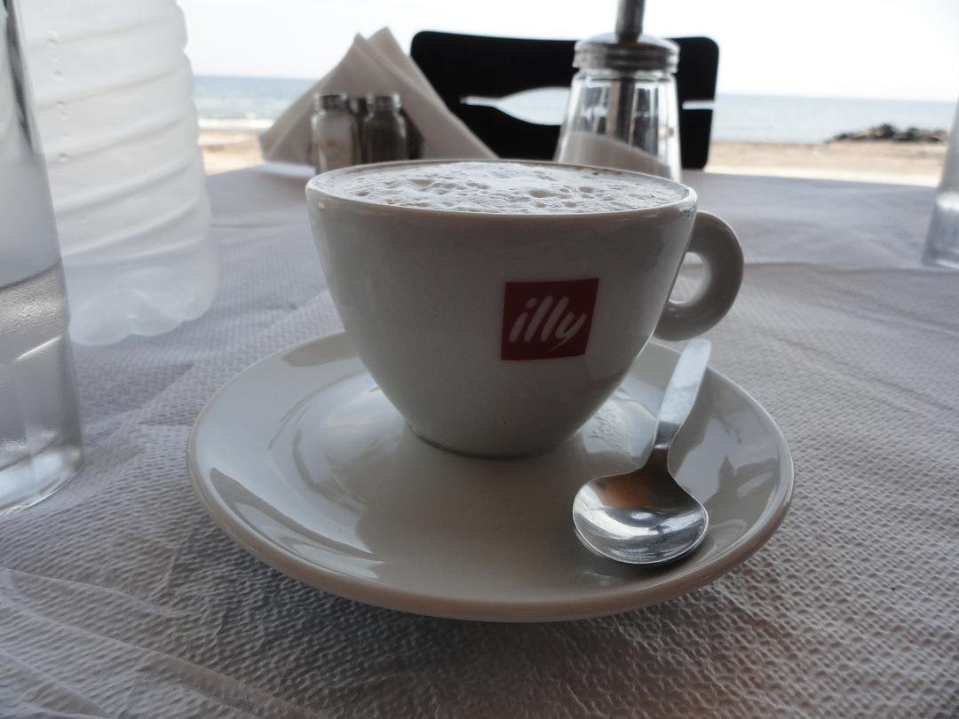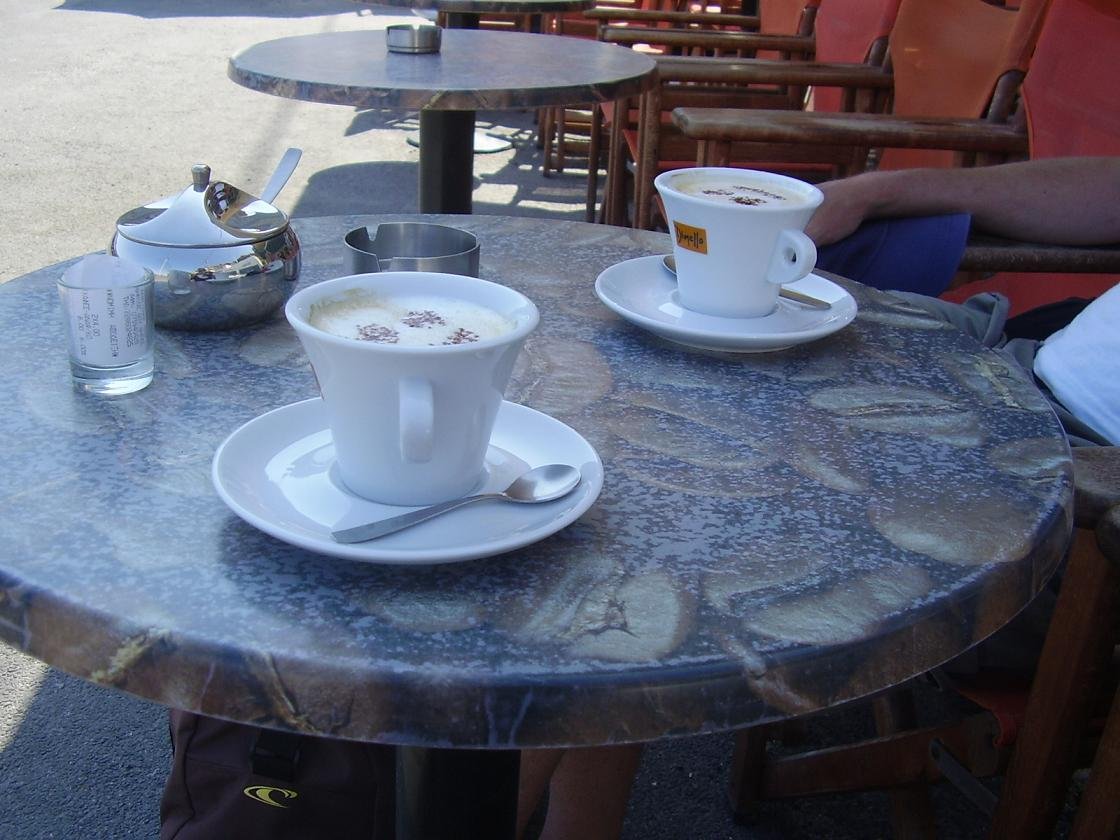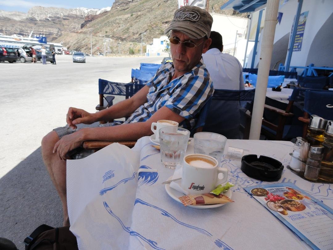Caf� in Fira met een mooi uitzicht over de caldera, gelegen aan de linker (wat rustigere) kant van de klif, niet ver van de grote witte kerk. We bestellen twee cappuccino's, die 4,50 euro per stuk kosten (2009) maar dat zijn normale prijzen op Santorini. De opgeklopte melk is niet warm, de smaak van de koffie is verder goed. Voor een glas water (dat er normaal bij hoort) moeten we vragen. Ons oordeel: redelijk, een 7 uit 10 |