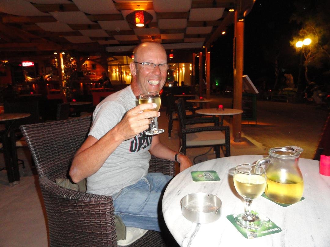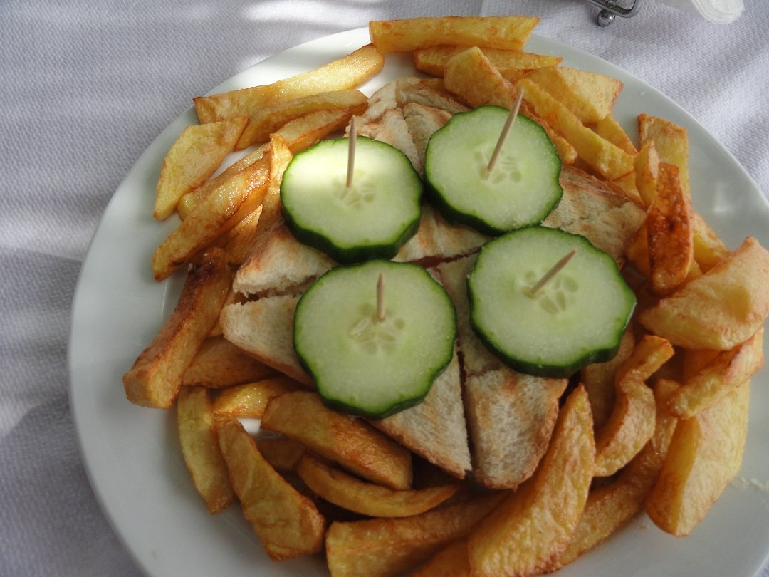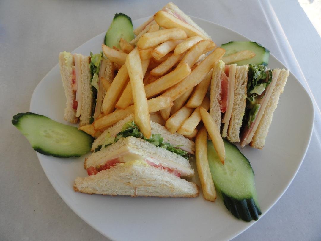 Als je niet kunt koken moet je ook geen restaurant beginnen. Na een lange wandeling nemen wij plaats in deze taverna aan het strand van Kambia want we hebben wel een beetje trek gekregen na alle inspanningen. Het is er ook niet echt goedkoop vergeleken met sommige andere restaurants waar we zijn geweest. We bestellen een club sandwich en een omelette speciaal. Mijn club sandwich zijn een paar geroosterde boterhammen met kaas en tonijn uit blik erop (vreemde combinatie eigenlijk dacht ik naderhand). Daar bovenop liggen 4 schijven komkommer met een prikker erdoor. Echt lekker is het niet en ook de friet is slap. De omelette speciaal is blijkbaar zo slecht dat mijn vriend driekwart ervan laat staan. De bediening is overigens wel erg aardig, maar goed.... Ons oordeel: was het eten maar zo goed als de locatie en het uitzicht, een 5 uit 10 |