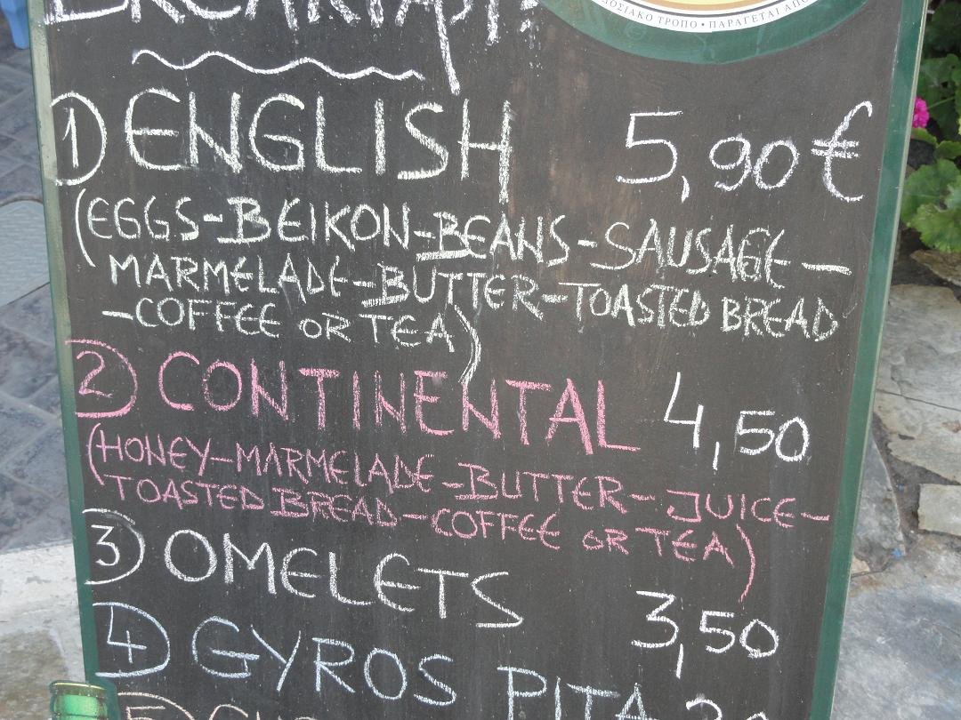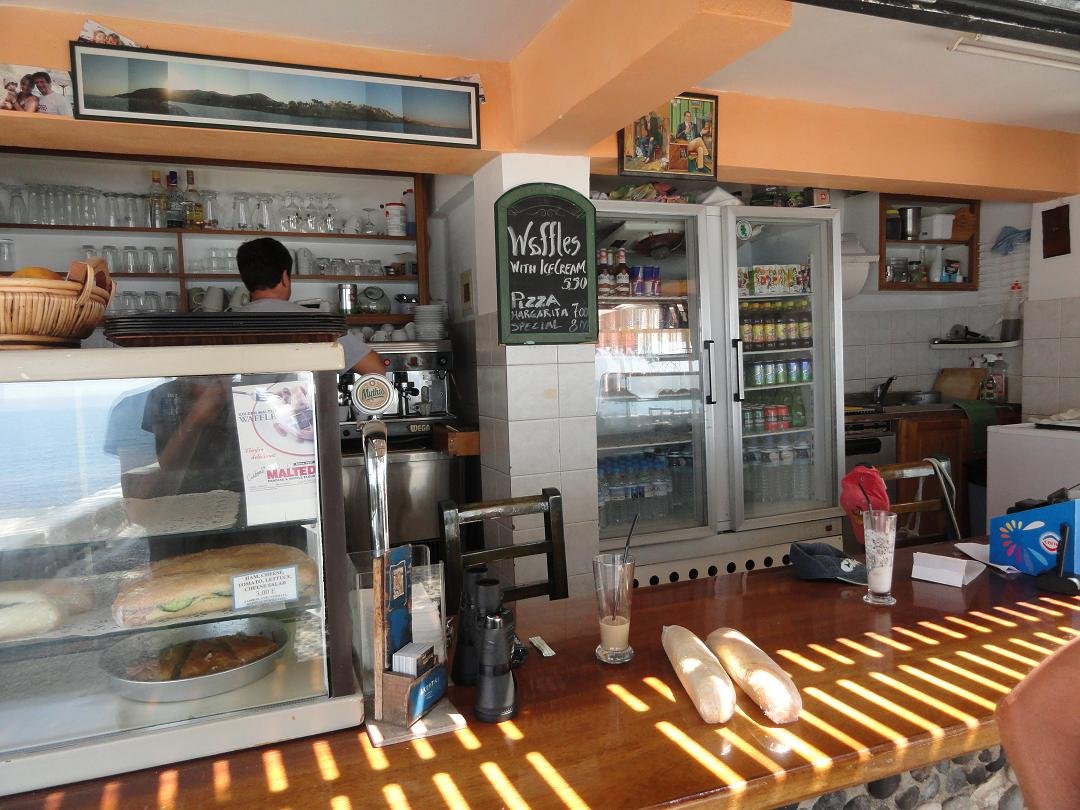 Gelegen op een hoek aan de rechterkant van de hoofdweg als je Perissa in komt rijden. Wij bestellen hier een Engels ontbijt. De koffie is nescafe (daar houden we niet zo van), maar de rest is oke. Er is toast, jam, boter, witte bonen, worstjes, bacon en eieren, tomaten, komkommer en een glas water. Het is allemaal heel goedkoop (5,90 euro in 2011) en niet slecht tegen die prijs. Vriendelijke mensen. Ons oordeel: redelijk tot goed, een 7,5 uit 10 |