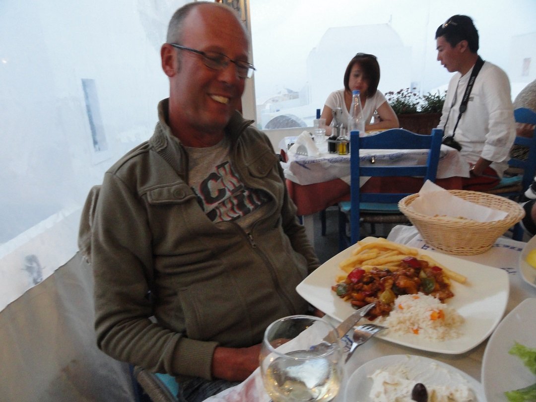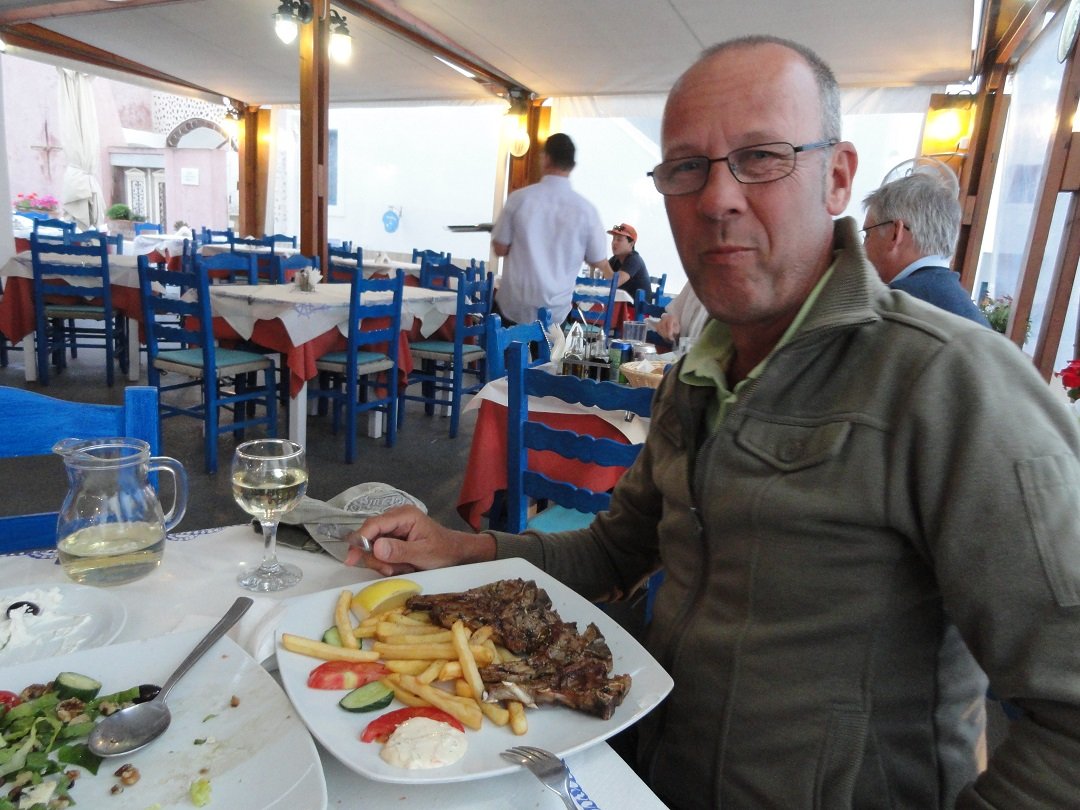 Wij bestellen een Griekse salade, een tzatziki, een pizza tonijn, giros en witte wijn. Het brood dat op de tafel wordt gezet is niet in ��n stuk (en dat zou het moeten zijn om er zeker van te zijn dat het niet al eerder op een ander tafeltje heeft gestaan), maar het is vers en smaakt goed. Veel komkommer en knoflook in de tzatziki, zoals het hoort. De frieten zijn krokant en dat geldt ook voor de bodem van mijn pizza. De pizza is erg groot en met veel tonijn erop: zeer goed. De giros zijn erg zacht en niet droog. Mijn vriend zegt dat hij ze nog nooit zo lekker gegeten heeft. Geen pita brood erbij, maar handgemaakte franse frietjes. Het is duidelijk dat de man die in de keuken staat houdt van koken. Ook tijdens onze tweede en derde verblijf in Oia dat we in 2011 en 2013 weer bezochten hebben we weer bijna elke avond van alles in dit zelfde restaurant geprobeerd. Het ligt dicht bij waar we altijd verblijven (Leandros Suites, waar we al het uitzicht op de caldera hebben). Het was nog steeds goed en met een vriendelijke service en we hebben niet het gevoel dat we een premie betalen voor een uitzicht over de caldera want dat hadden we toch al de hele dag thuis zijn als we dat wilden. Er is een leuke en gezellige Griekse sfeer in het Alkiona restaurant en het is er eigenlijk best druk want het eten is oke. Ons oordeel: erg goed, een 9 uit 10 |