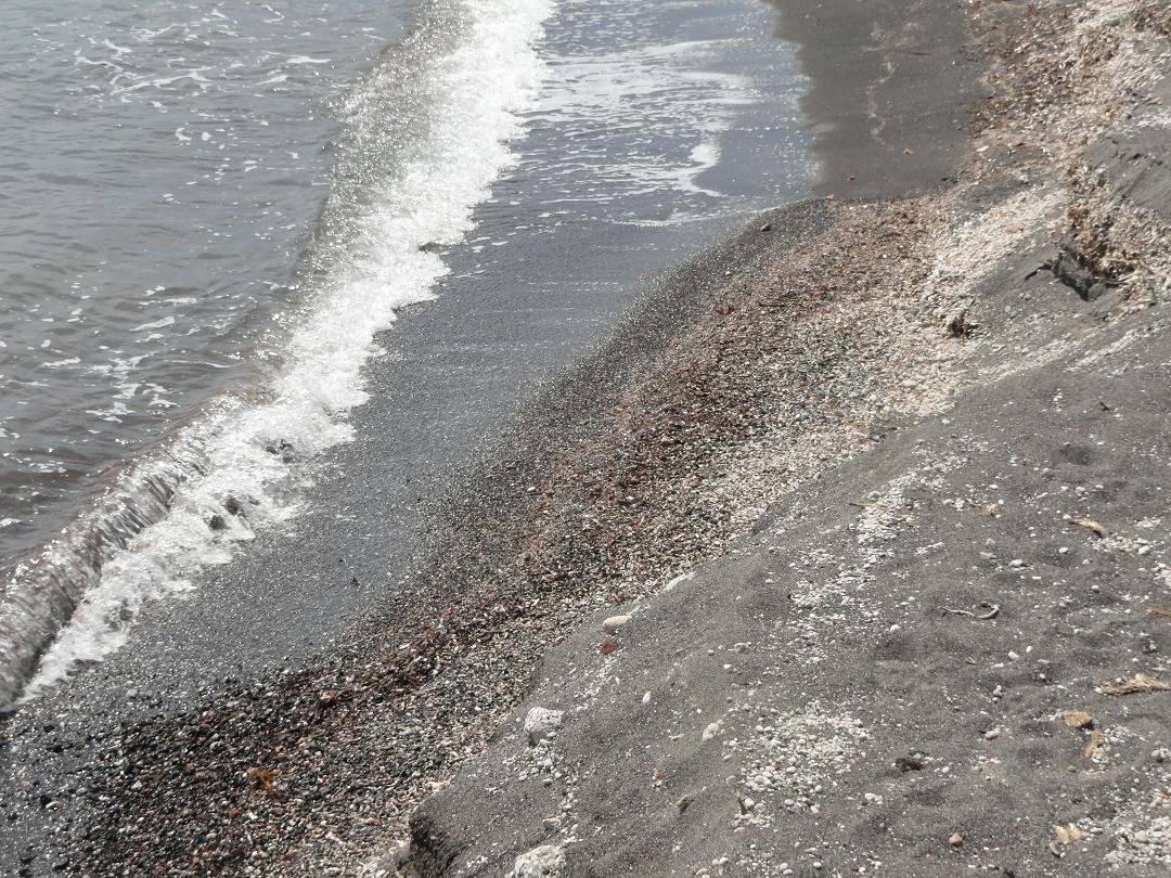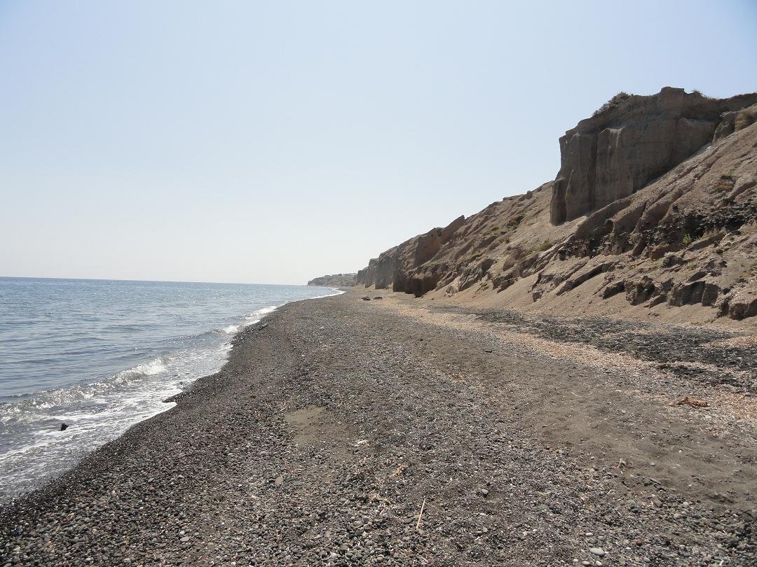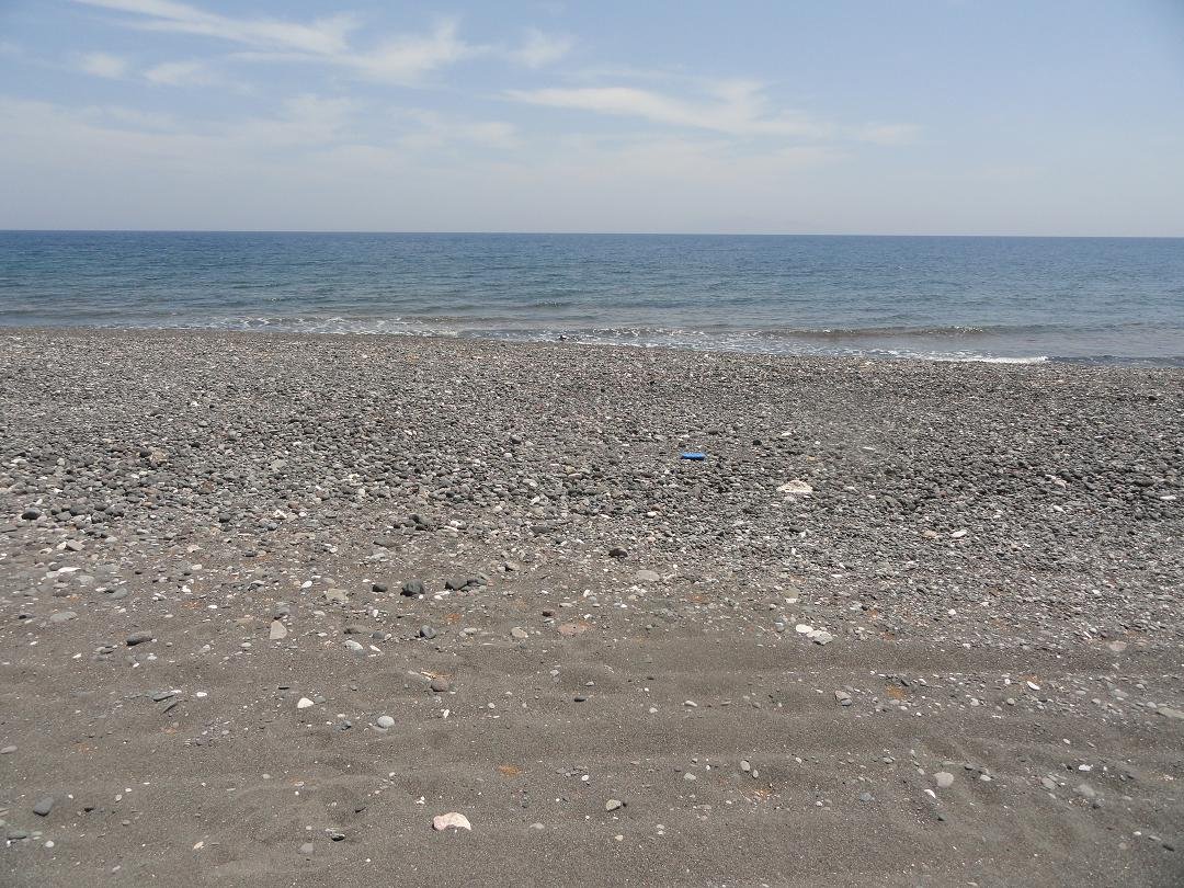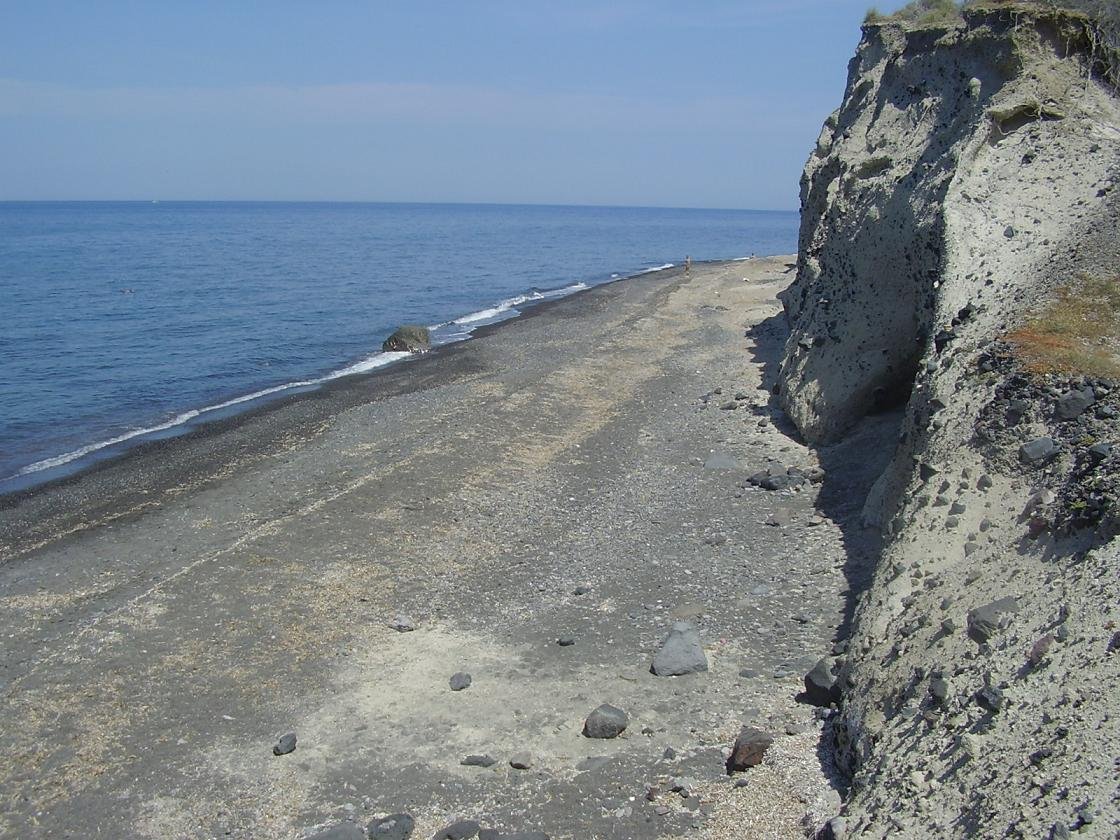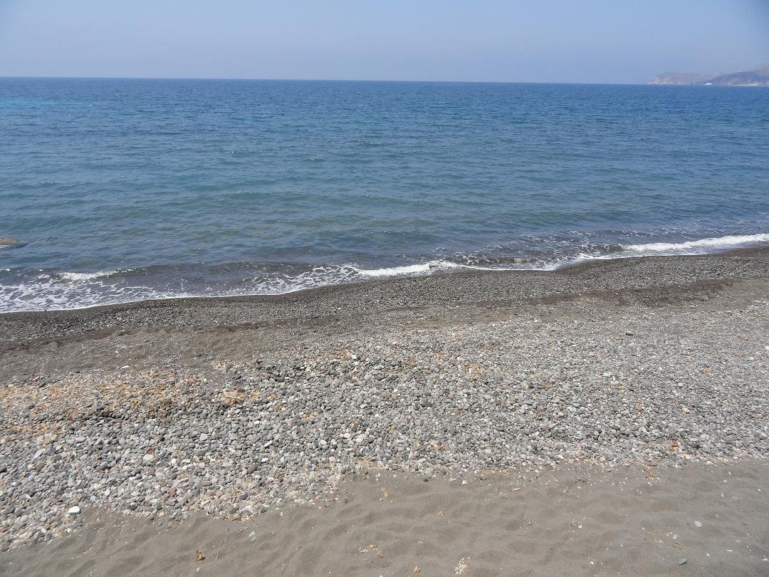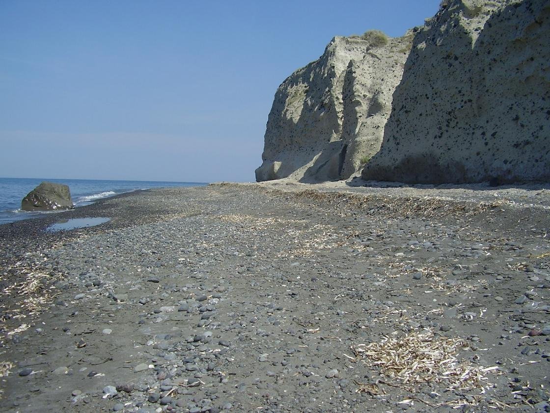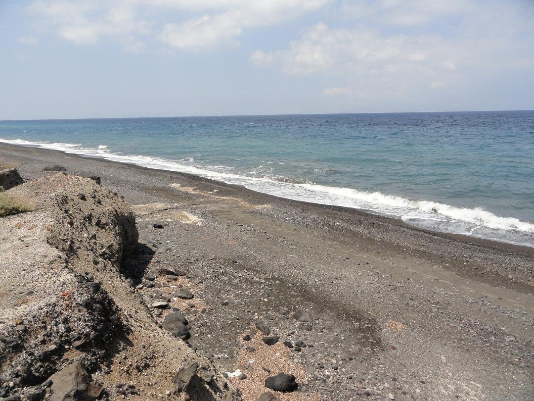 - Paradise Beach - Dit strand ligt aan de oostkant van Santorini, ten noorden van Kouloumpos (Kouloumpos en Paradise zijn eigenlijk ��n heel groot strand verdeeld in twee secties met een eigen naam). Paradise Beach lijkt wat meer kiezeltjes te hebben dan Koulompos en het is er als gevolg hiervan ook wat moeilijker om het water in te gaan. Ten noorden van Paradise Beach ligt Baxedes Beach. De Ege�sche Meltemi wind wil nog wel eens over het strand heenblazen. Op dat soort dagen zijn er ook hoge golven op het strand. Paradise Beach is een lang en rustig zandstrand met weinig faciliteiten (sinds kort toch een paar parasolletjes en ligbedjes etc in het hoogseizoen). De kleur van het zand op Paradise beach is eerder grijs dan zwart. Op de stranden in het noordoosten van het eiland Santorini is het heel erg rustig vergeleken met meer toeristische plekken als Perissa en Kamari. Neem een fles met water mee als je naar het Paradise Beach gaat en vergeet ook je zonnebrandcreme niet. |