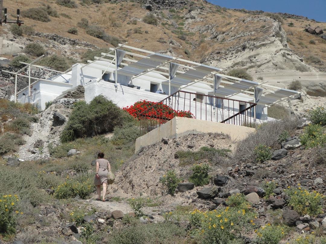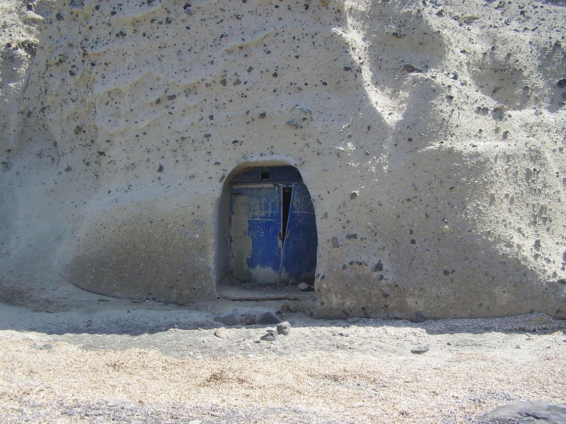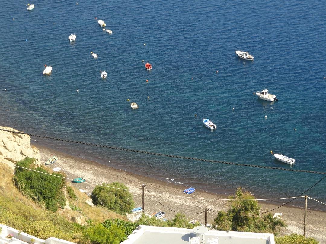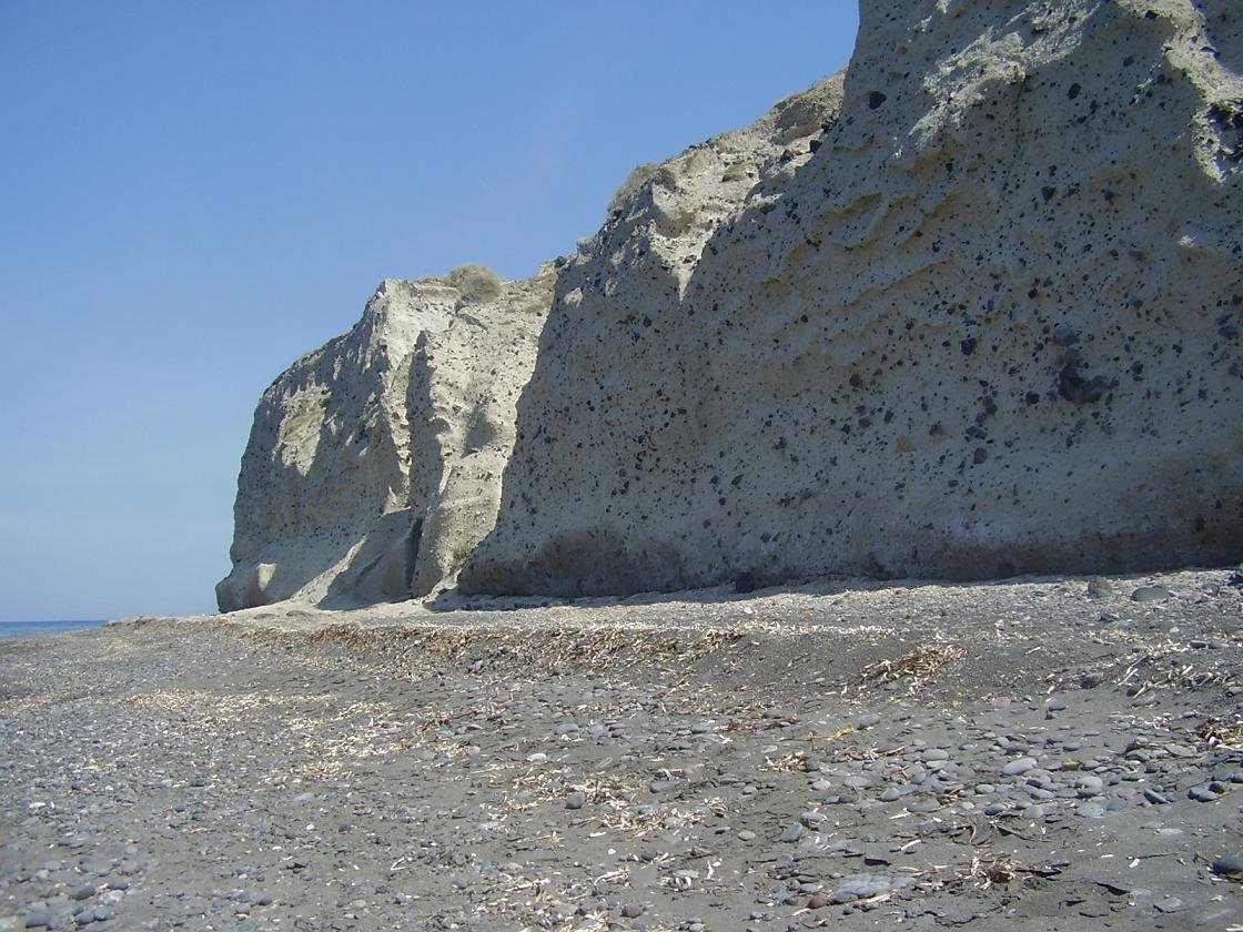 - Mesa Pigadia Beach - Dit strand ligt in het zuidwesten van het eiland op een zijtak van de hoofdweg naar Akrotiri, vlakbij de vuurtoren. Het is te bereiken over een weggetjes (niet geasfalteerd). Je kunt er naartoe lopen maar het is ook mogelijk om er met een goede auto of bijvoorbeeld een quad te komen. De afstand vanaf de hoofdweg is ongeveer een kilometer. Het is hier iets rustiger dan op sommige andere stranden op Santorini omdat het wat meer buiten de route ligt. Het niet al te grote strand bestaat uit zand met (voornamelijk) keitjes maar heeft ook grotere stenen erop en het wordt omgeven door hoge witte kliffen. Er zijn een paar grot-huizen waar gedurende de winter wel eens vissersboten in worden gestald en wat "syrmata", huisjes die geheel of gedeeltelijk in de rotsen zijn uitgehakt. Je kunt ook naar het Mesa Pigadia strand varen met een excursie-bootje vanuit Akrotiri. Op het strand van Mesa Pigadia is ook een taverna. Er zijn zelfs een paar ligbedjes op het strand. wat ons betreft een van de schilderachtigste, meest afgelegen, rustigste en leukste strandjes van Santorini, een van de favorieten. |