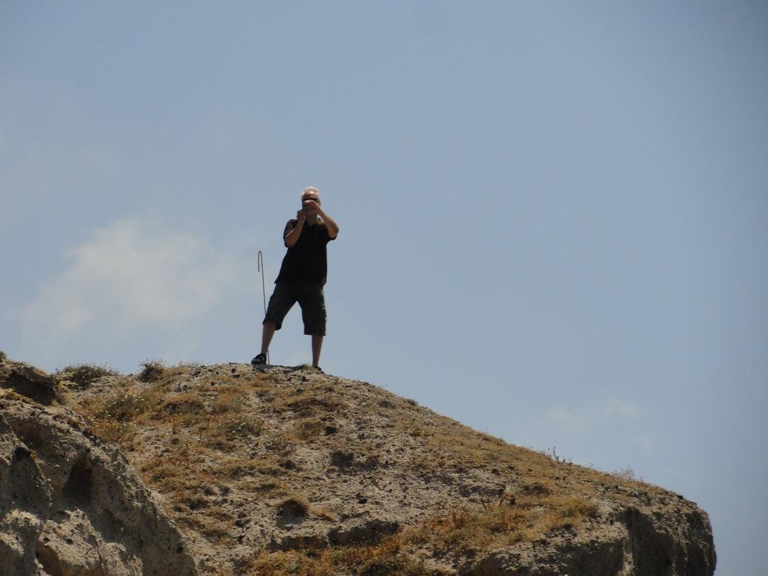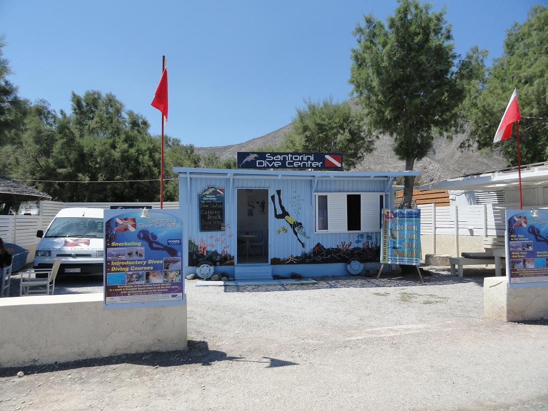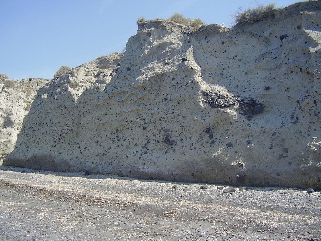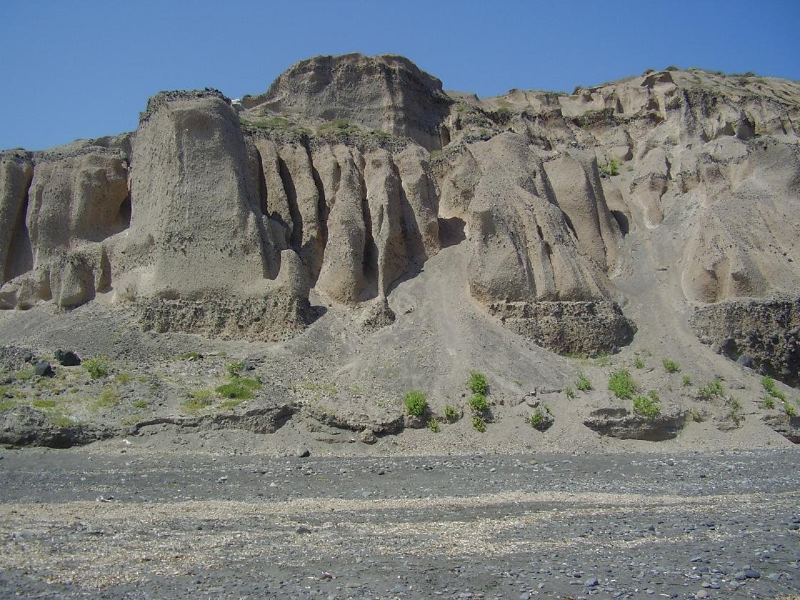 - Mesa Pigadia Beach - Dit strand ligt in het zuidwesten van het eiland op een zijtak van de hoofdweg naar Akrotiri, vlakbij de vuurtoren. Het is te bereiken over een weggetjes (niet geasfalteerd). Je kunt er naartoe lopen maar het is ook mogelijk om er met een goede auto of bijvoorbeeld een quad te komen. De afstand vanaf de hoofdweg is ongeveer een kilometer. Het is hier iets rustiger dan op sommige andere stranden op Santorini omdat het wat meer buiten de route ligt. Het niet al te grote strand bestaat uit zand met (voornamelijk) keitjes maar heeft ook grotere stenen erop en het wordt omgeven door hoge witte kliffen. Er zijn een paar grot-huizen waar gedurende de winter wel eens vissersboten in worden gestald en wat "syrmata", huisjes die geheel of gedeeltelijk in de rotsen zijn uitgehakt. Je kunt ook naar het Mesa Pigadia strand varen met een excursie-bootje vanuit Akrotiri. Op het strand van Mesa Pigadia is ook een taverna. Er zijn zelfs een paar ligbedjes op het strand. wat ons betreft een van de schilderachtigste, meest afgelegen, rustigste en leukste strandjes van Santorini, een van de favorieten. |