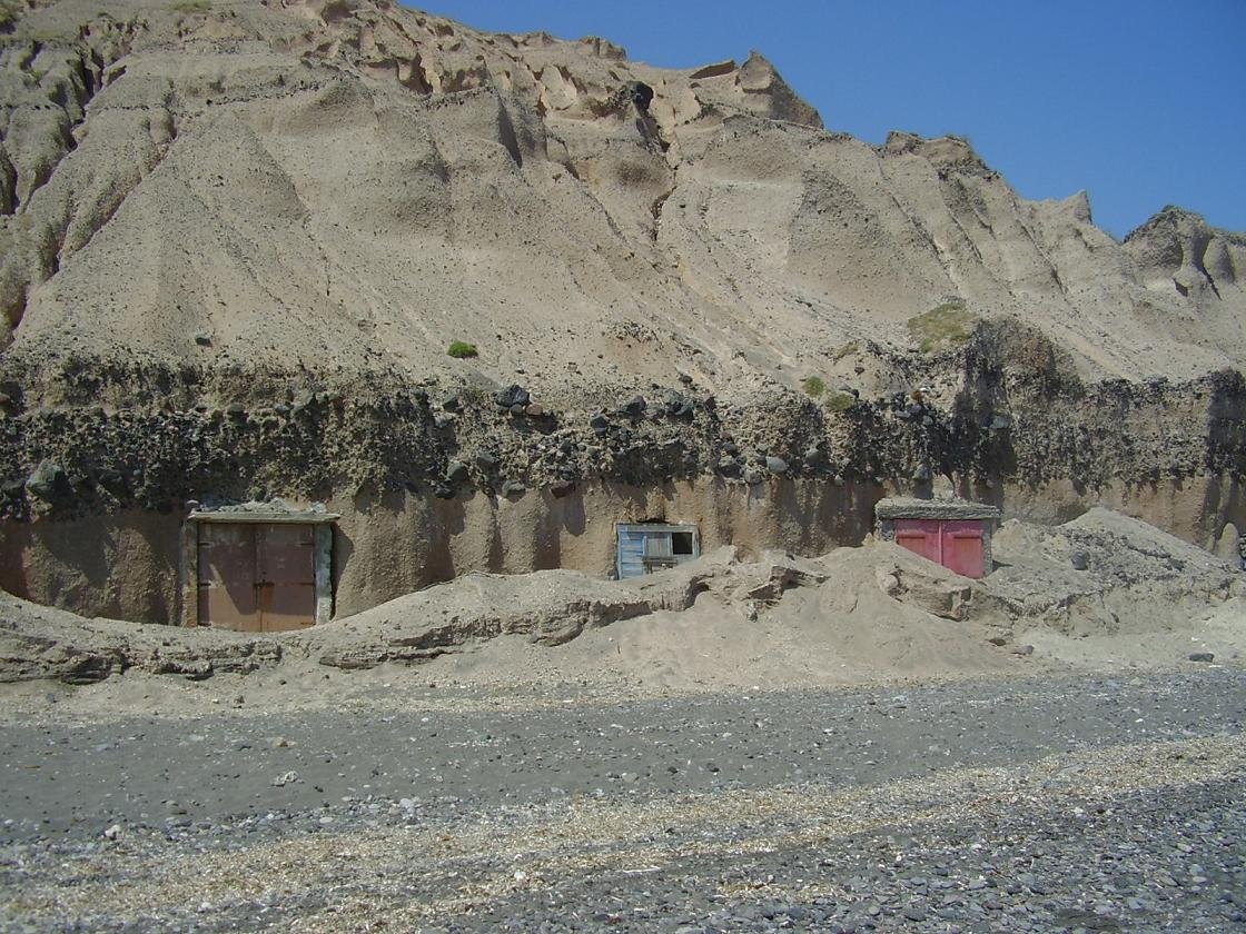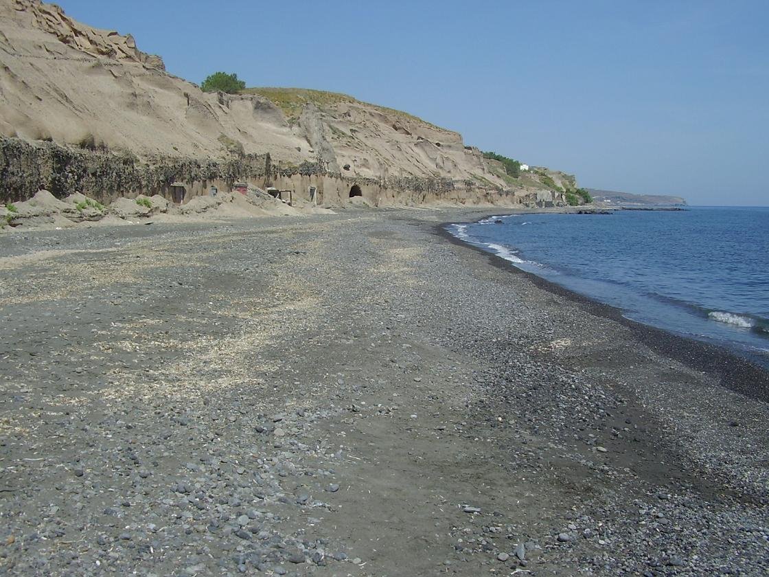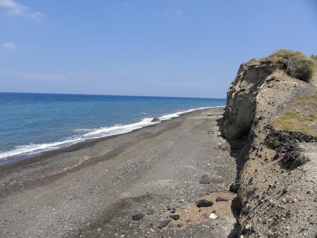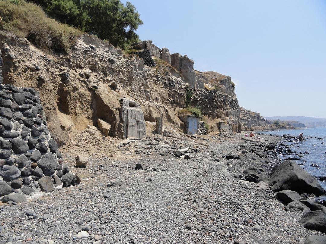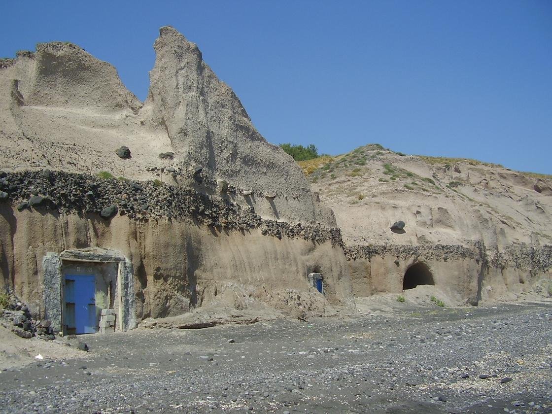 - Karterados Beach en Exo Gialos Beach - De stranden van Karterados / Exo Gialos liggen aan de oostzijde van het eiland Santorini tussen de stranden van Vourvoulos en Monolithos. Het ligt op ongeveer zes kilometer afstand van de hoofdstad Fira en vier kilometer afstand van het dorpje Karterados zelf. Het zijn rustige stranden met zwart zand en kleine kiezeltjes. Bij het strand van Karterados is soms een klein strandtentje geopend en er zijn accommodaties in de buurt. Je kunt het strand bereiken met eigan vervoer maar er is ook een verbinding met een bus. Het is een georganizeerd strand met strandbedjes en parasols die te huur zijn. In Exo Gialos zijn vierkante bergruimtes in de rotsen uitgehakt om vissersboten in op te bergen in de winter. |