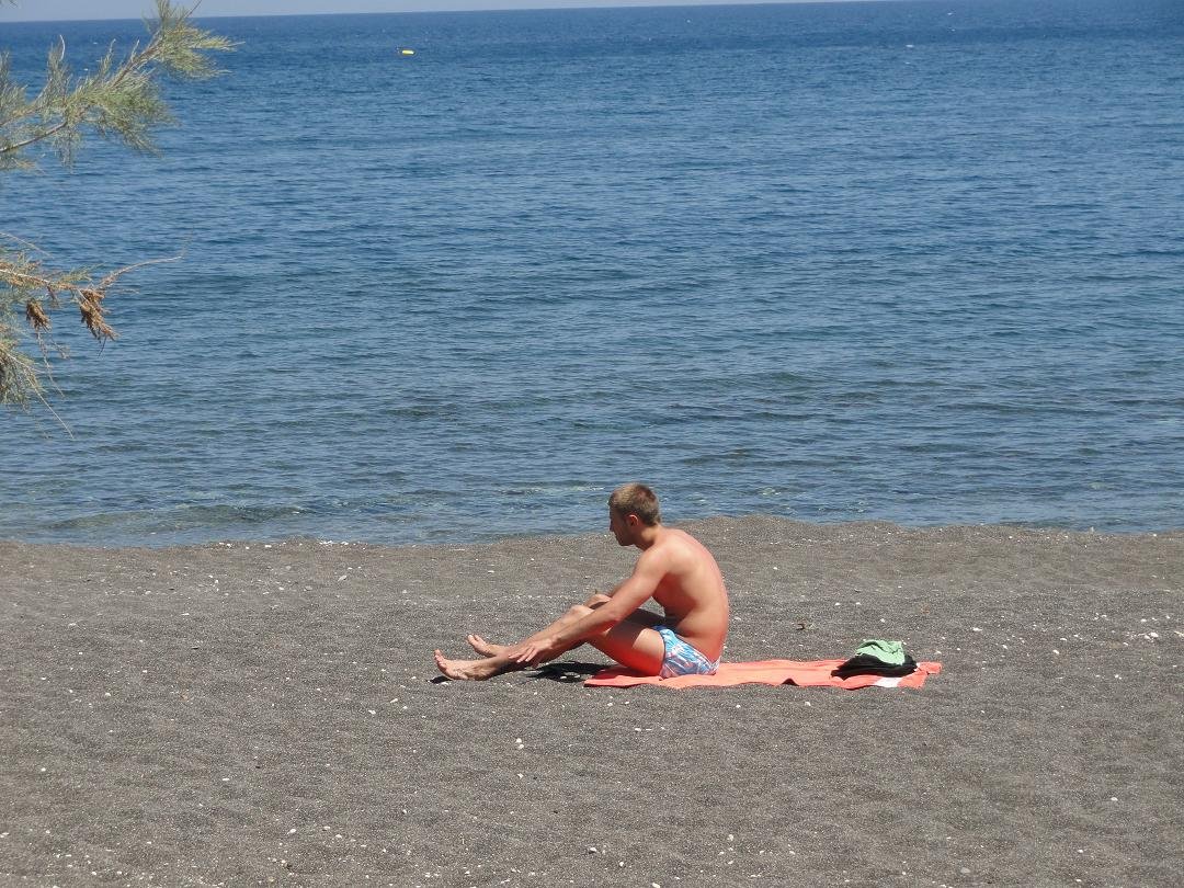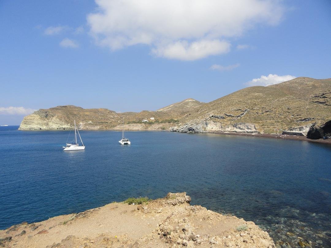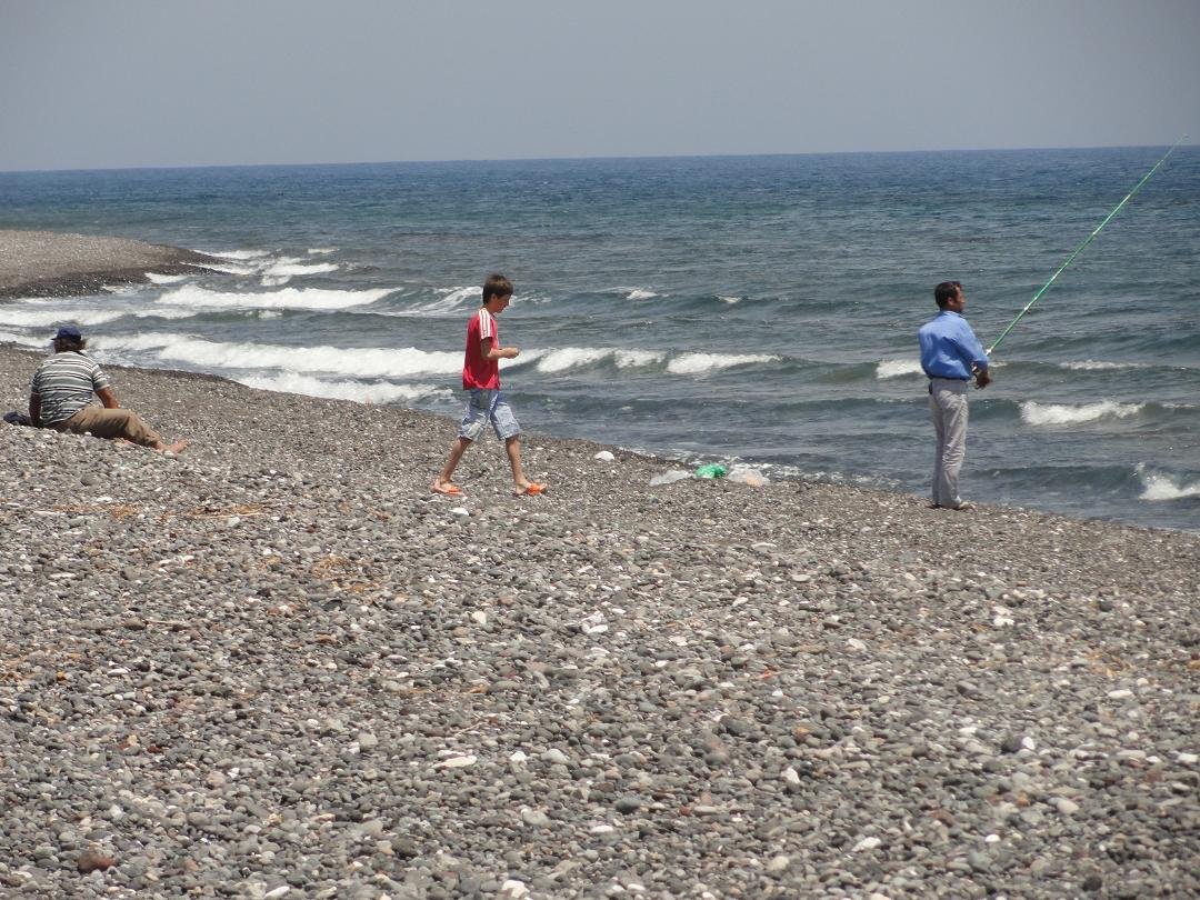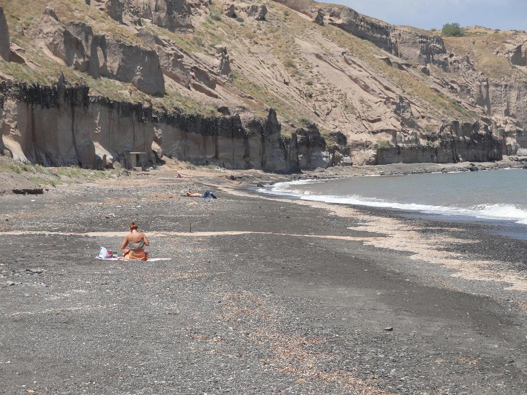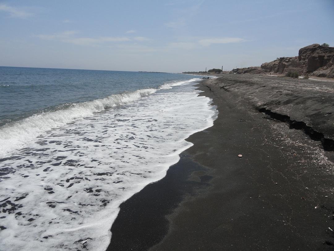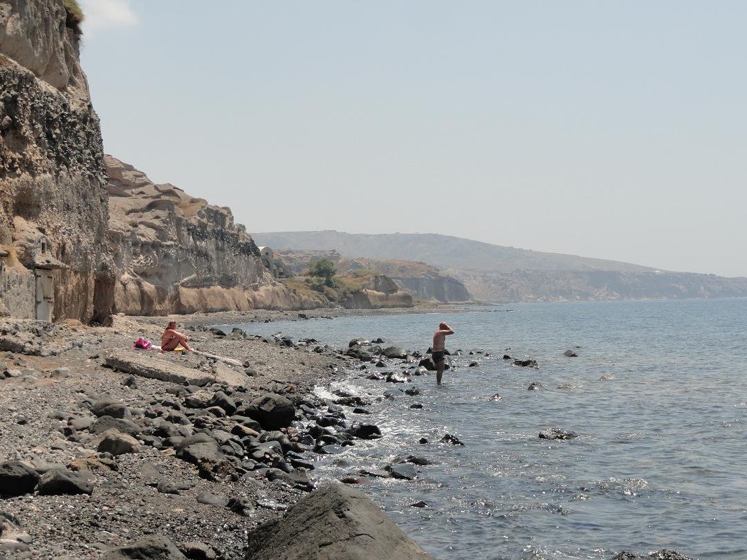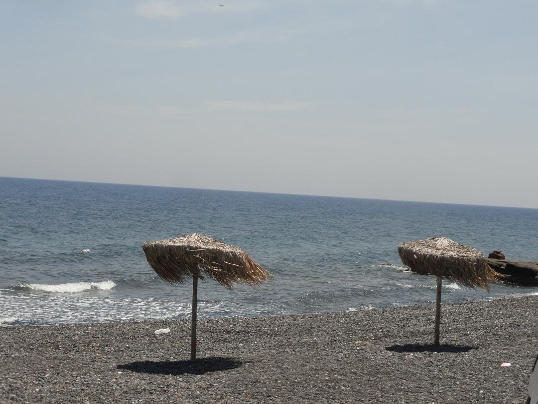 - Vourvoulos Beach - Dit strand ligt in het oosten van het eiland Santorini op 7 kilometer afstand van Fira. Het is een van de minst toeristische stranden van het eiland omdat veel mensen niet van het bestaan afweten. Er zijn strandstoeltjes en parasols (in het hoogseizoen waarschijnlijk, want wij hebben ze niet gezien) en een haventje met taverna's. Rondom het dorp Vourvoulis liggen een aantal stranden. De meest noordelijke is een klein kiezelstrand dat Xiropigado Beach heet. Verder naar het zuiden ligt het smalle Kanaraki Beach met kleine zwarte kiezelsteentjes. Het volgende strand is Exo Gialos waarop een aantal kleine grotten zijn. Op de laatste twee stranden zijn geen faciliteiten. Het laatste strand is het beste strand en heet Katerados Beach. Het is een lang strand met zwart zand en een paar vistaverna's. |