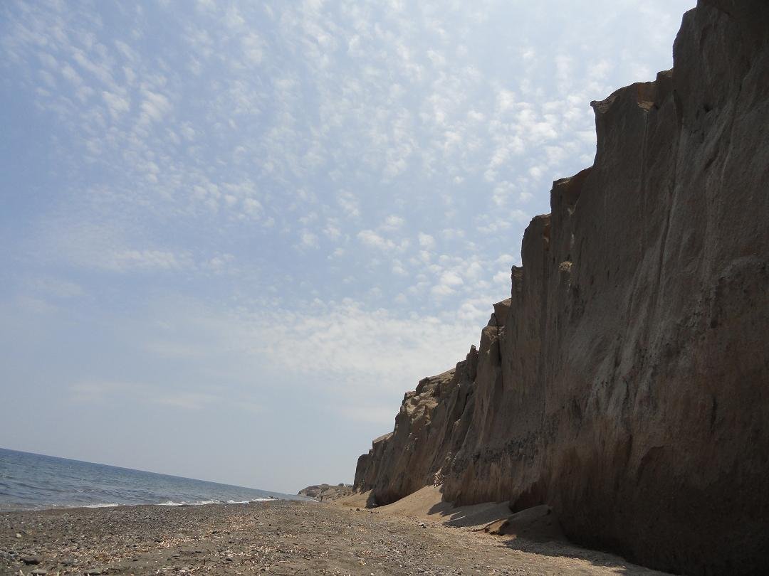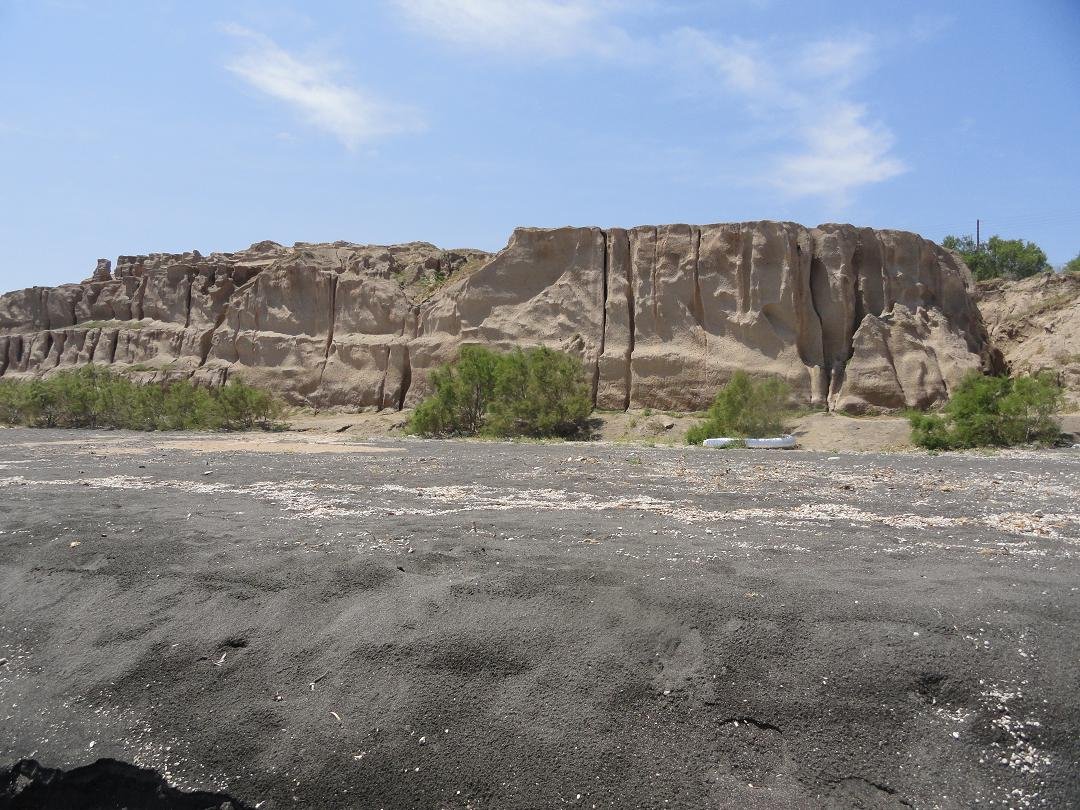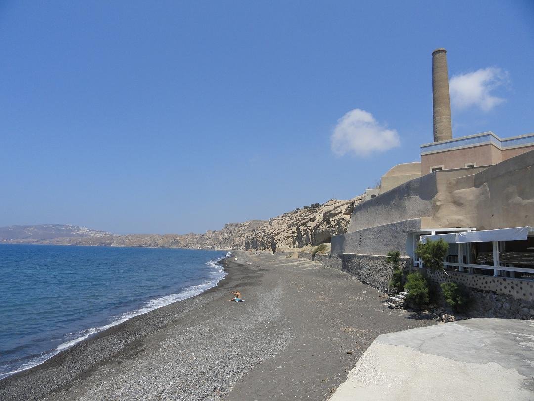 Monolithos Beach - Het strand van Monolithos ligt in de buurt van het vliegveld een stukje ten noorden van Kamari Beach. Op dit stuk in het oosten van het eiland liggen een aantal aardige stranden op een rij. Hier is het veel rustiger. Monolithos beach is een groot zandstrand met maar een paar kleine kiezeltjes. Het zand is zwart en er ligt een beetje aangewaaid zeewier op. Er zijn wat hotels in deze omgeving, maar ondanks dat het strand best aardig is, staat er hier vaak een harde wind. Monolithos Beach heeft fijn zwart zand en loopt geleidelijk af in de zee, dus het is er ook geschikt voor mensen met kleine kinderen. Ook als je de zee ingaat is de bodem van zand (geen kiezels). Monolithos Beach is een georganizeerd strand en er zijn ligbedjes en parasols te huur tijdens het hoogseizoen waarschijnlijk, maar niet toen wij er eind mei waren. Er is taverna bij het strand er zijn mogelijkheden voor het beoefenen van diverse watersporten (waarschijnlijk ook tijdens het hoogseizoen). Eventueel zijn er voor de schaduwliefhebbers die niet meteen een parasol willen huren ook een aantal bomen aan het strand om onder te gaan liggen (maar de schaduw is beperkt want ze zijn klein en eigenlijk meer een soort bosjes). Opvallend zijn de schoorsteenpijpen van een oude tomatenfabriek die vlakbij het strand staat en de hoge kliffen die het strand omringen, die glad zijn gemaakt door de wind. Aan de andere kant van het grote strand ligt het dorpje waar je nog wat meer tavernes en winkeltjes aantreft. Hier is ook een strand en daar zijn wel parasols en ligbedden te huur. |