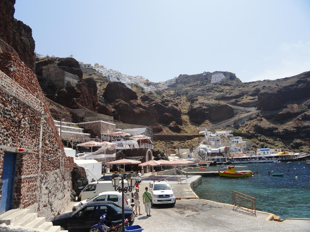 - Amoudi Beach en Armeni Beach - Deze twee stranden zijn twee populaire stranden die beneden bij het dorpje Oia liggen. Amoudi Beach is een van de sfeervolste stranden van het eiland Santorini en is bereikbaar via de trappen (214 brede treden) vanuit Oia. Het ligt aan de voet van hoog oprijzende kliffen en heeft een spektaculair uitzicht over een rots die in het kristalheldere water staat. Amoudi Beach heeft een haventje erbij met visrestaurantjes en kafenions. Beide stranden zijn makkelijk te bereiken vanuit Oia. In het haventje van Amoudi kun je ook het bootje pakken dat je naar het tegenover Santorini gelegen eilandje Thirassia brengt. Armeni Beach is een klein strand dat iets moeilijker te bereiken is dan Amoudi. Voor dit strand moet je 286 treden de trap af naar beneden (op een ezel of lopend). Denk eraan dat je na het afdalen je ook terug moet, dus neem water mee. |