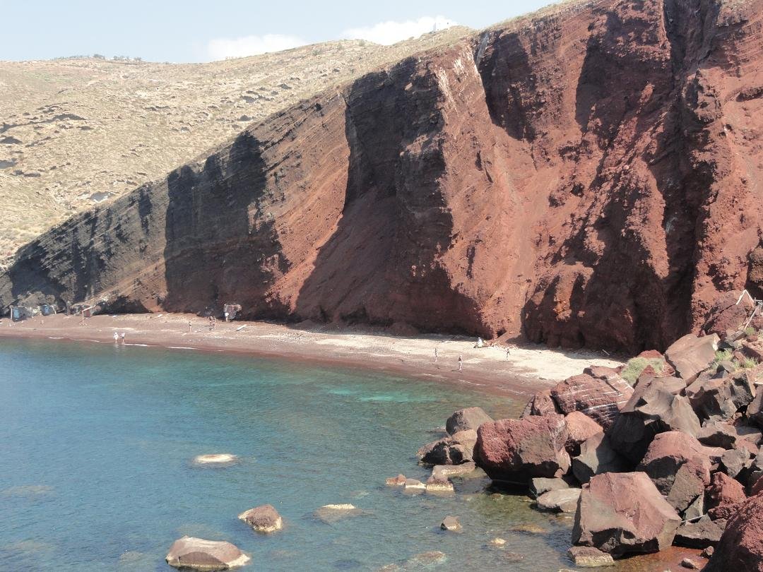 - Red Beach - Nog meer stranden zijn te vinden in bijvoorbeeld het zuiden bij het dorpje Akrotiri (Red Beach en White Beach). Het fotogenieke Red Beach of Kokkini Ammos heeft roodachtig zand en wordt omzoomd door een hoge, steil oprijzende rood met zwarte rots / lava klif. Het strand is niet erg groot dus het kan er snel druk worden. Vanaf Perissa en vanaf Akrotiri varen bootjes naar Red Beach. Van alle mensen die naar Red Beach komen zijn er ook een aantal die er alleen maar een kijkje komen nemen, snel een aantal foto's maken en er dan verder niet blijven. Het strand is min of meer een bezienswaardigheid. Favoriet bij veel mensen omdat het zo mooi is en omdat het niet over-commerci�el is met taverna's. Wel zijn er een paar hotels. Je kunt Red Beach ook bereiken met de auto vanuit Akrotiri en er is een bushalte een beetje verderop bij Akrotiri Beach. Er staat een prachtige kleine kerk tegen de rode rotsen en hier is de parkeerplaats. Om de hoek van de parkeerplaats ligt het strand. Net voor het strand is er een kleine cantina die dranken verkoopt (daarna is er niets meer) en er staan een paar mensen met kleine kraampjes met lokale producten en sieraden. Je loopt over het pad en maak dan een afdaling naar het strand. Red Beach is ongeorganiseerd dus zijn er geen parasols en ligbedden te huur. - White Beach - Naast Red Beach ligt het iets kleinere White Beach of Aspro Paralia dat alleen per boot bereikbaar is (soms wordt gezegd dat je er ook lopend kunt komen maar dan moet je echt een parachute meenemen voor het laatste stuk de klif af). NB: toen ik in 2011 ging kijken weet ik het het eigenlijk niet zeker. Er stonden huizen op de heuvel achter White Beach en het leek alsof er een pad naar beneden liep. Dit strand is een kiezelstrand - en veel van de kiezels zijn behoorlijk groot - en het wordt omzoomd door hoge witte rotsen. Deze twee stranden (Red en White - twee van de befaamdste stranden van Santorini) zijn bereikbaar per kaik (klein Grieks houten bootje) of Red Beach ook te voet vanaf het dorp Akrotiri. De wandeling duurt ongeveer tien minuten (vanaf de parkeerplaats met de kerk maar een paar minuten). De stranden van White Beach en Red Beach liggen niet ver van de ru�nes van de Mino�sche stad en de topattraktie, het antieke Akrotiri, af. |