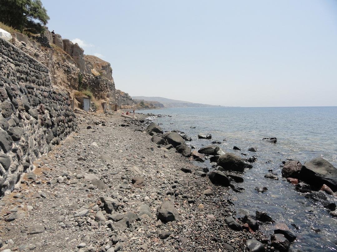 - Akrotiri Beach en Bella Bay - Dit zijn de twee stranden aan de rand van het dorp Akrotiri. Bella Bay lijkt de betere te zijn van de twee. Het is gelegen aan de ingang van het dorp als je aan komt rijden richting de Faros vuurtoren (dus aan de rechterkant van de weg), naast een kleine parkeerplaats waar mensen hun auto kunnen neerzetten om van het adembenemende uitzicht te genieten dat je daar hebt over de vulkaankrater. Het strand is bereikbaar via trappen. Akrotiri Beach kan worden bereikt met de auto en is een beetje verder van het dorp (dicht bij het oude Akrotiri). Het ligt naast Red Beach en White Beach. Het is een lang kiezelstrand met vrij grote kiezels en rotsen. Er is een kleine cantina bij het strand waar je iets te drinken of een eenvoudige snack kunt bestellen. Er is ook een hotel. Naar Akrotiri Beach is een busverbinding. Op het strand zijn ook een paar oude "syrmata", huisjes die in de rots zijn uitgehakt. Zo te zien waren ze bedoeld om boten in op te slaan als het erg slecht weer werd. |