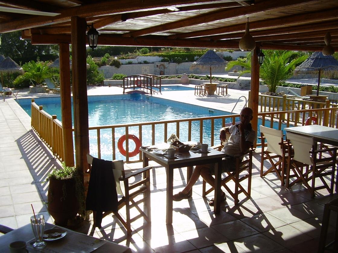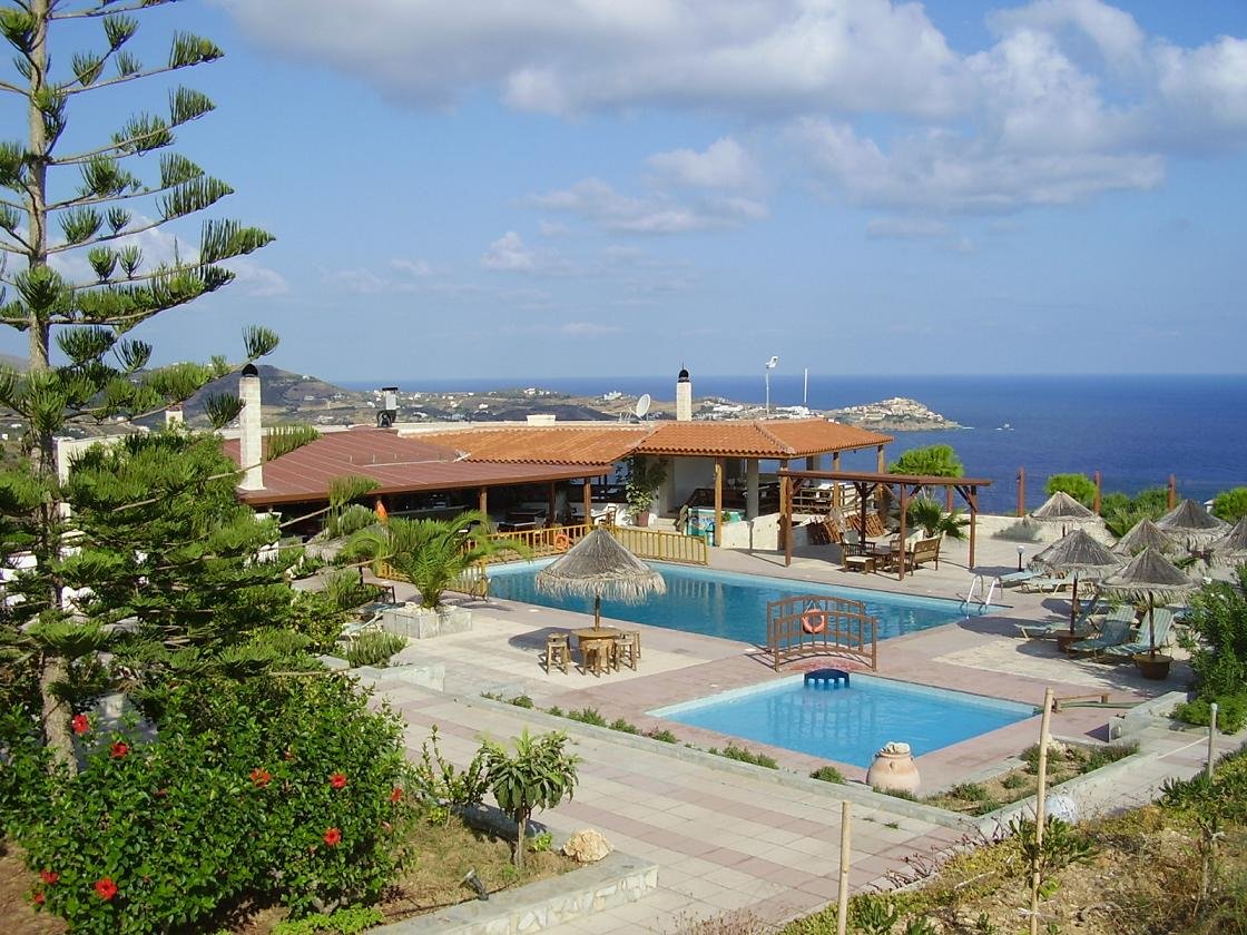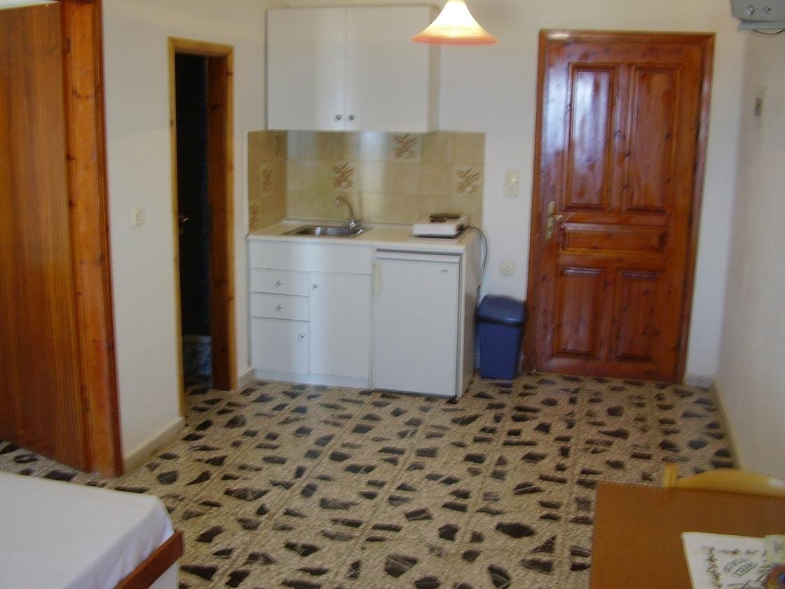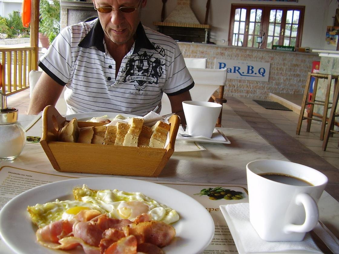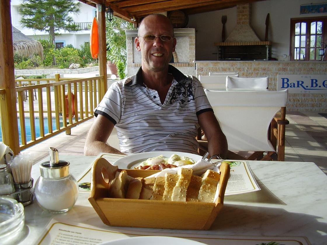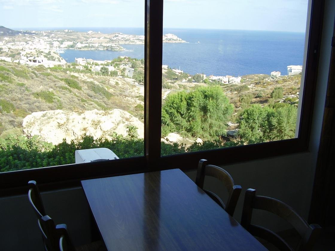 Spiros Soula rents all kinds of studios and apartments with one or two bedrooms. They are quite spacious. All of them have a balcony or terrace facing the sea and actually have one the back as well (the gallery) with a nice view of the mountains and a couple of houses. It's very quiet in terms of traffic (almost nothing). A nice place we think, especialy early or late in the season, with a hospitable and friendly family (two brothers and father and mother) running the accommodation. Everything you need is here (supermarket, restaurant, swimming pool) so if you feel like relaxing much do you just stay here, have a swim and eat something in the restaurant. We had a one bedroom apartment. In the living room there were two extra single beds. There was a kitchenette and a fridge, TV, air conditioning and we actually had two showers:) haha .. Well: it was nice and definitely not expensive. A nice and quiet place for you to get rid of the stress. We thought the restaurant was pretty good (and it's really easy to have it so close to the accommodation), in our opinion the breakfast was a bit on the price (perhaps because we ordered seperate items, the standard breakfast is actually quite cheap) and the evening meal was pretty cheap. You also have the option to get fresh bread in the supermarket in the morning (on the grounds of Spiros Soula at the parking) and boil an egg yourself and make some coffee in the apartment. It's a recommendable place because of the quiet location, the friendly people and the beautiful views. The apartment was fine and somehow it had something homely.