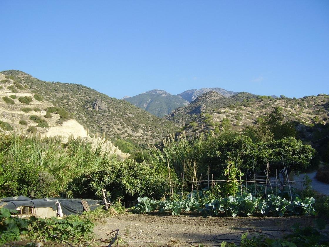Het kleine dorpje Tertsa ligt verscholen achter het Dikti gebergte in een beschermde baai in het zuiden van Kreta, niet ver van het iets bekendere toeristen-plaatsje Mirtos. Het is een heel klein dorpje en het ligt in een vruchtbaar dal waar de meeste mensen nog gewoon leven van de landbouw. Er worden allerlei gewassen verbouwd en hier en daar zie je een kleine kas met plastic erover waar tomaten of andere groentes worden verbouwd. Ook zijn er kassen met bananenbomen. In het dorp wonen dan ook voornamelijk boerengezinnen en een aantal oude vrouwtjes die met regelmaat op en neer lopen op het enige pad in Tertsa dat van de zee het dorp in landinwaarts loopt. Dit maakt het allemaal heel landelijk. Er staan granaatappelbomen langs de weg en er heerst een relaxt sfeertje, eigenlijk alsof er nooit wat aan de hand is: "Als de hemel naar beneden komt vallen hebben we allemaal een blauwe hoed en zien we wel weer verder." Ik vond het erg rustig in het dorpje, alhoewel ik van mensen kreeg te horen dat het zo aan het uitgroeien was. Er wordt inderdaad wel een heel klein beetje bijgebouwd maar het dorp blijft klein en intiem en bovendien is er zoveel strand in en rondom het dorp Tertsa dat het er niet snel te druk zal worden. De mensen die in Tersta wonen en die niet als boer werkzaam zijn doen eigenlijk allemaal iets in het toerisme want er zijn een aantal taverna's / kafenions en er zijn een paar gebouwen waar je een kamer, een studio of een appartement kunt huren. Er is zelfs een piepklein mini-marktje waar je je kont niet kunt keren en dat volgepropt staat met van alles en nog wat (maar ze hebben er wel elke dag vers brood). Wat de mensen in Tertsa ook doen, of ze nou in een restaurant werken of in de supermarkt, en of ze nou aan het einde van de dag tomaten staan te plukken of de hele dag op en neer lopen met een stok in de ene hand en een emmer in de andere, ze zijn allemaal heel vriendelijk. Het zijn er overigens een stuk of 70 (inwoners). |