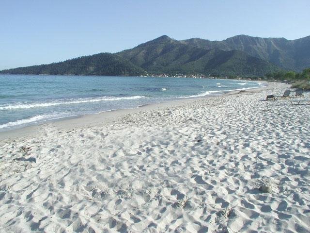 Thassos Beaches: Rossogremos Beach - Rossogremos Beach is situated in the south of the island of Thassos on a 2 kilometer distance of the village of Potos. The Beach is relatively unknown and quiet and a good place for people that don't want to share the sand and the sea with a lot of people. It consists of white sand and it is surrounded by trees for some shade. |