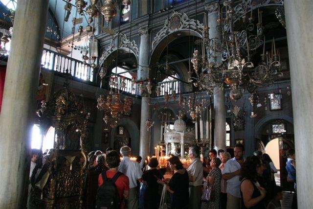 Mountainous Tinos is the spiritual center of modern Greece, and it is sometimes called the Lourdes of the Aegean. The focus of the religious activitities is an icon housed in the church that dominates the town: the Panagia Evangelistria. The icon is a piece of late Byzantine art, which they say originates from a church destroyed by pirats in the 10th century. It is believed to have healing powers. It came to light in 1822 after a nun had a vision and it was dug up miraculously uninjured. The church was then build on the discovery site. The church has a dresscode, but I didn't see it mentioned anywhere, so I walked in in short pants and a t-shirt in order to burn a candle. There is a main road (used also for the processions) and a souvenir road (nice, you can buy 2 metres long candles for christmas!) leading to the church. It's really very beautiful on the inside, and also the courtyard surrounding it and the views are worth a visit. |