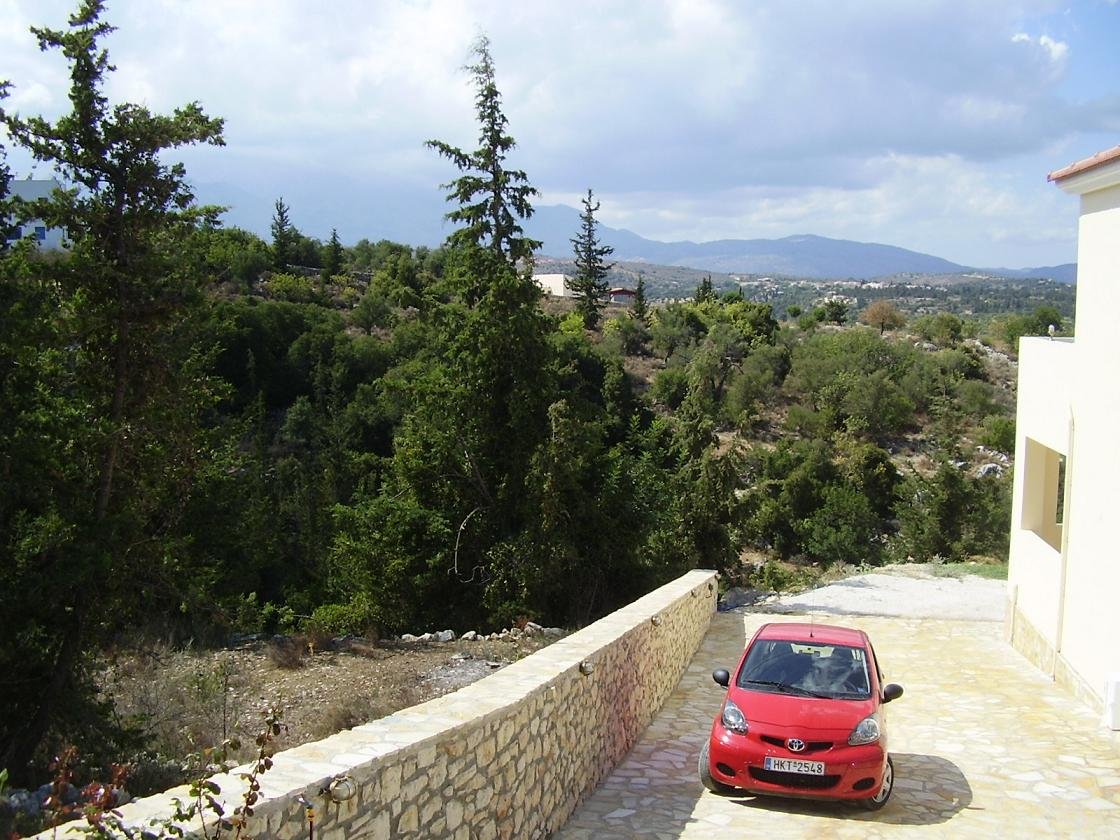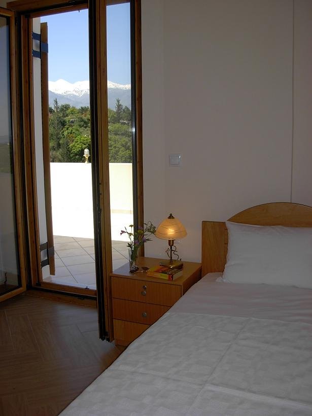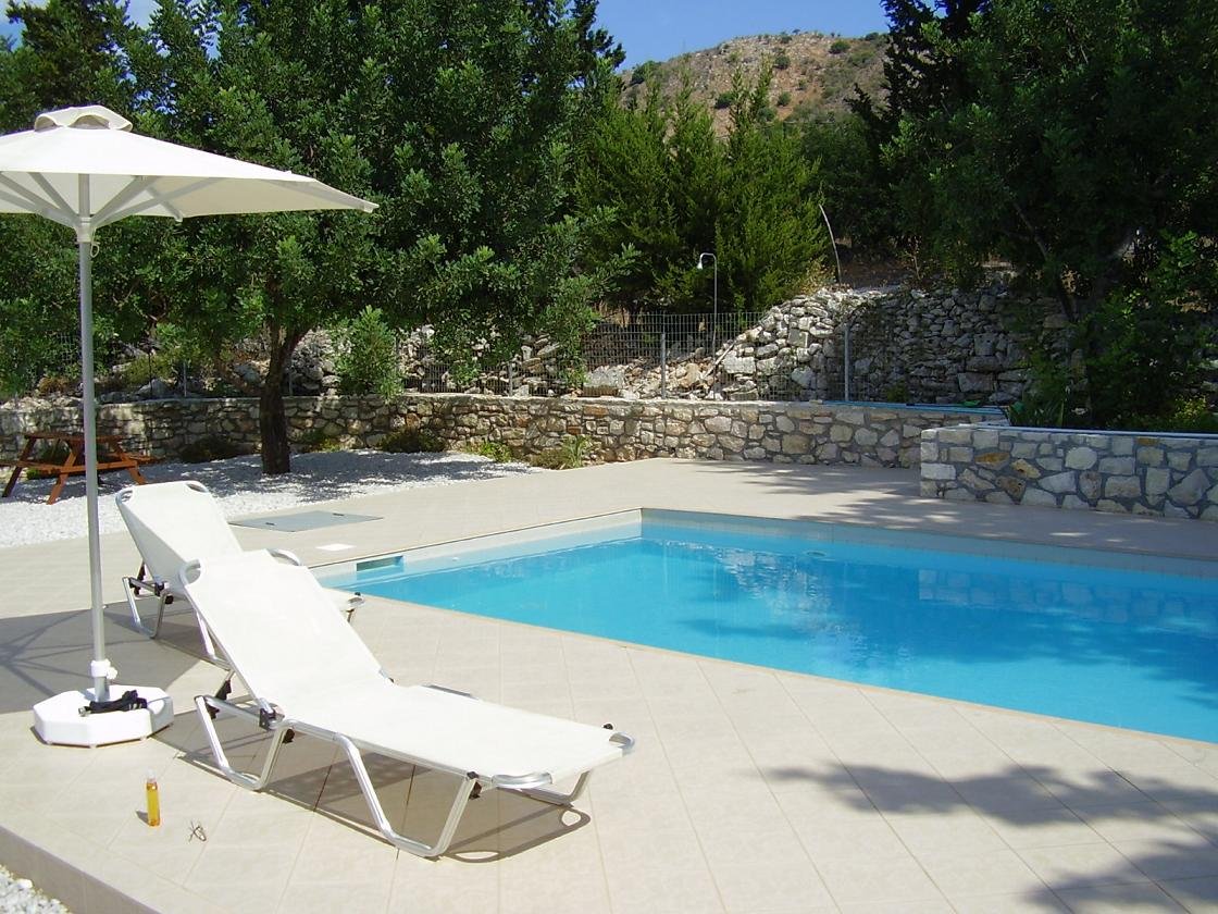 Villa Giorgos is set in a very secluded spot in the middle of a pine tree forest. The villa is situated on the outskirts of Gavalochori and close to the coastal resort of Almyrida. In both villages you can find good taverns, super markets and a bakery. Especially the pastries of the bakery in Almyrida are worth a detour! Villa Giorgos is situated on a hill at the end of short dirt track. The villa has several verandas with a splendid view of the forest that surrounds it and there are distant views of the sea in front of Almyrida (Souda Bay). It's very, very quiet. Behind the villa is the private pool with the sunbeds and the parasols, chairs and tables, a swing and a barbecue. The pool is surrounded by a low wall and pine trees and is not overlooked, so we skinny dipped. There is a simular villa next to villa Giorgos (unfinished in 2010 - no windows). In the future this villa will remain un-occupied unless you choose to rent it for additional guests, thus ensuring your privacy. |