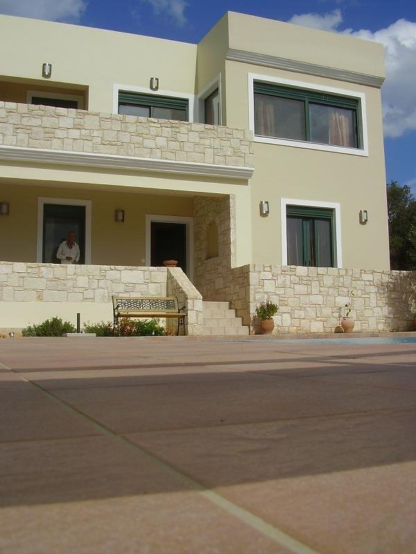 Foto's doen doen deze villa geen recht aan: je moet het zien en ervaren. Een van mijn favorieten ooit. Het is een juweeltje, en ook de perfecte plek in de rust. De mensen van wie het is hebben het zelf gebouwd en ze hebben er iets heel speciaals van gemaakt. We bezochten deze prachtige villa in de Apokoronas in oktober 2008. Hij is bedrieglijk groot: ik schat ongeveer 175 m2. Beneden zijn er drie slaapkamers (2 doubles en een twin). De tweepersoonskamers hebben elk een eigen balkon en de twin heeft een deur die leidt naar de patio aan de voorkant bij het zwembad. De laatste kamer heeft een eigen badkamer met douche en toilet en er is ook een kleine studiehoek in opgenomen. Alle slaapkamers hebben een tv en er is airconditioning. Op de begane grond is tevens een van de meest smaakvolle badkamers die ik ooit gezien heb, met een groot bad, dubbele wastafels, een toilet en een wasmachine. De trap leidt naar de zeer grote woon / eetkamer met een open keuken. Een bijzondere blikvanger in de woonkamer is het met glas bedekte stuk vloer, waar zand, zeeschelpen en stenen uit verschillende plaatsen en eilanden in Griekenland in liggen. Op de bovenste verdieping vindt u ook een extra toilet. De keuken is zeer compleet met een grote koelkast, een vaatwasser, een magnetron, een koffiezetapparaat, een elektrische kookplaat, heet waterkoker, een fornuis en kasten met een heleboel van alles (borden, glazen, vazen, potten en pannen, kopjes koffie en ik vond zelfs een goede tefal koekenpan). Een groot deel van de meubels zoals kasten en de keuken zijn met de hand gemaakt door de eigenaren (Renata en Theodore - Ik heb het straks nog over hen). |