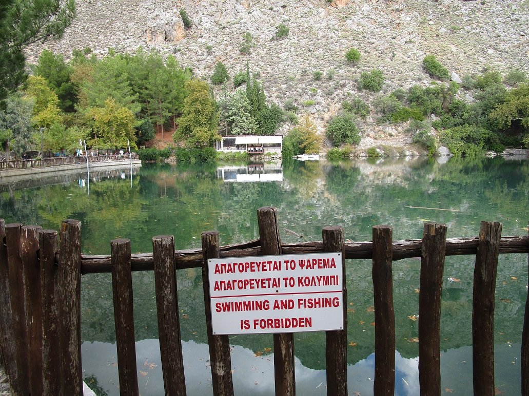 Het dorp Zaros heeft een rijk historisch verleden zoals het Romeinse aquaduct, de traditionele steegjes met antieke architectuur en de versieringen in de kerken. Het dorp is bekend voor het mooie meer en de lokale viskwekerij waar u kunt genieten van de smaak van verse forellen. Je kunt het meer bereiken via een afslag net voor Zaros als je vanaf het westen komt uit de richting van Vorizia of net na het dorp Zaros als je vanuit het oosten komt vanaf Agia Varvara. Het laatste stukje gaat over een ongeplaveide weg die je kunt lopen of met de auto kunt doen. Aan het einde bij het meer is een grote parkeerplaats. Het meer van Zaros met zijn diepe blauwgroene kleur maakt meer de indruk alsop het in de Zwitserse Alpen thuishoort en het wordt omgeven door weelderige begroeiing en hoge bomen. Het is een verzamelpunt voor de Griekse families voor een dagje uit en een etentje in een van de taverna's die bij het meer liggen. Ik zag ook een excursiebus het parkeerterrein op komen rijden. Aanbevelenswaardig schijnt een bezoek aan caf�-taverne "Vegera" in het dorpscentrum van Zaros te zijn. Je kunt er proeven van de traditionele Kretenzische keuken met huisgemaakte wijn en raki. |