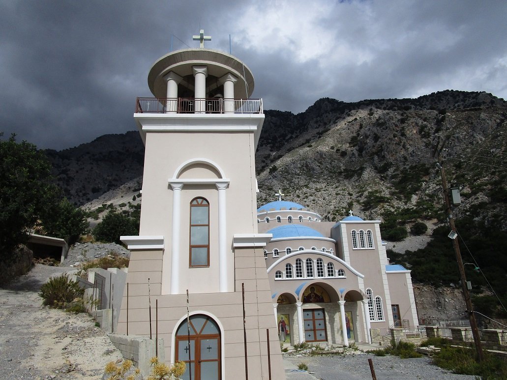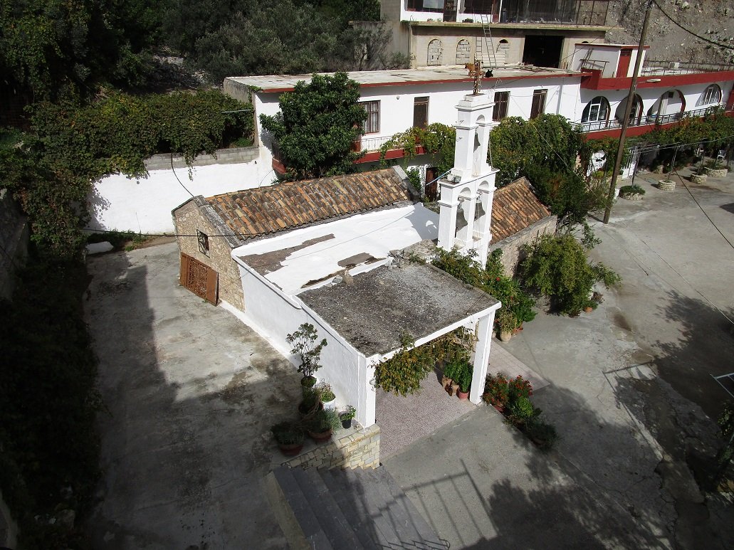 Oorspronkelijk was het klooster een soort dependance van het nabijgelegen Varsamonero klooster en het werd uiteindelijk verlaten. Nu is het grootste gedeelte van het Agios Nikolaos klooster een moderne aangelegenheid. Het is heel groot en de verf was in 2017 nog niet opgedroogd. Er waren ook nog stukken die nog niet af waren gebouwd, dus het klooster wordt nog groter. Het klooster van Agios Nikolaos heeft een grote en een aantal kleinere blauwe koepels en hij is versierd met mooie mozaieken. De klokkentoren staat los en is voorzien van een aantal klokken en een lichtblauwe koepel die op pilaren staat.