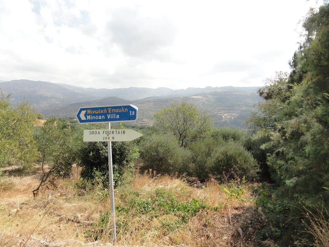 Voor de fontein moest je rechtdoor lopen, maar we zijn geen andere bordjes meer tegengekomen en we hebben geen fontein kunnen ontdekken. Voor de Mino�sche villa moet je volgens het bord meteen linksaf en dan zou hij op 1.8 kilometer afstand van het dorp moeten liggen. Het weggetje waar je overheen moet rijden is smal en niet al te best, maar hij is wel geasfalteerd. Na ongeveer een kilometer houdt hij op en wordt het een pad. Er staat een bord dat zegt dat de villa nog 0.5 kilometer verderop ligt, maar als je tien passen doet kom je bij een splitsing en is hij blijkbaar ineens 200 meter verderop gezet, want nu is het 700 meter lopen. Wij zijn het pad afgelopen, maar behalve blaffende honden en olijfbomen hebben we niets gezien. Het pad houdt na 200 meter op en er is niets te zien, ook geen bordje of een andere aanwijzing. Er staan alleen nog maar olijfbomen.